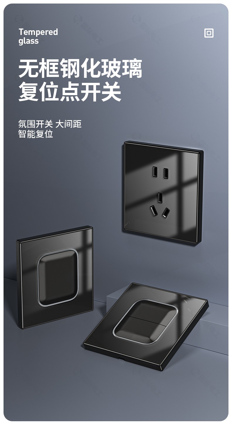 无框钢化玻璃复位点开关 氛围开关 大间距智能复位 6大核心技术 LED 氛围灯 复位点开关 钢化玻璃 儿童保护门 插座大间距 3C 认证