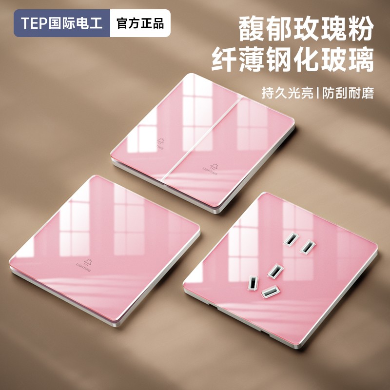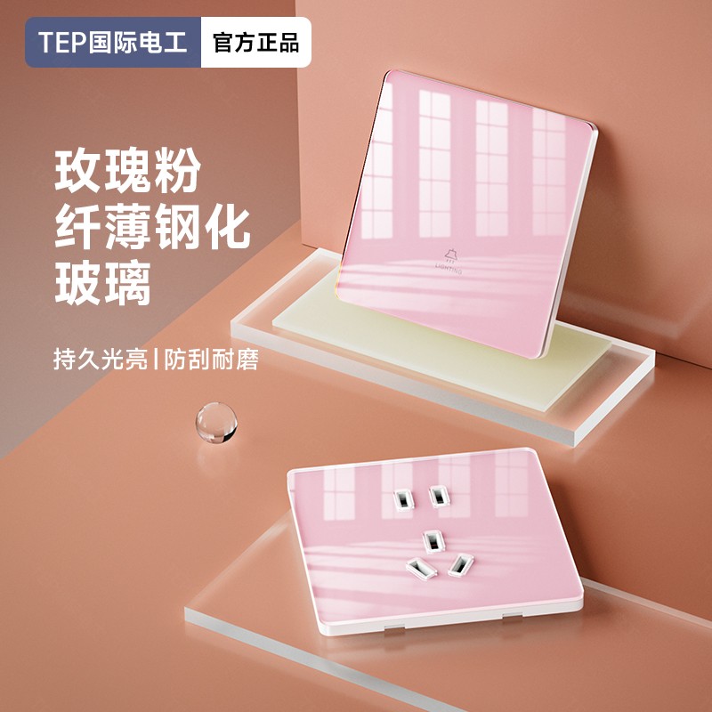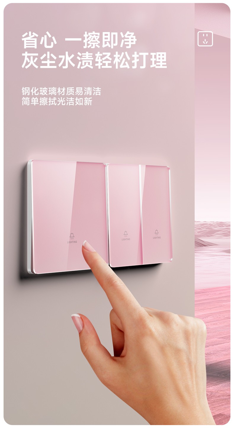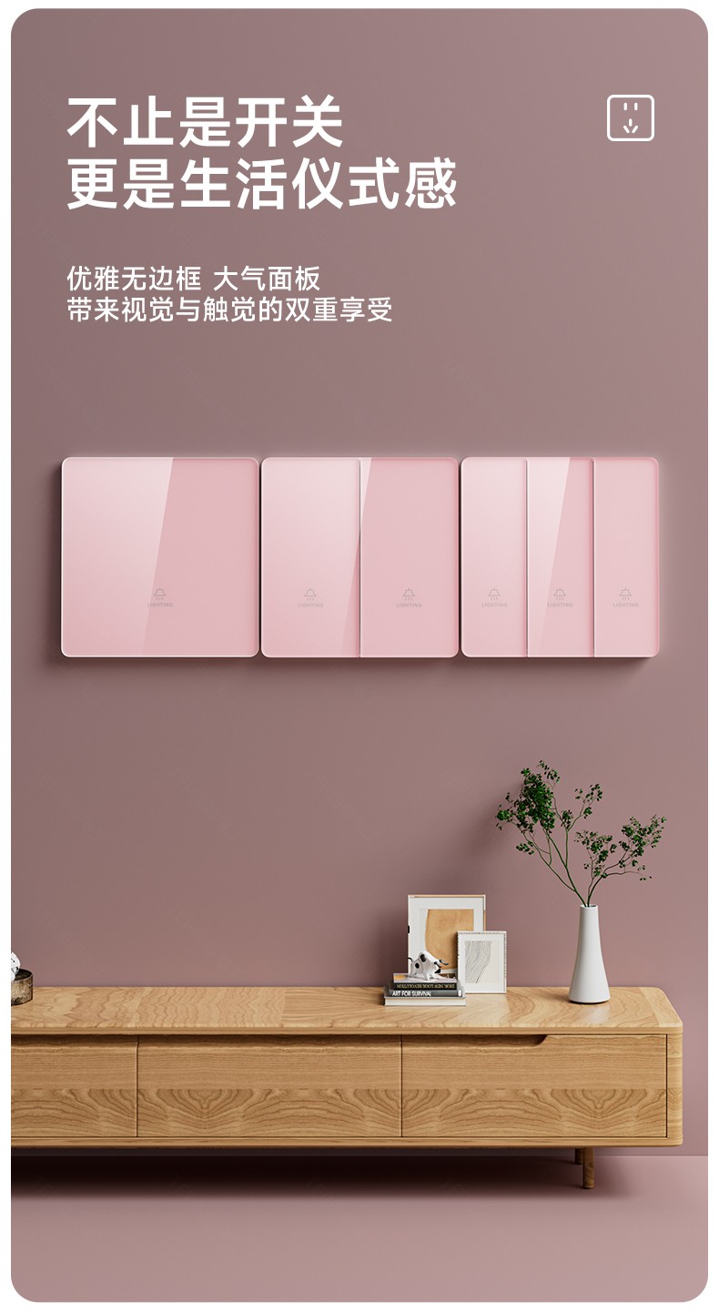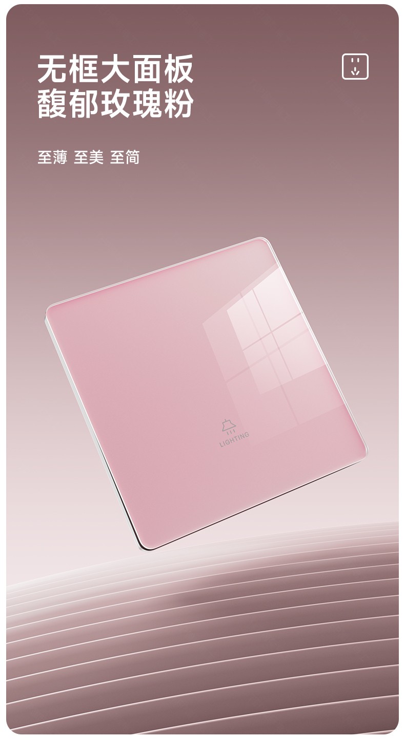 超薄钢化玻璃玫瑰粉色开关 光影会流动的墙面艺术 无框大面板馥郁玫瑰粉 至薄 至美 至简 5.5mm至薄一体贴墙 诠释平面美学 省心 一擦即净灰尘水渍轻松打理