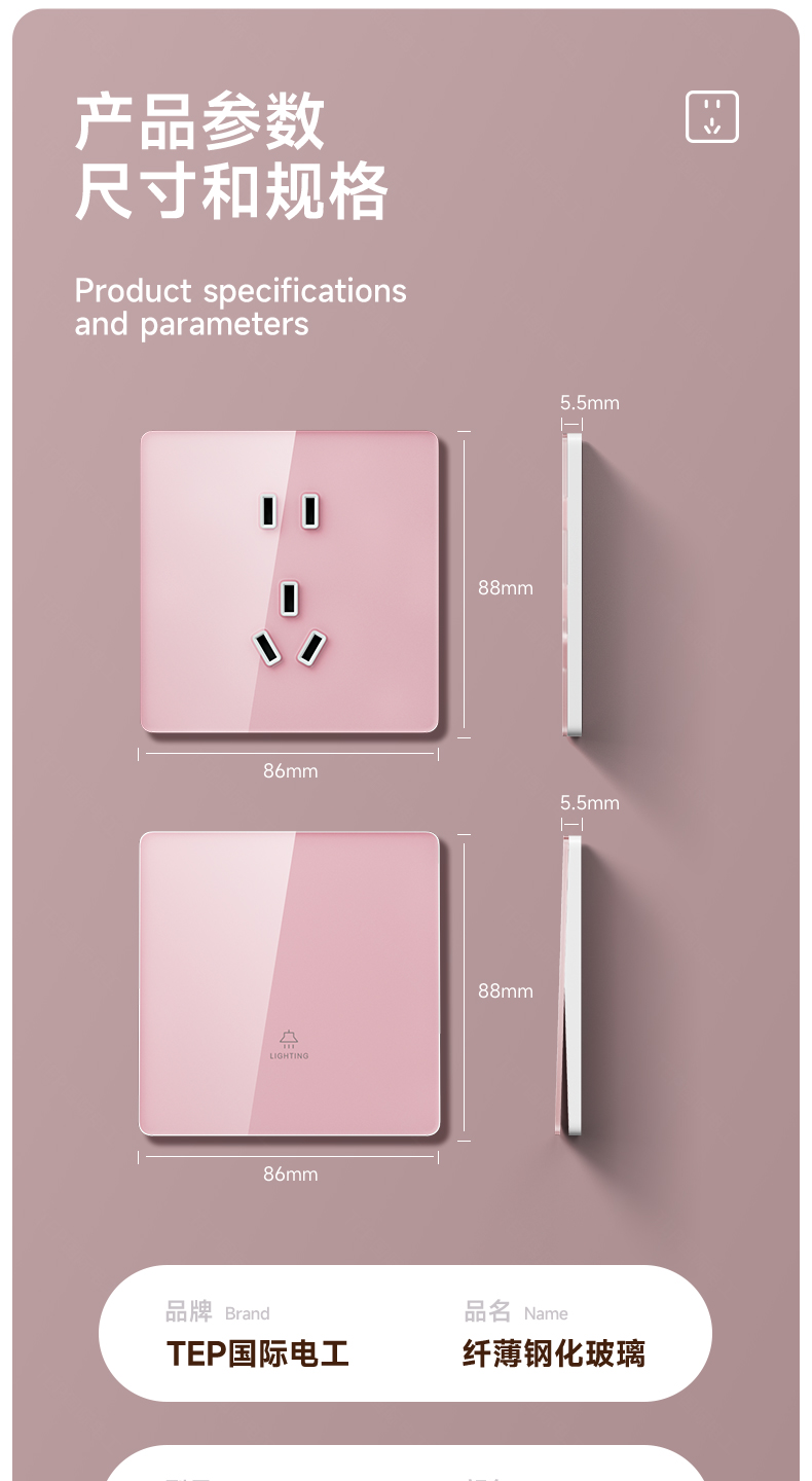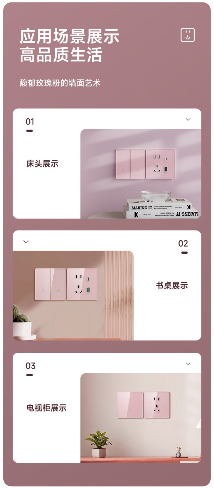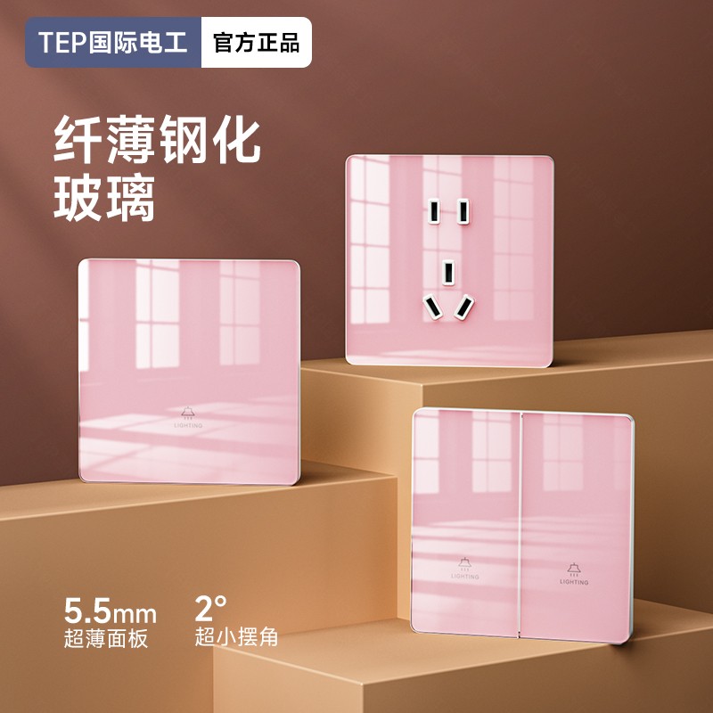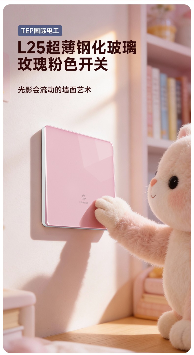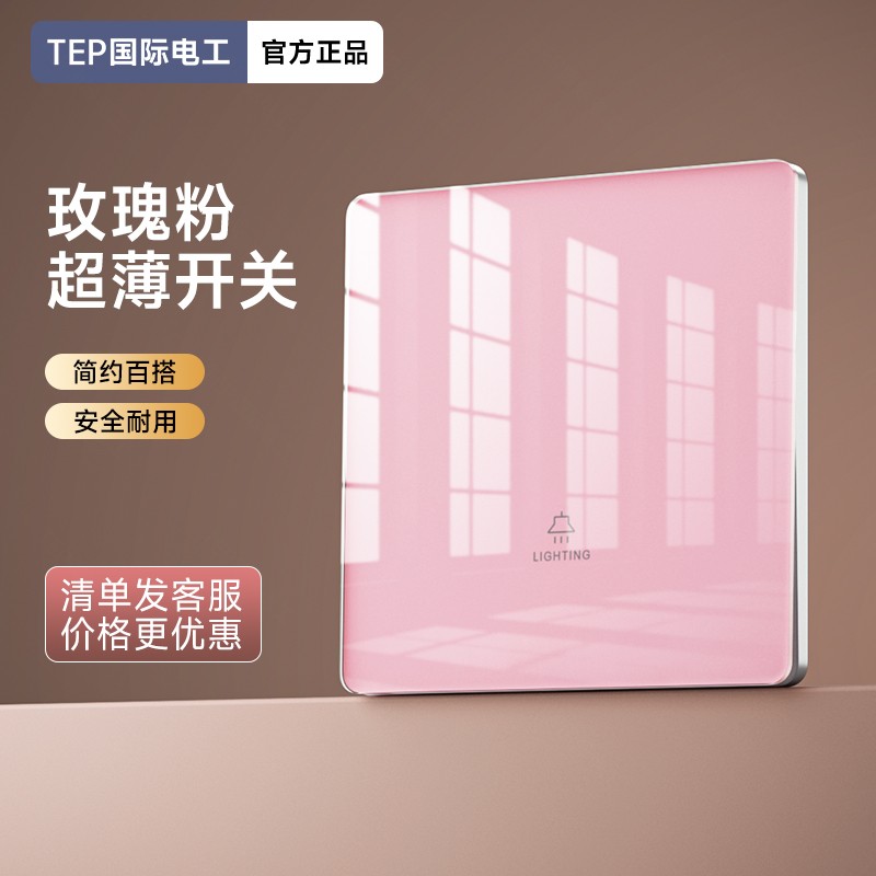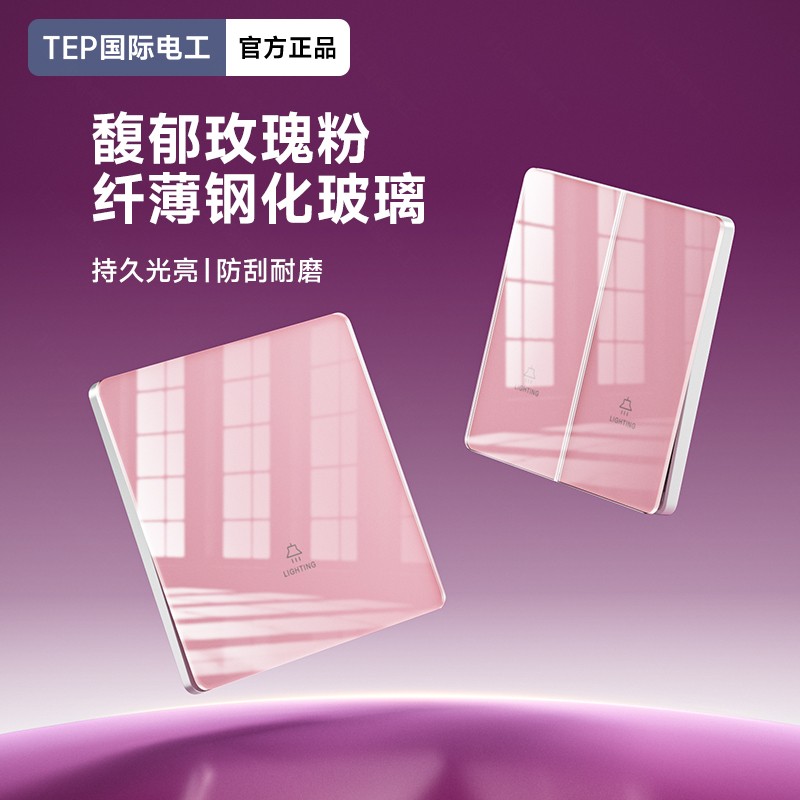 超薄钢化玻璃玫瑰粉色开关 光影会流动的墙面艺术 无框大面板馥郁玫瑰粉 至薄 至美 至简 5.5mm至薄一体贴墙 诠释平面美学 省心 一擦即净灰尘水渍轻松打理