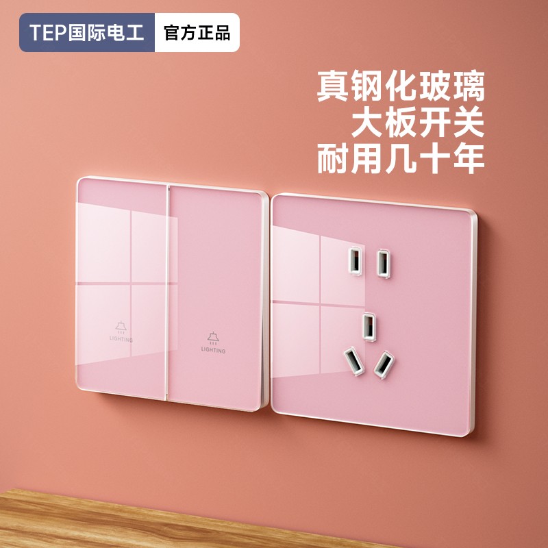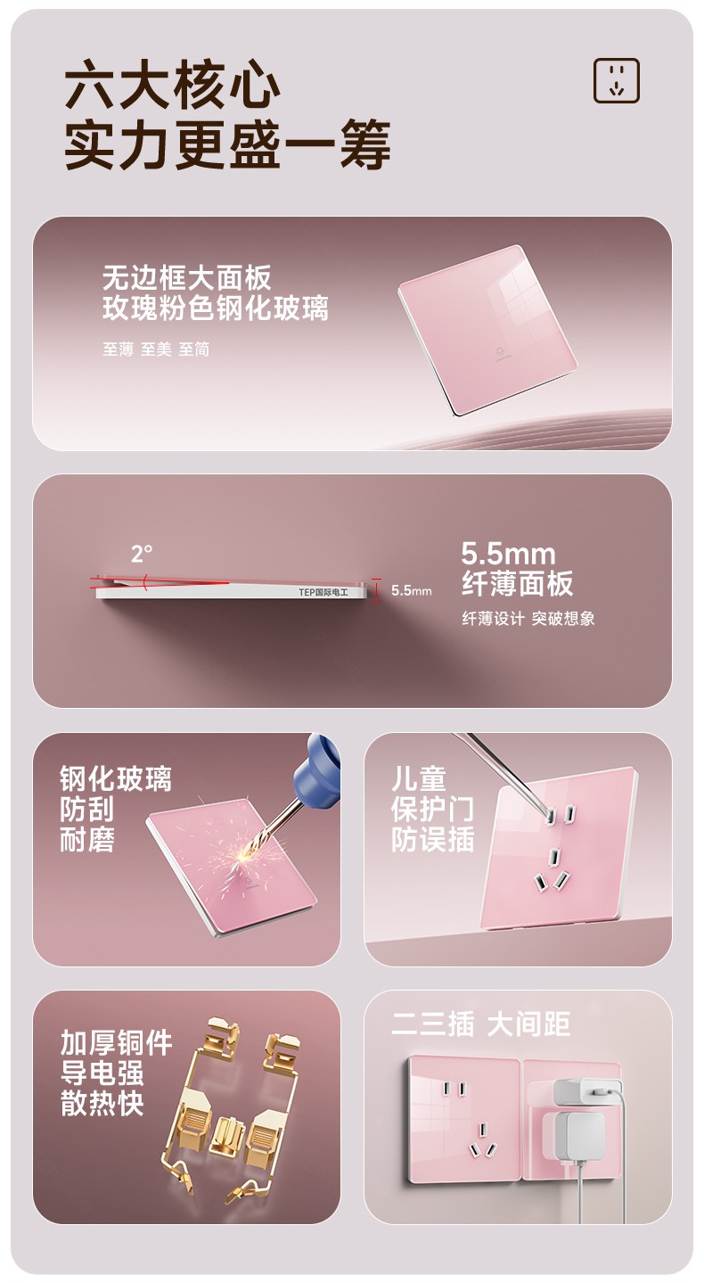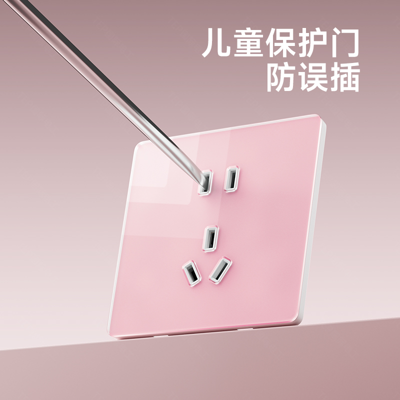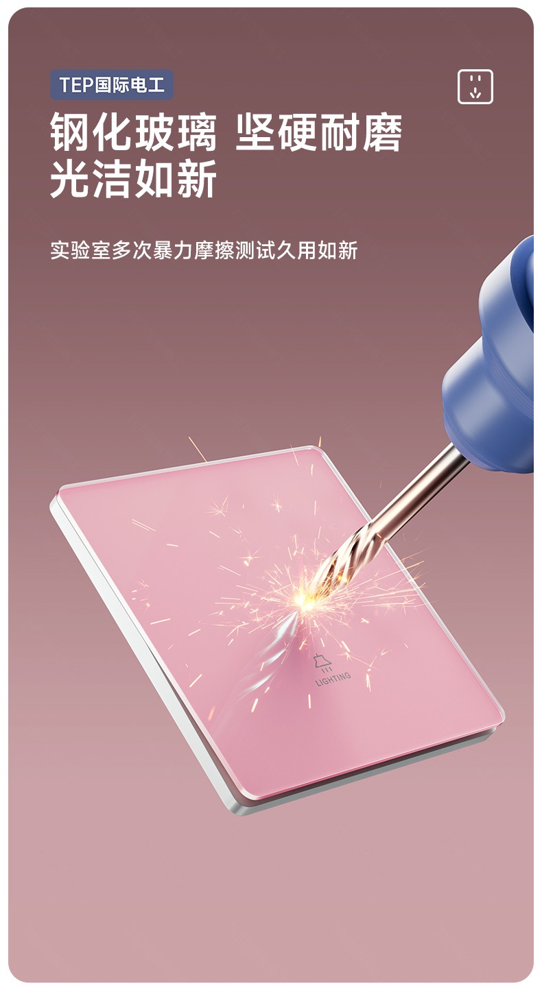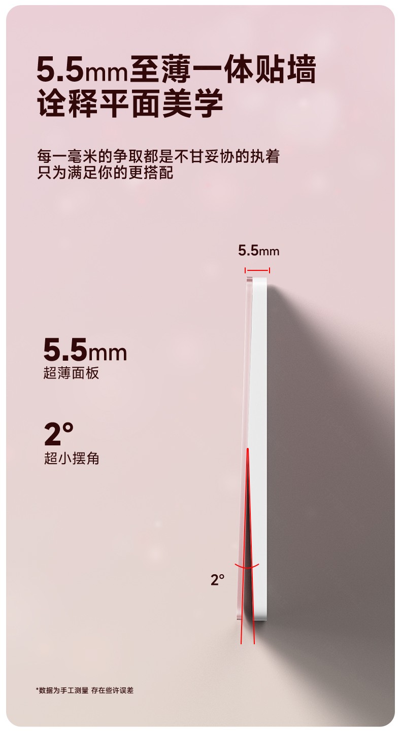 超薄钢化玻璃玫瑰粉色开关 光影会流动的墙面艺术 无框大面板馥郁玫瑰粉 至薄 至美 至简 5.5mm至薄一体贴墙 诠释平面美学 省心 一擦即净灰尘水渍轻松打理