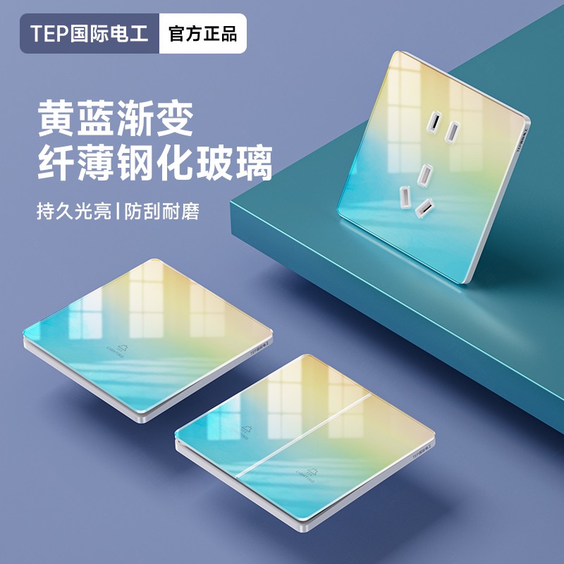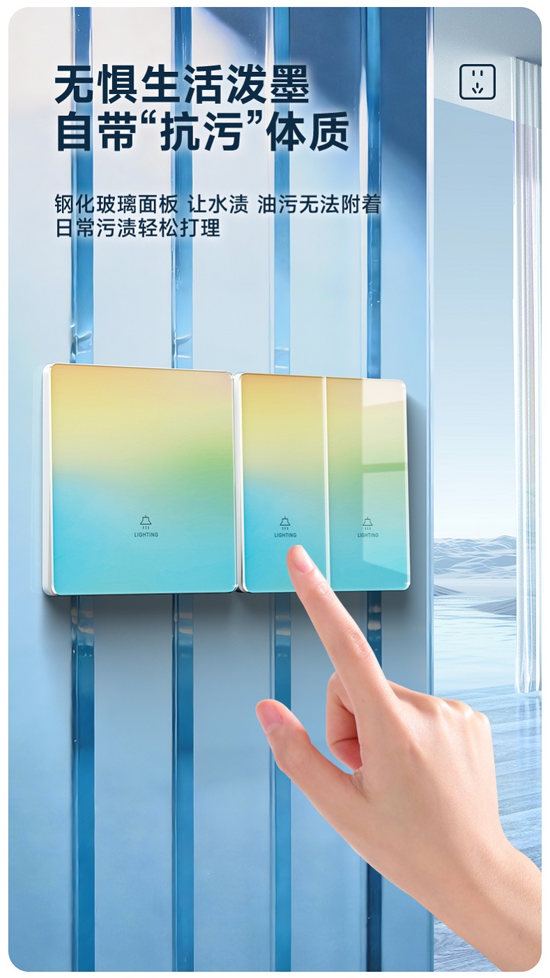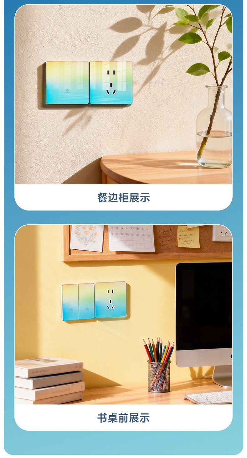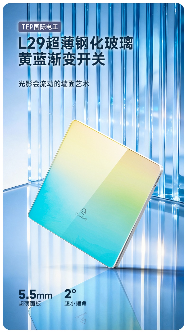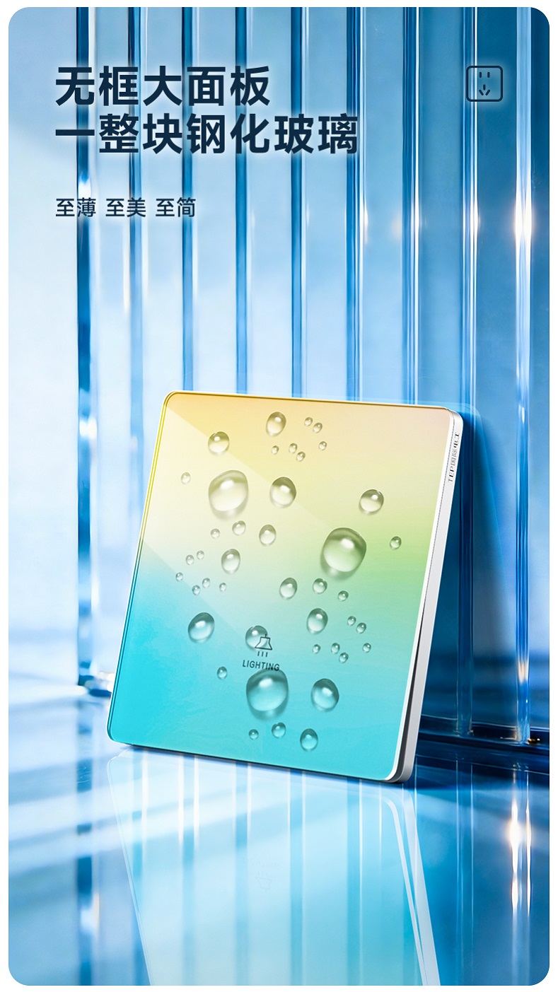超薄钢化玻璃黄蓝渐变开关 光影会流动的墙面艺术 5.5mm超薄面板 2°超小摆角 钢化玻璃 无框大面板 坚硬耐磨 光洁如新 至薄至美至简 温润圆角 呵护手指 加厚铜件散热快 更安全