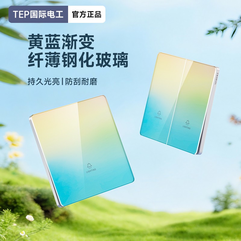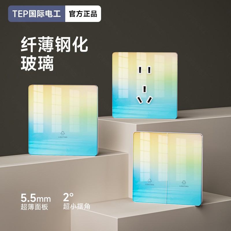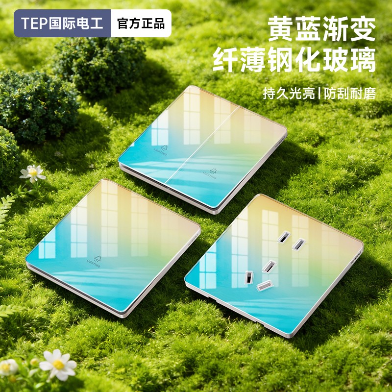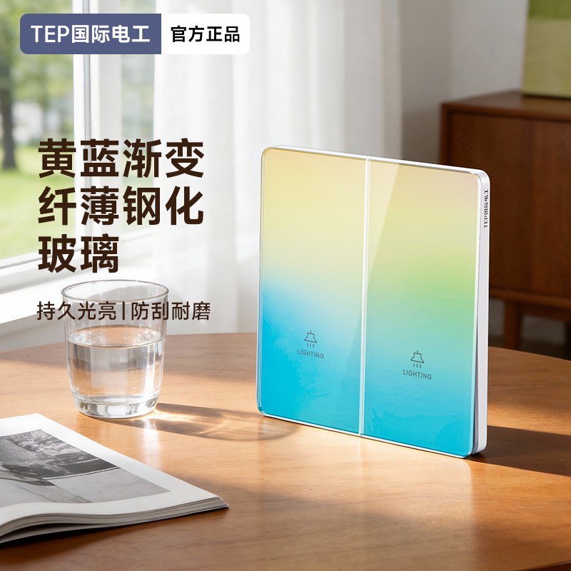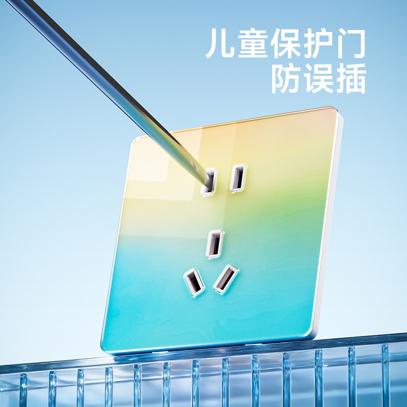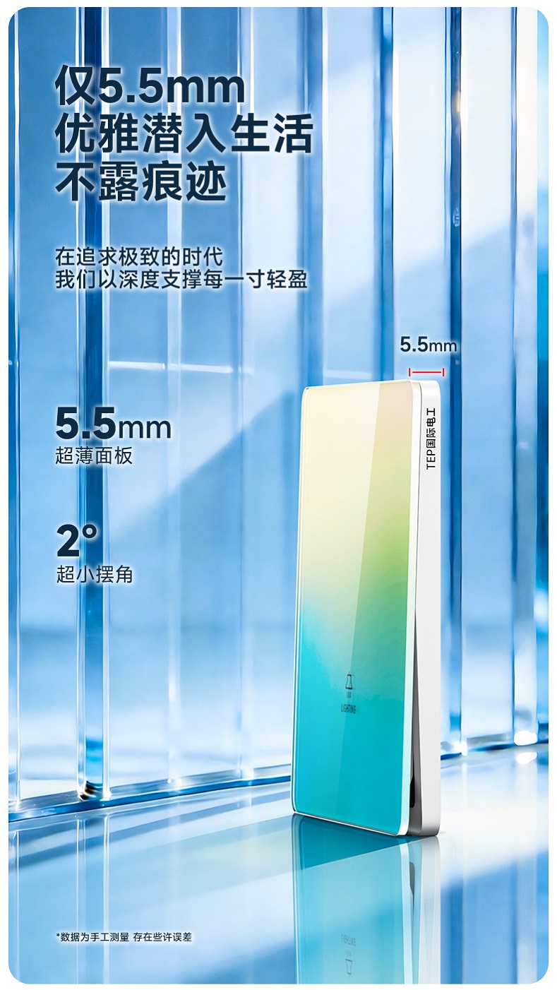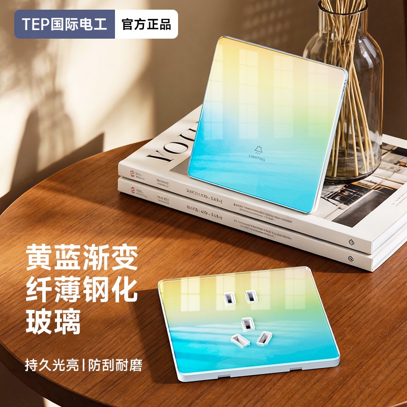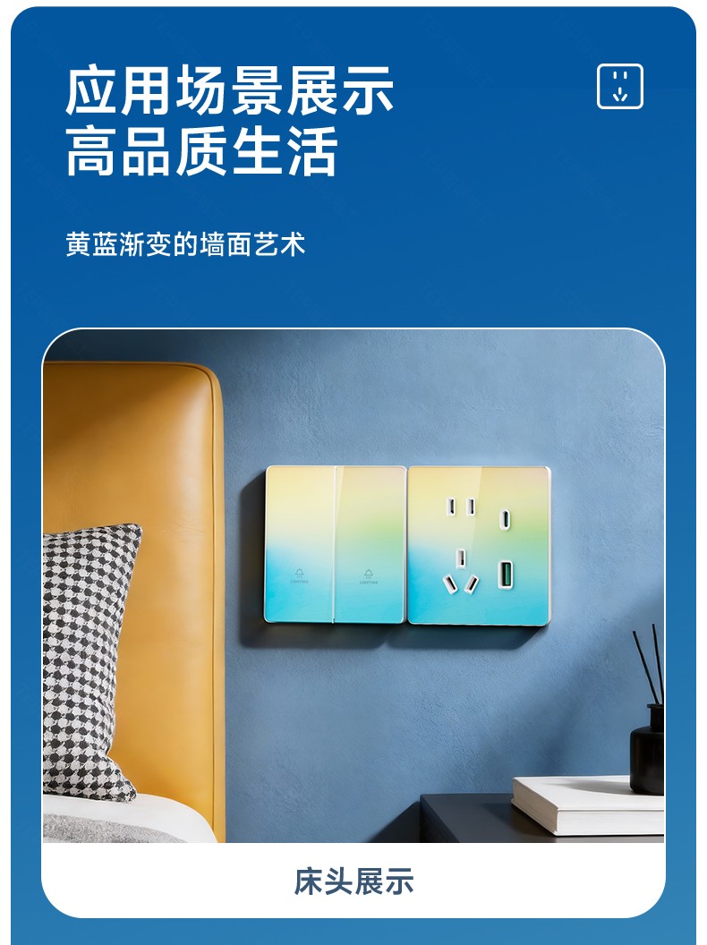 超薄钢化玻璃黄蓝渐变开关 光影会流动的墙面艺术 5.5mm超薄面板 2°超小摆角 钢化玻璃 无框大面板 坚硬耐磨 光洁如新 至薄至美至简 温润圆角 呵护手指 加厚铜件散热快 更安全