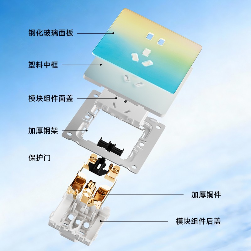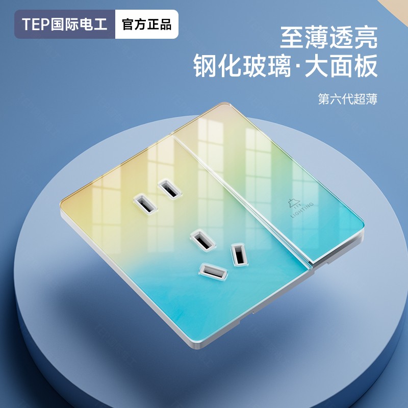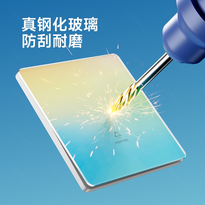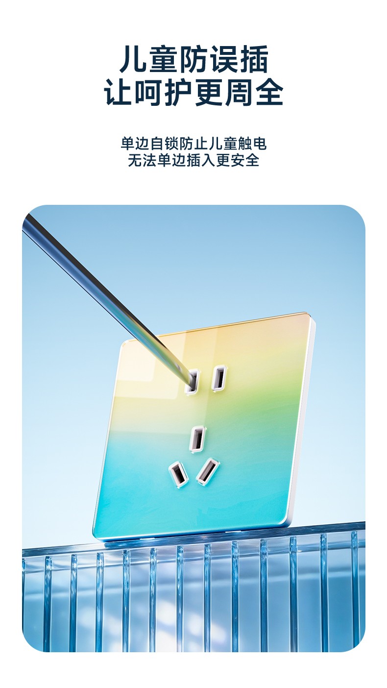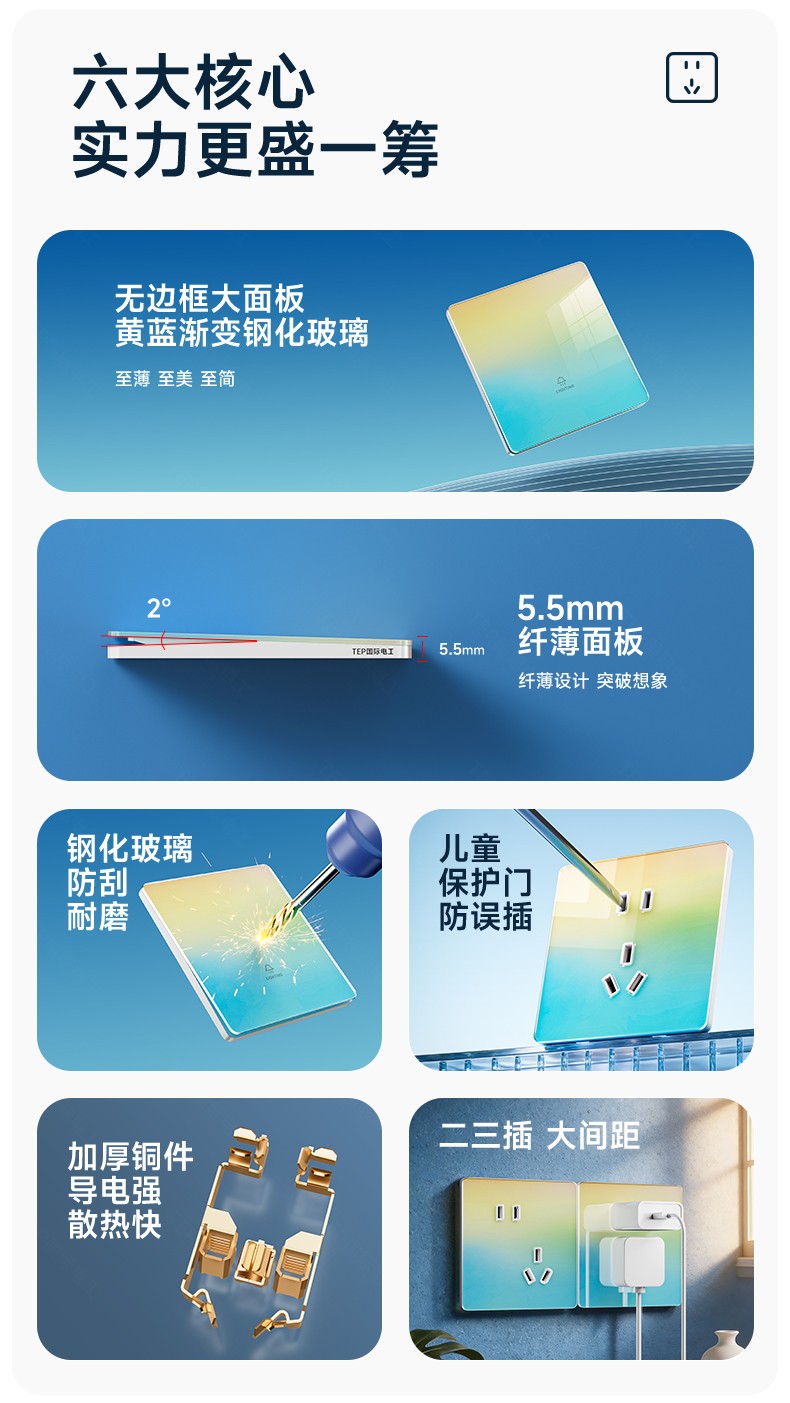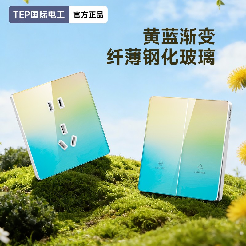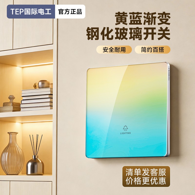 超薄钢化玻璃黄蓝渐变开关 光影会流动的墙面艺术 5.5mm超薄面板 2°超小摆角 钢化玻璃 无框大面板 坚硬耐磨 光洁如新 至薄至美至简 温润圆角 呵护手指 加厚铜件散热快 更安全