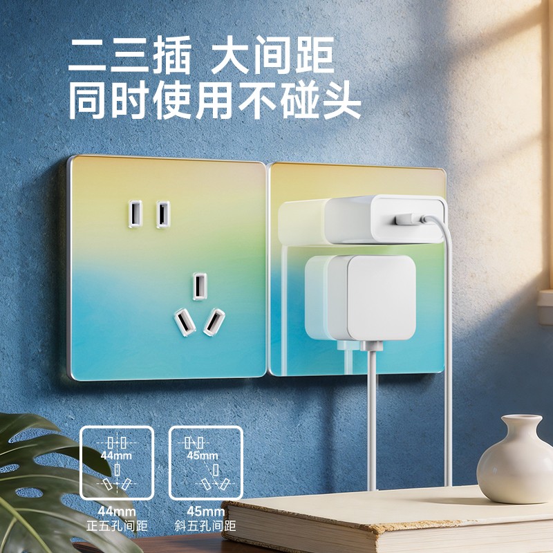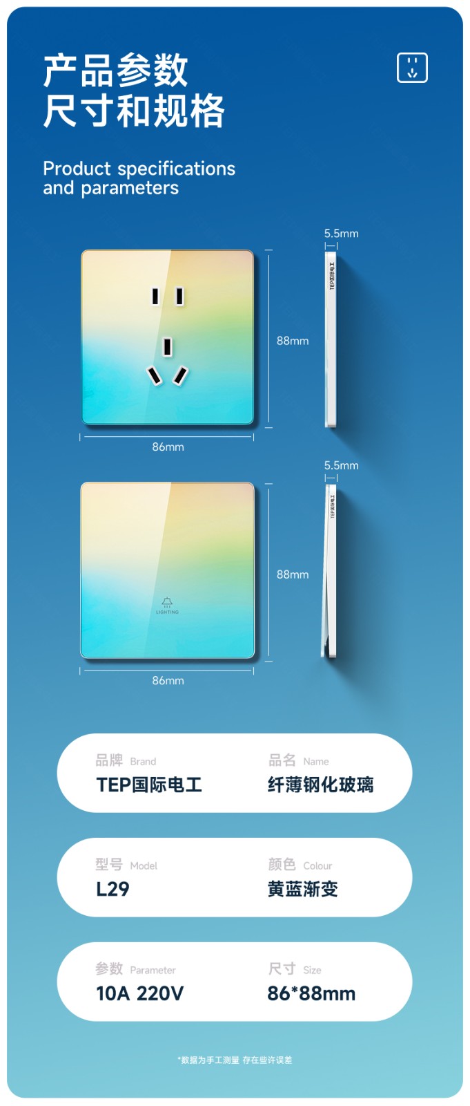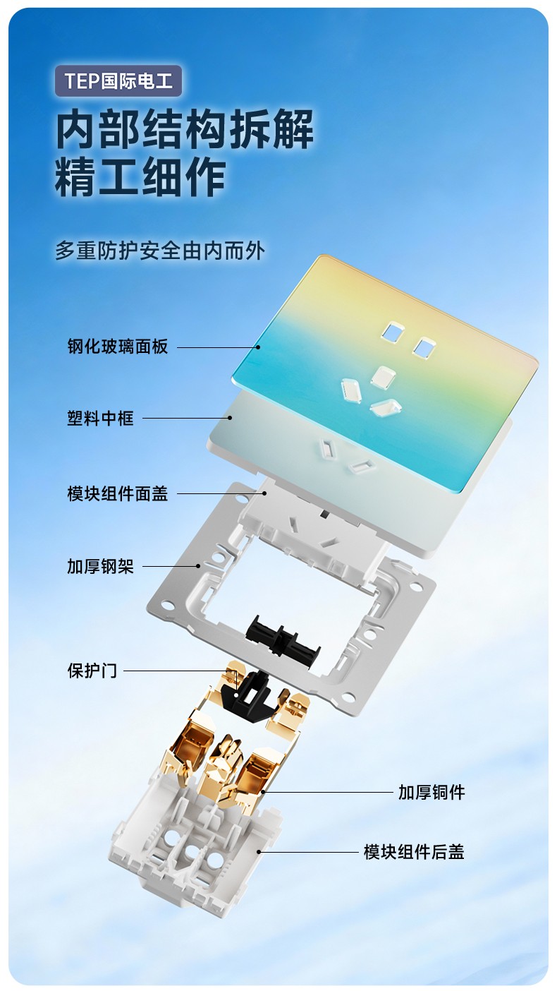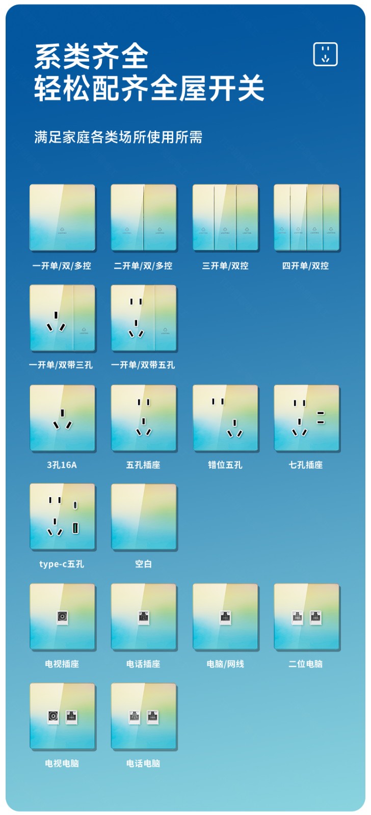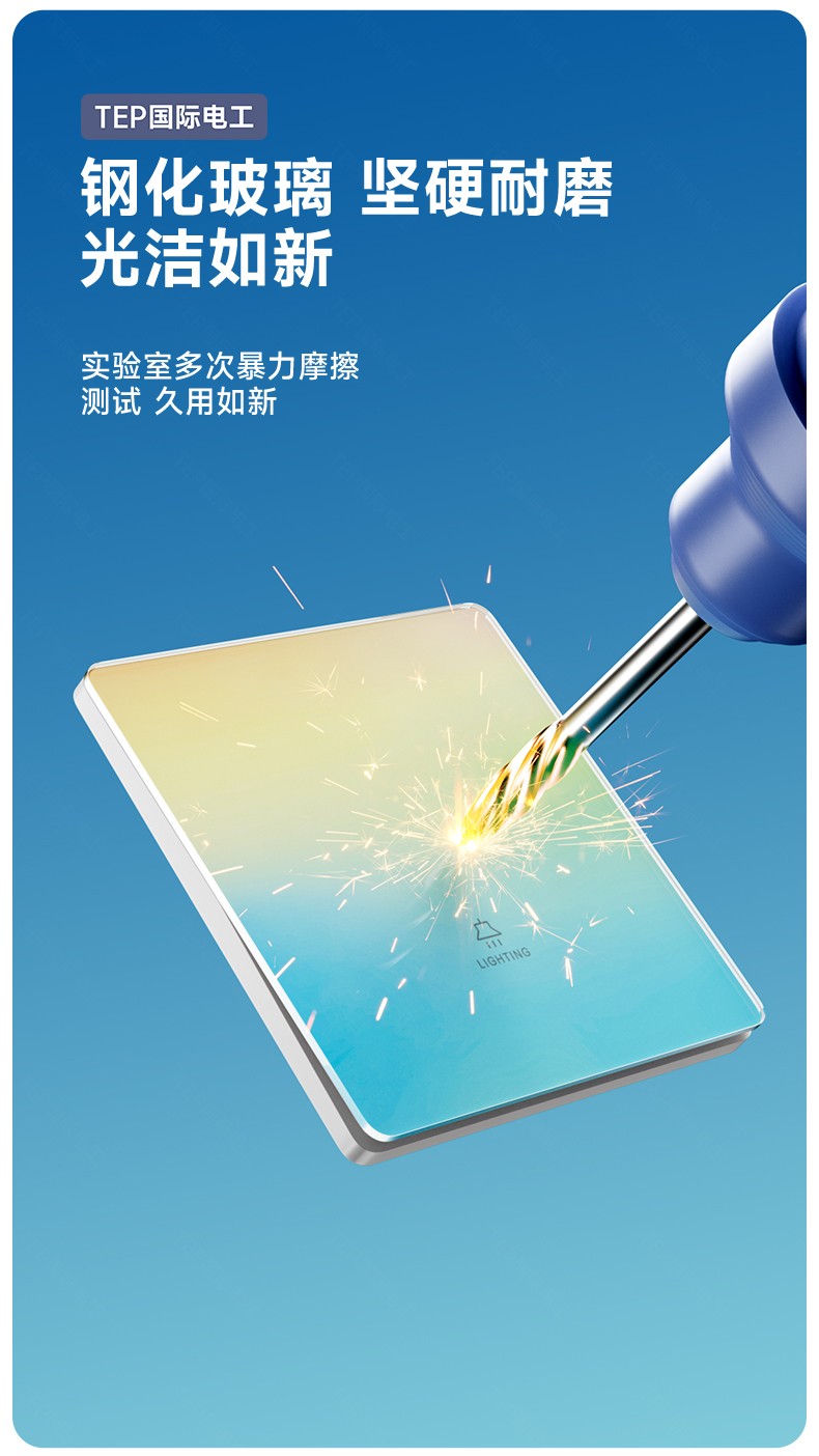 超薄钢化玻璃黄蓝渐变开关 光影会流动的墙面艺术 5.5mm超薄面板 2°超小摆角 钢化玻璃 无框大面板 坚硬耐磨 光洁如新 至薄至美至简 温润圆角 呵护手指 加厚铜件散热快 更安全
