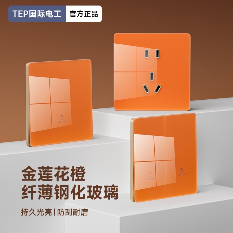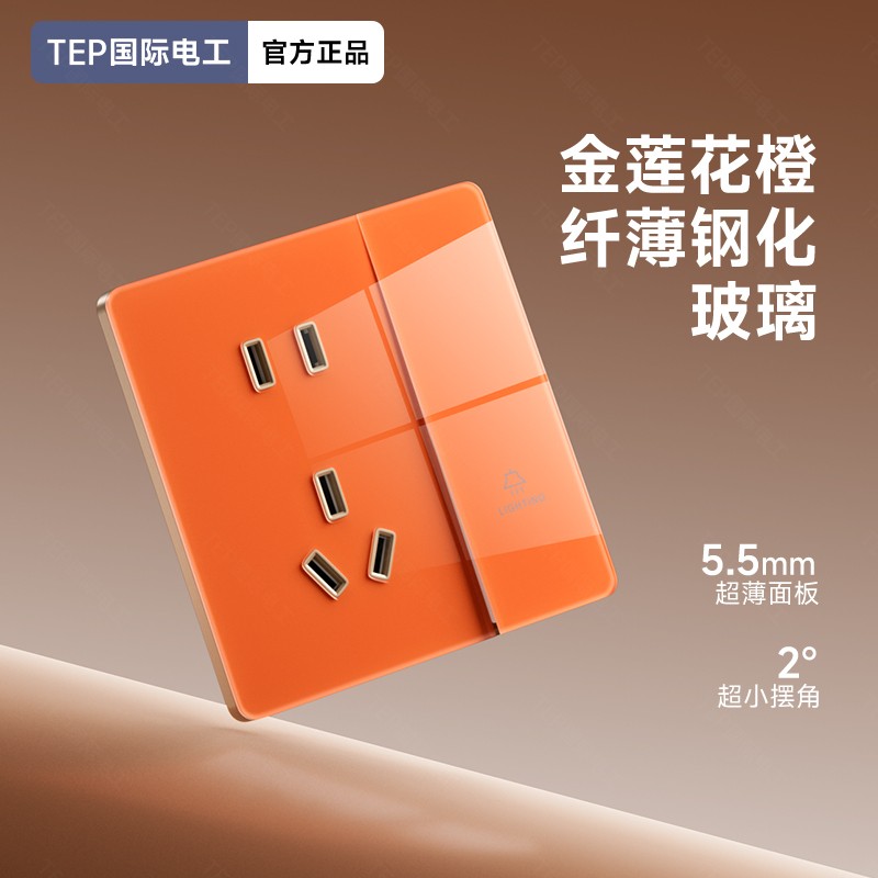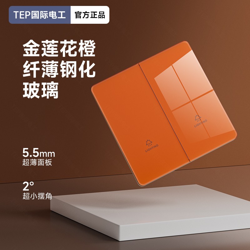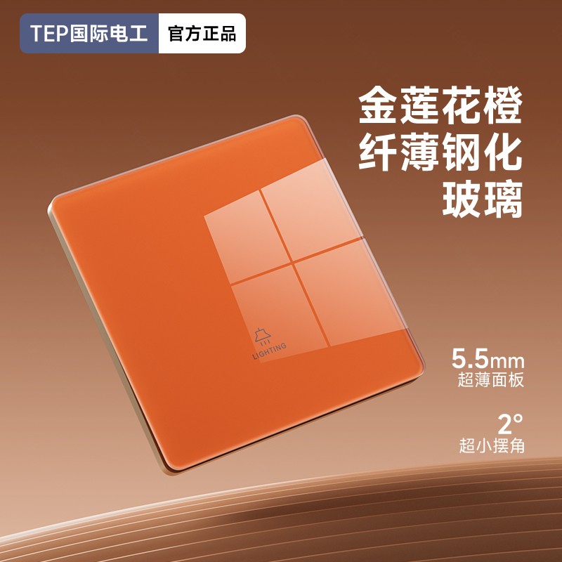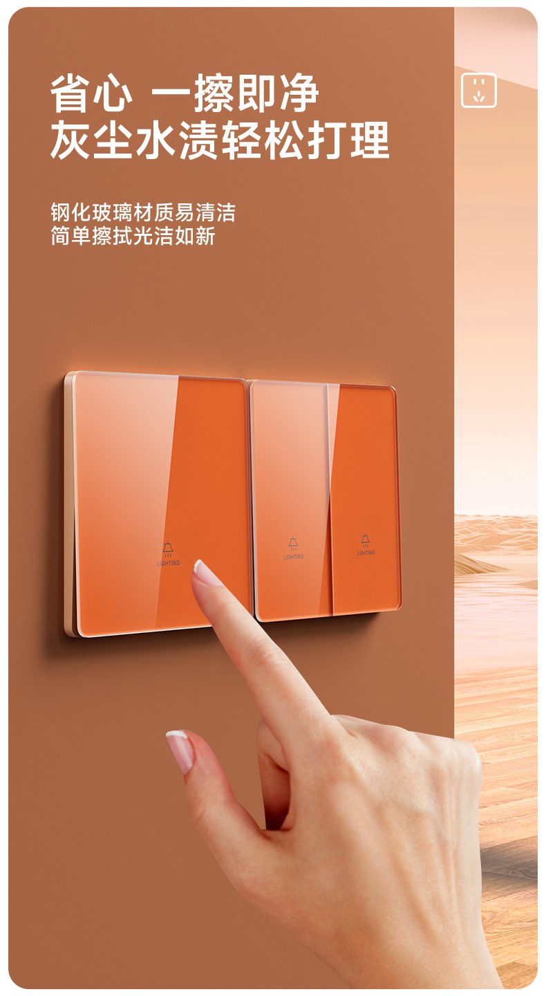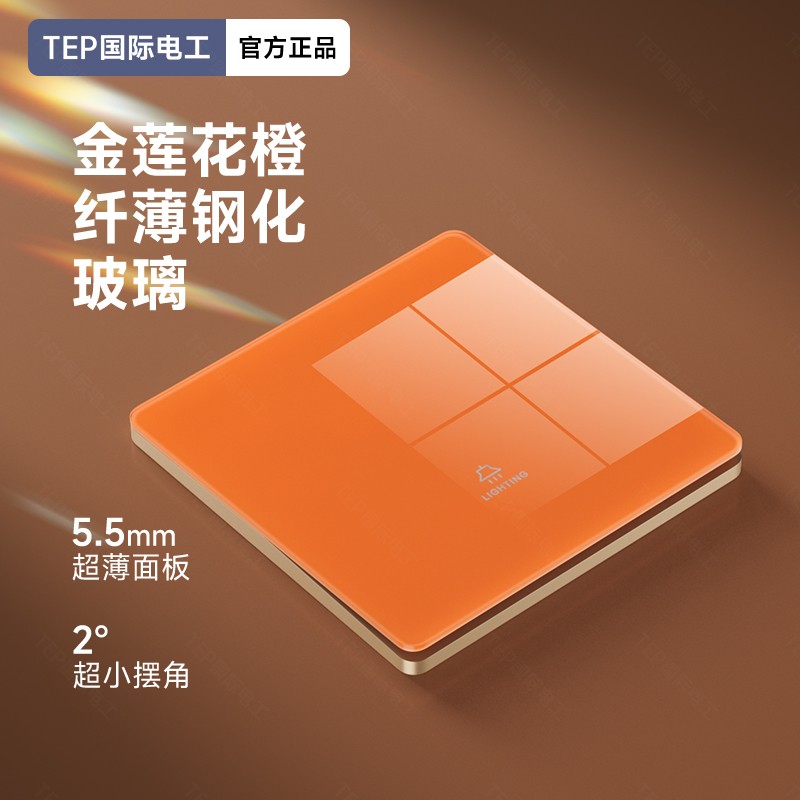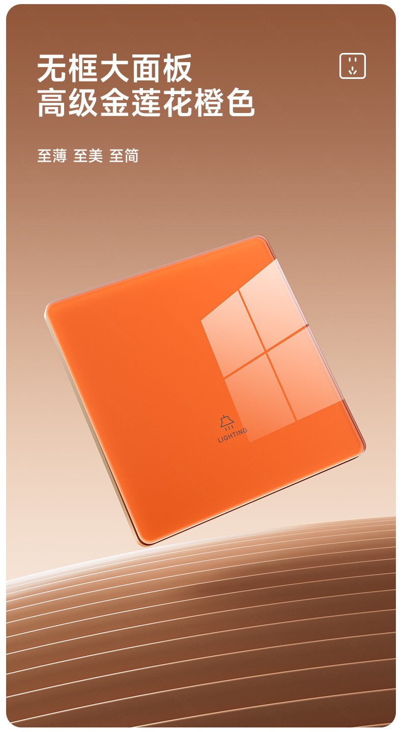 超薄钢化玻璃金莲花橙开关 光影会流动的墙面艺术 无边框大面板粉青渐变钢化玻璃 至薄 至美 至简 5.5mm纤薄面板 纤薄设计 突破想象 钢化玻璃防刮耐磨 加厚铜件导电强散热快 儿童保护门防误插 二三插 大间距