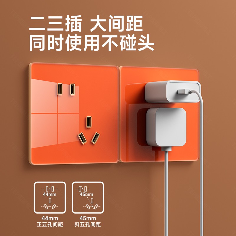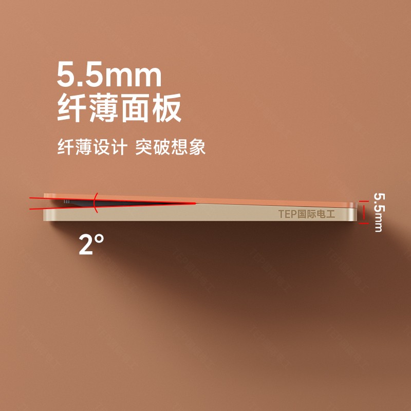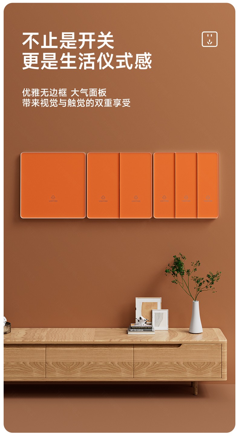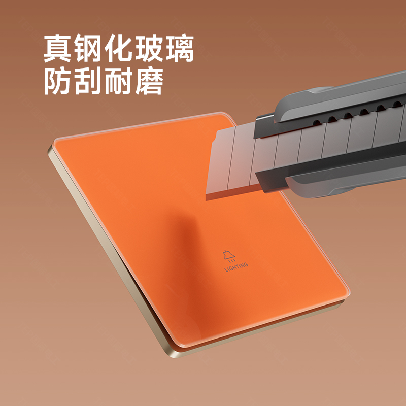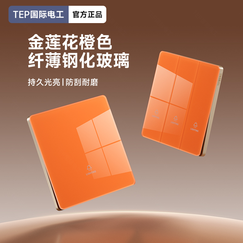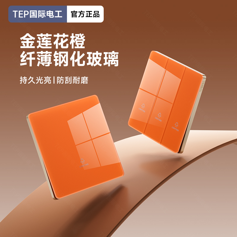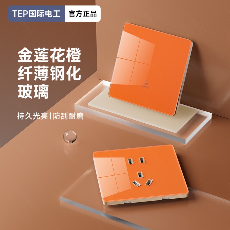 超薄钢化玻璃金莲花橙开关 光影会流动的墙面艺术 无边框大面板粉青渐变钢化玻璃 至薄 至美 至简 5.5mm纤薄面板 纤薄设计 突破想象 钢化玻璃防刮耐磨 加厚铜件导电强散热快 儿童保护门防误插 二三插 大间距