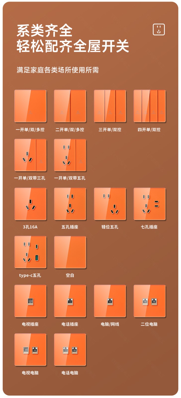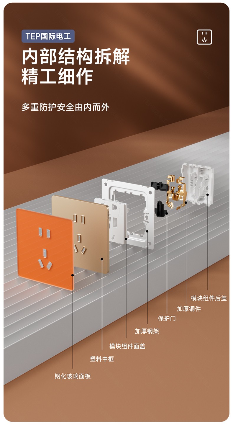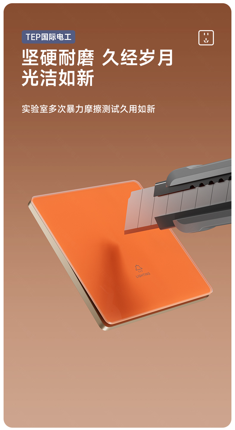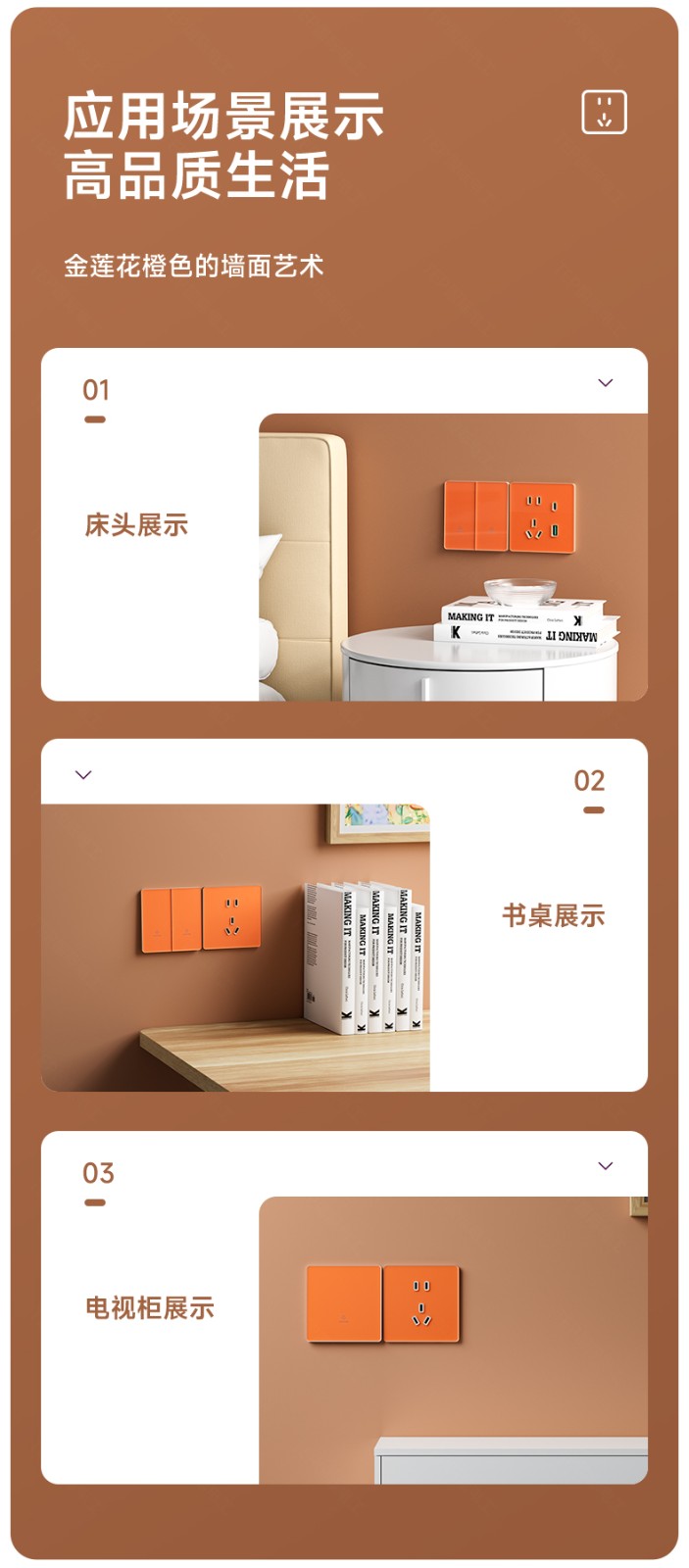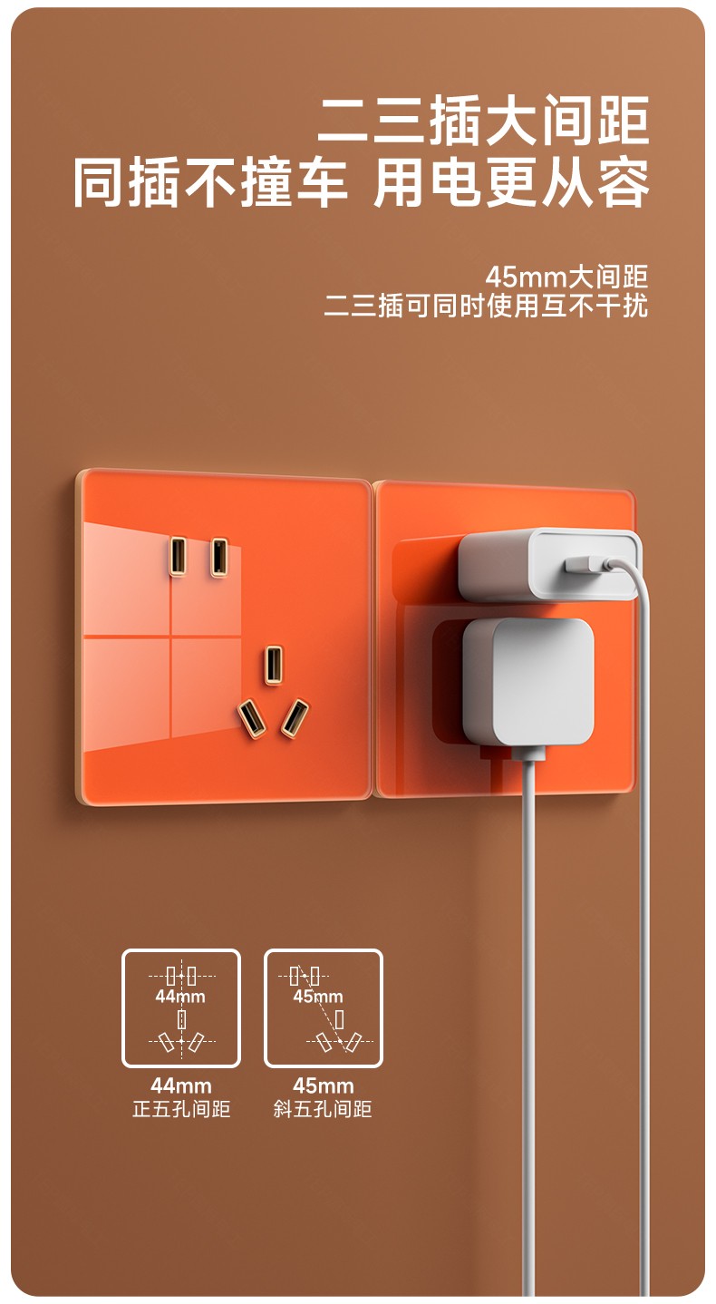 超薄钢化玻璃金莲花橙开关 光影会流动的墙面艺术 无边框大面板粉青渐变钢化玻璃 至薄 至美 至简 5.5mm纤薄面板 纤薄设计 突破想象 钢化玻璃防刮耐磨 加厚铜件导电强散热快 儿童保护门防误插 二三插 大间距