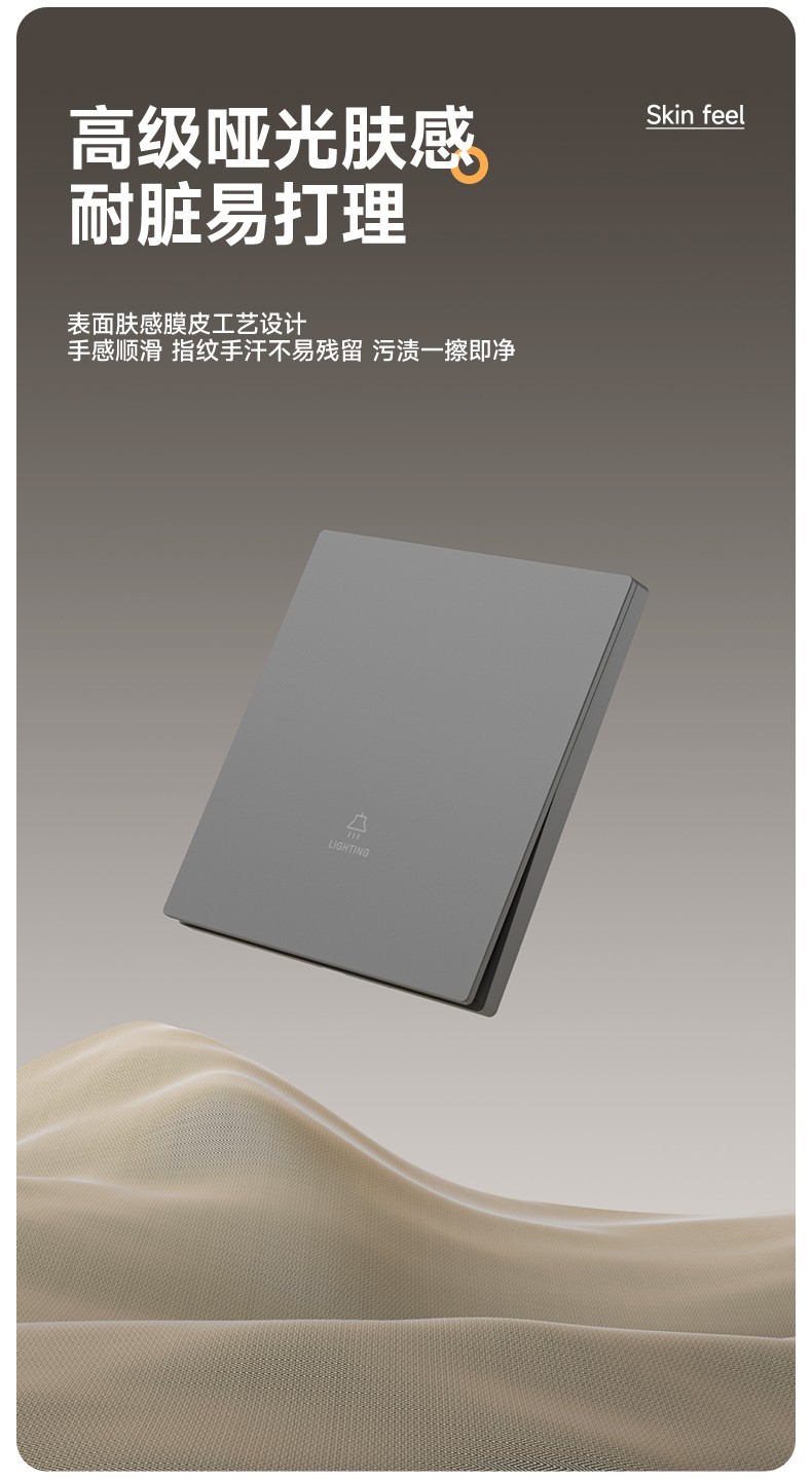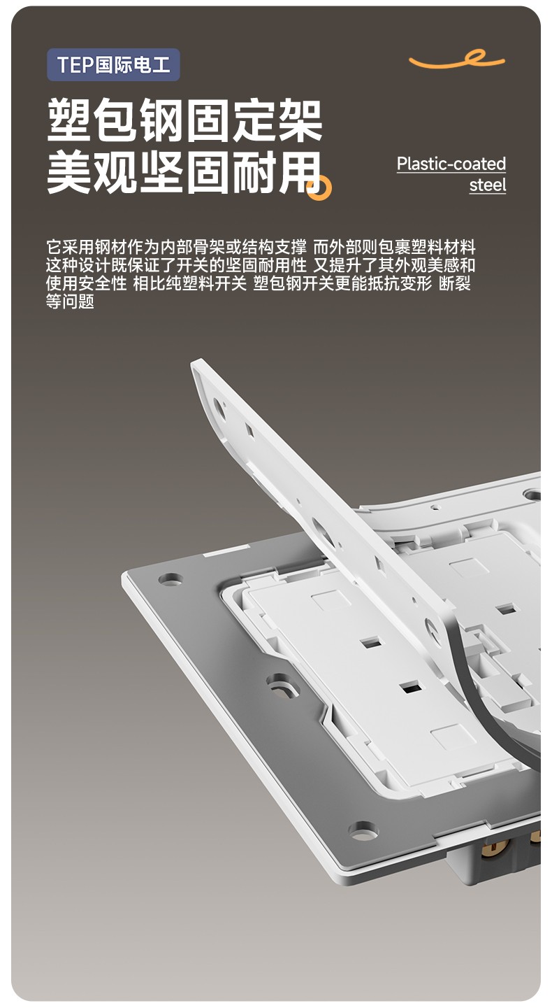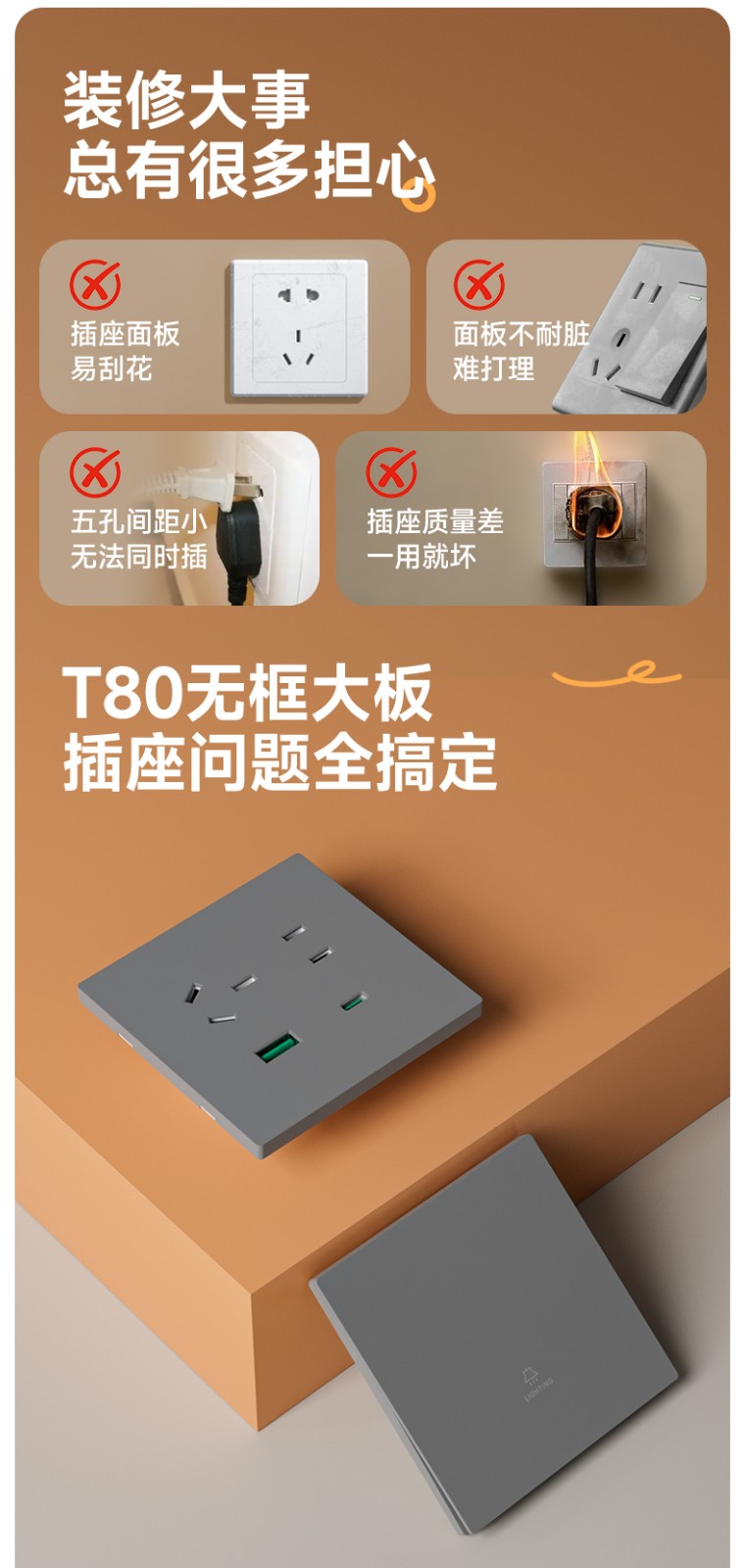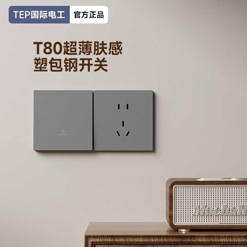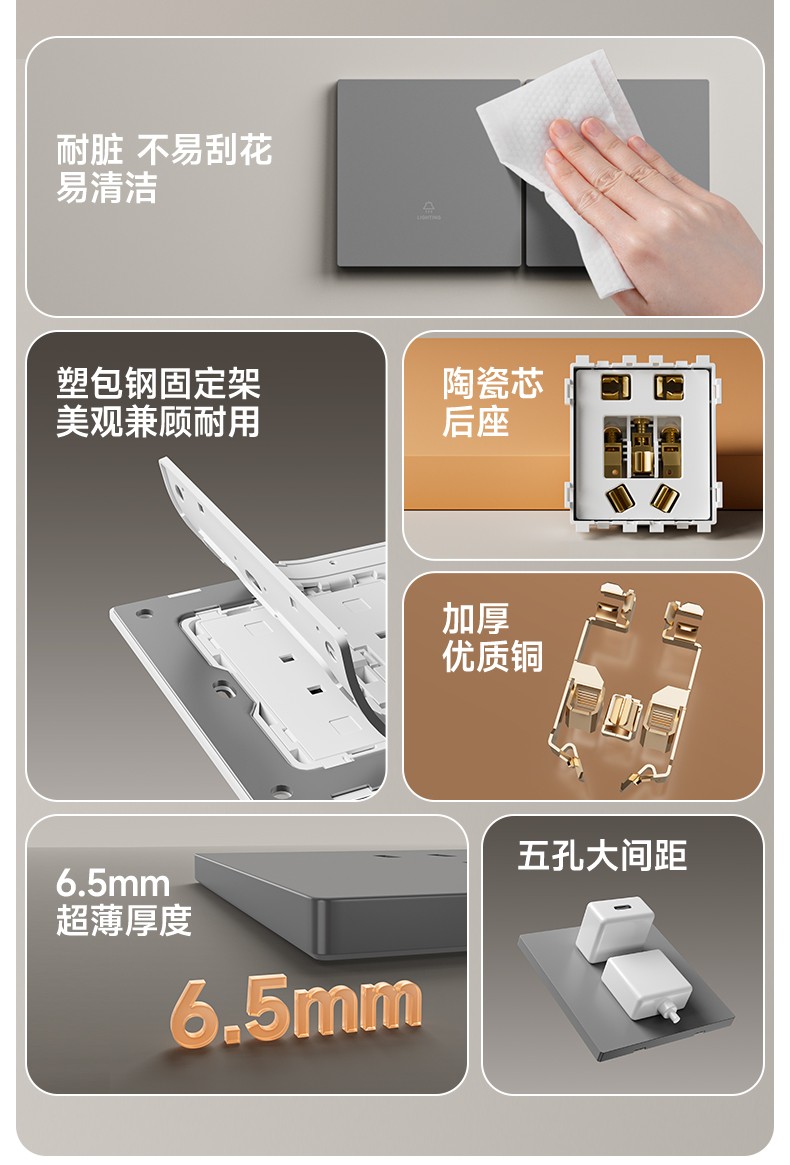 T80超薄肤感塑包钢开关,表面肤感膜皮工艺设计手感顺滑、指纹手汗不易残留、污渍一擦即净,塑包钢固定架美观兼顾耐用,陶瓷芯后座,加厚优质铜,6.5mm超蒲厚度,五孔大间距