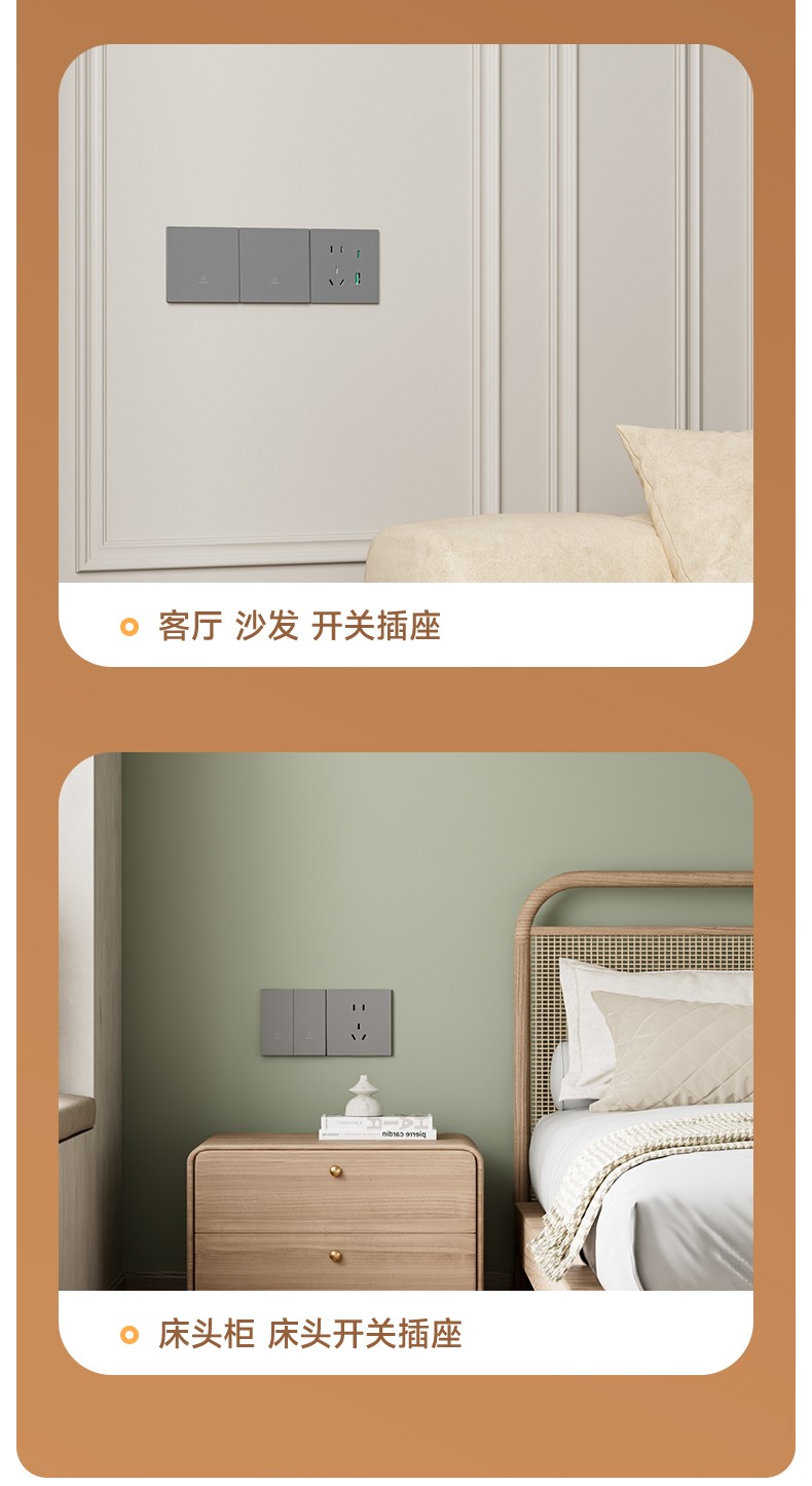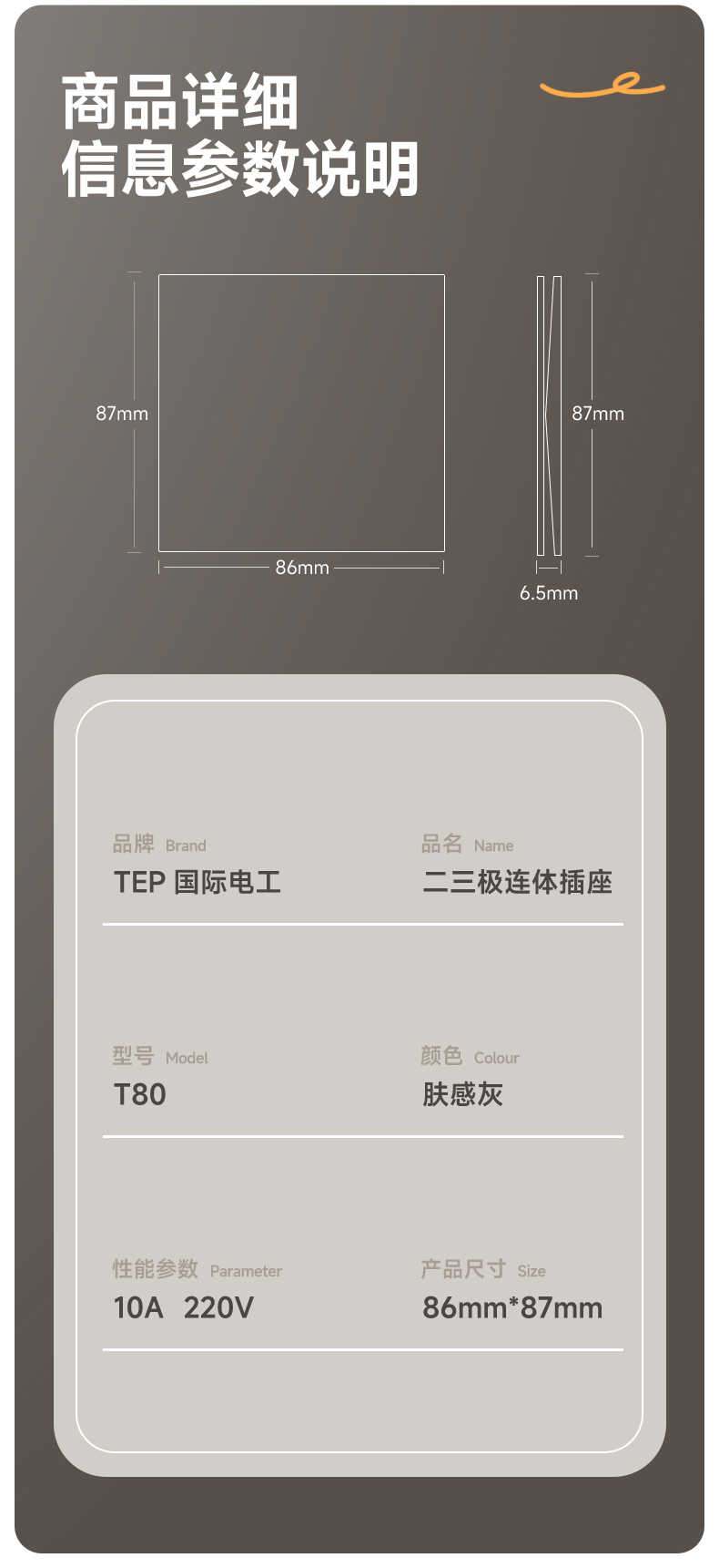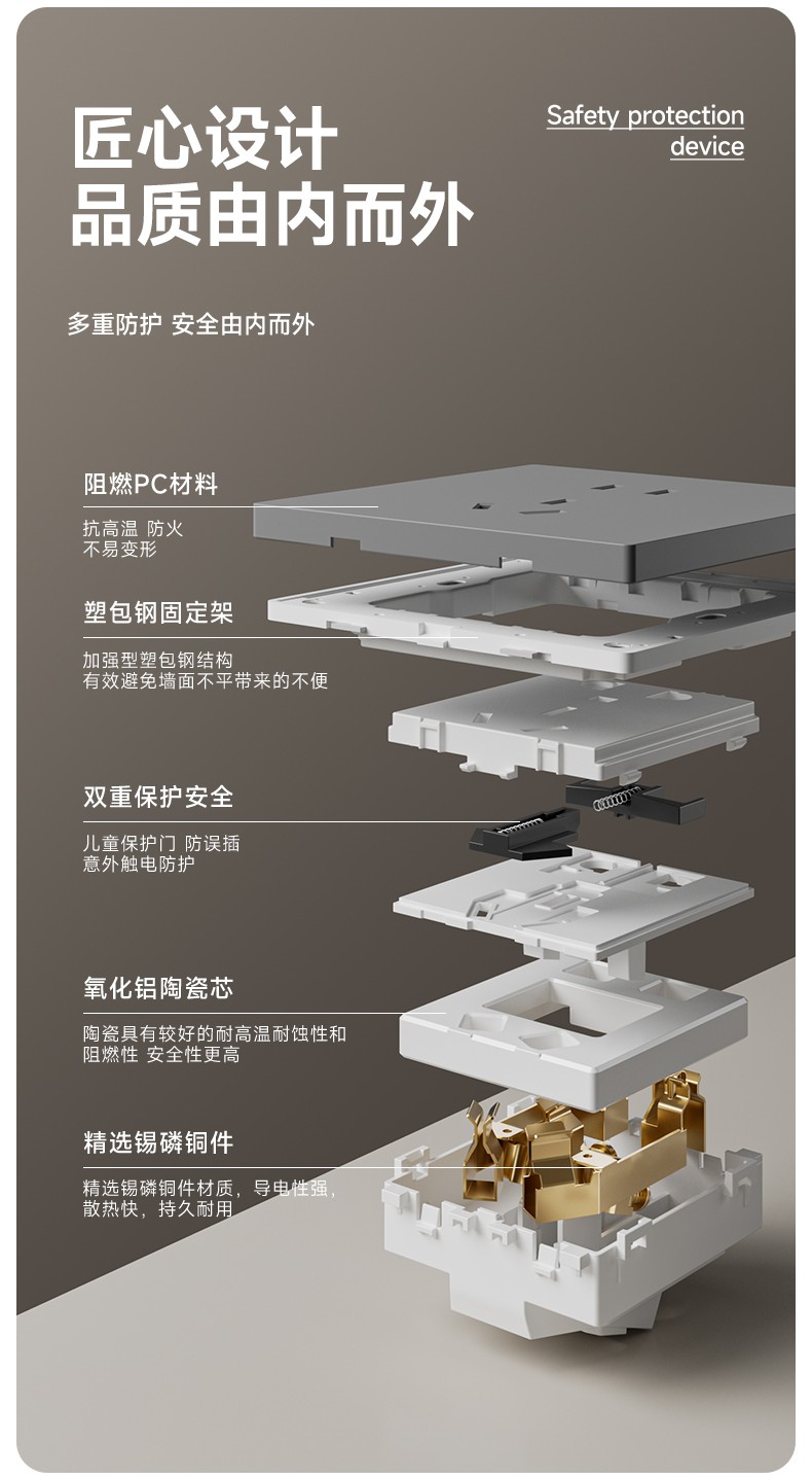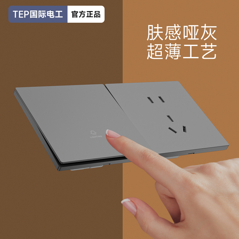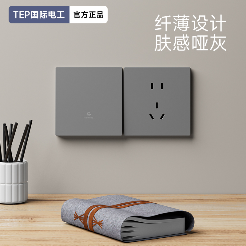 T80超薄肤感塑包钢开关,表面肤感膜皮工艺设计手感顺滑、指纹手汗不易残留、污渍一擦即净,塑包钢固定架美观兼顾耐用,陶瓷芯后座,加厚优质铜,6.5mm超蒲厚度,五孔大间距