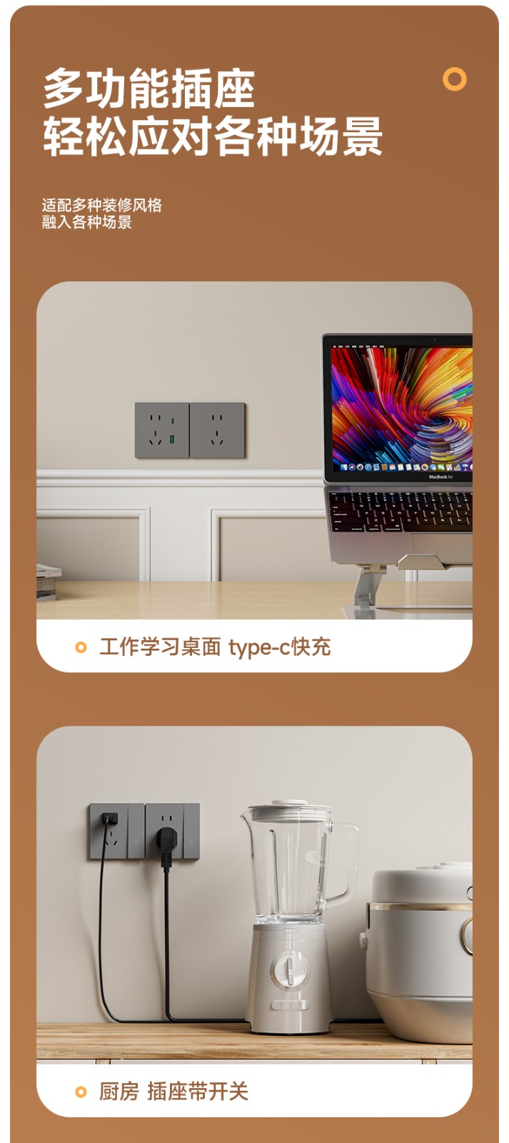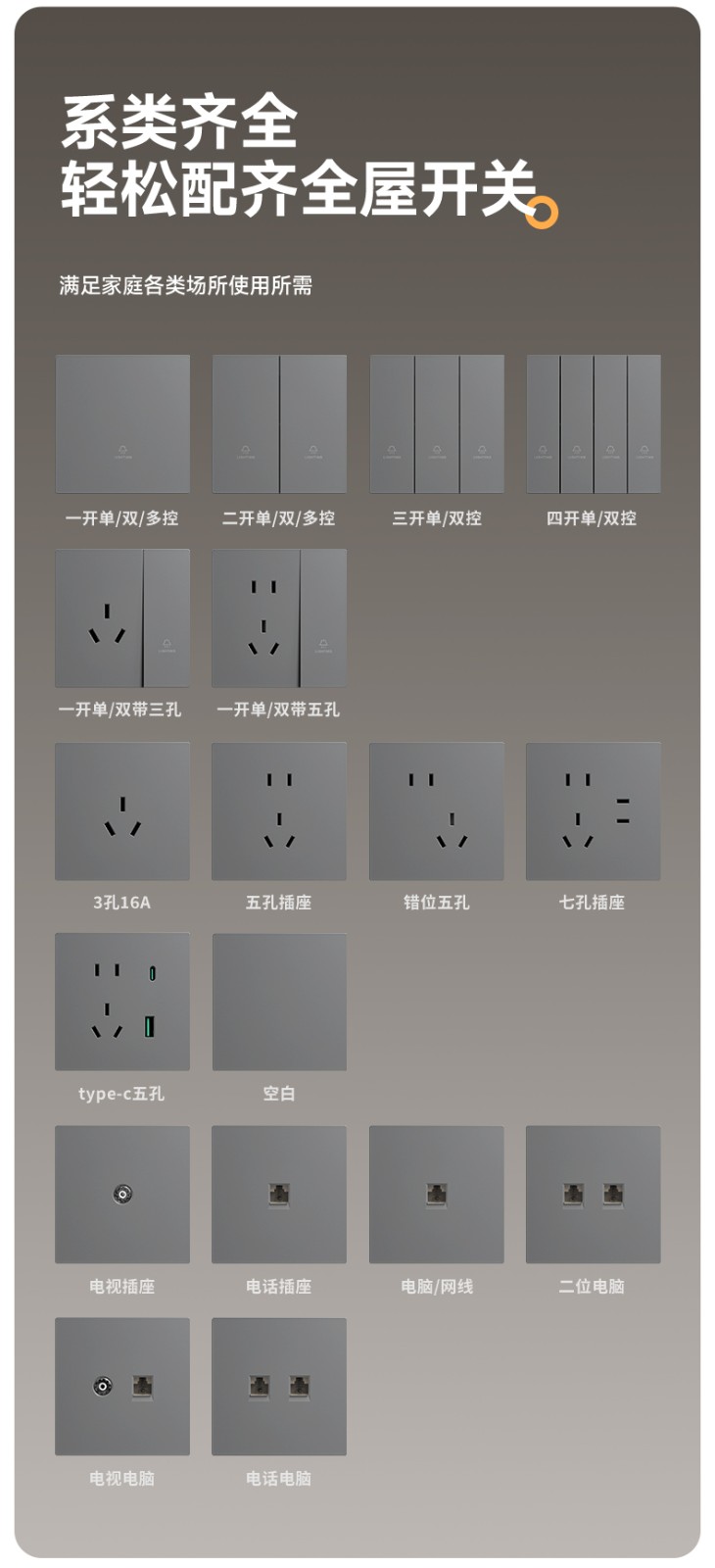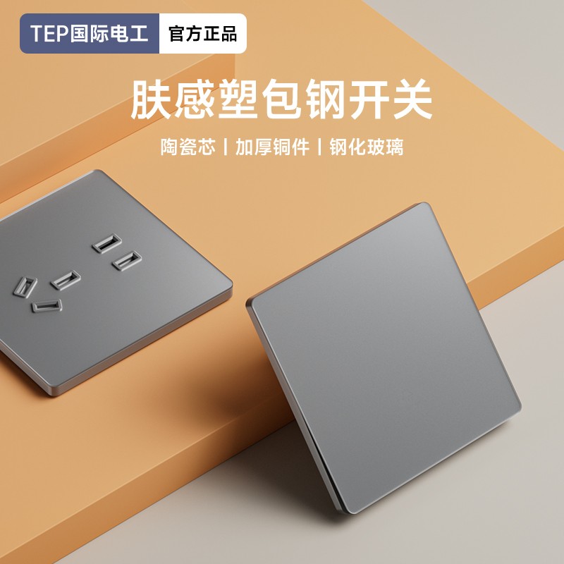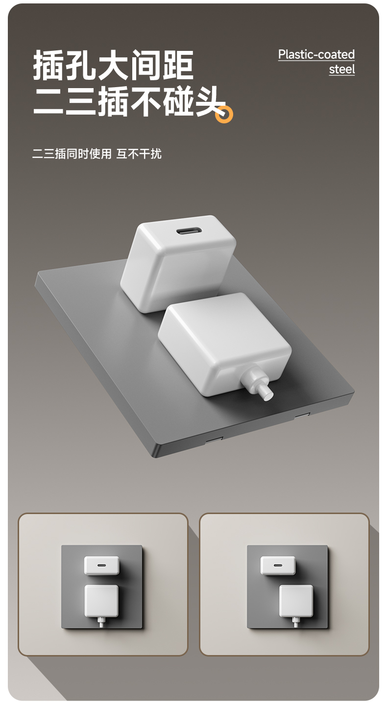 T80超薄肤感塑包钢开关,表面肤感膜皮工艺设计手感顺滑、指纹手汗不易残留、污渍一擦即净,塑包钢固定架美观兼顾耐用,陶瓷芯后座,加厚优质铜,6.5mm超蒲厚度,五孔大间距