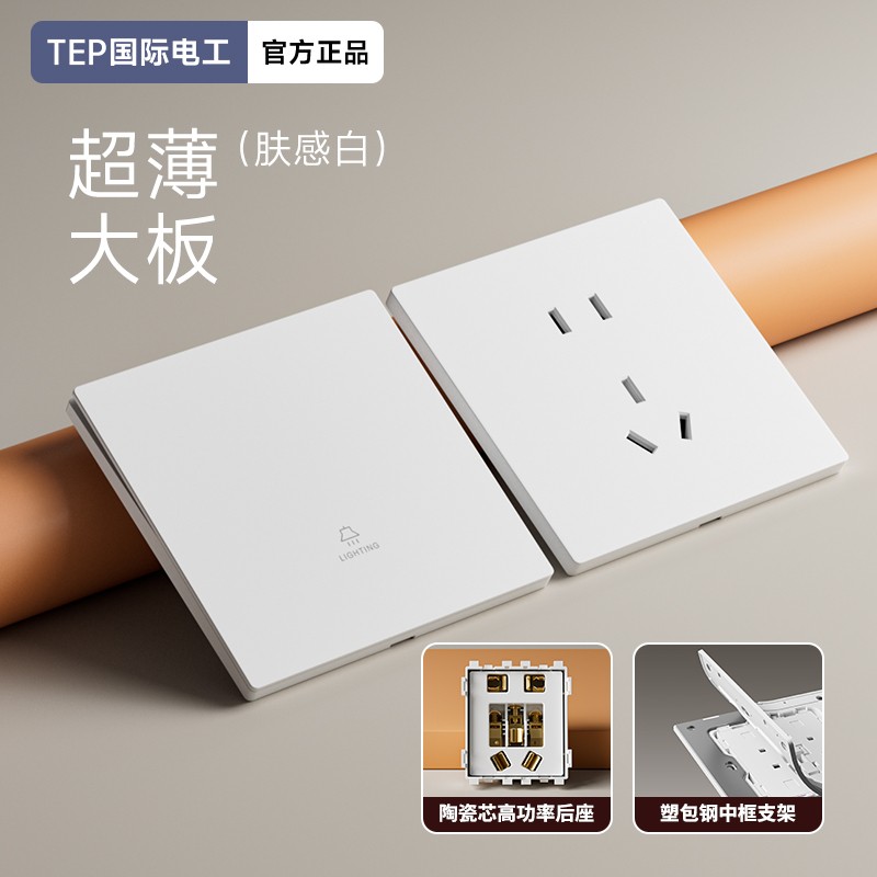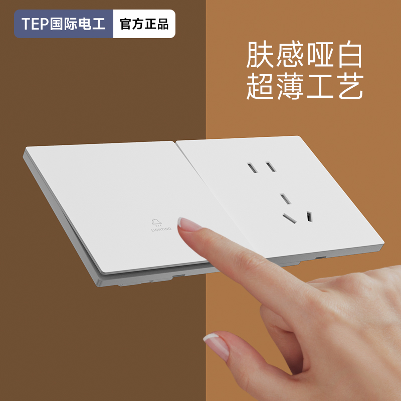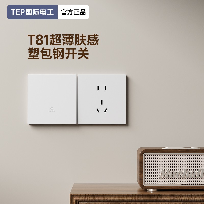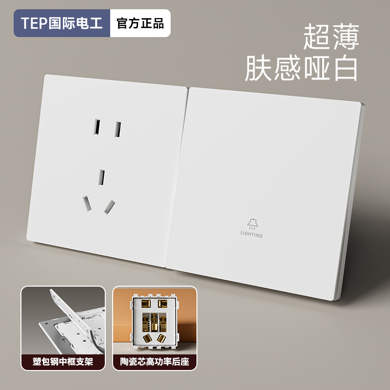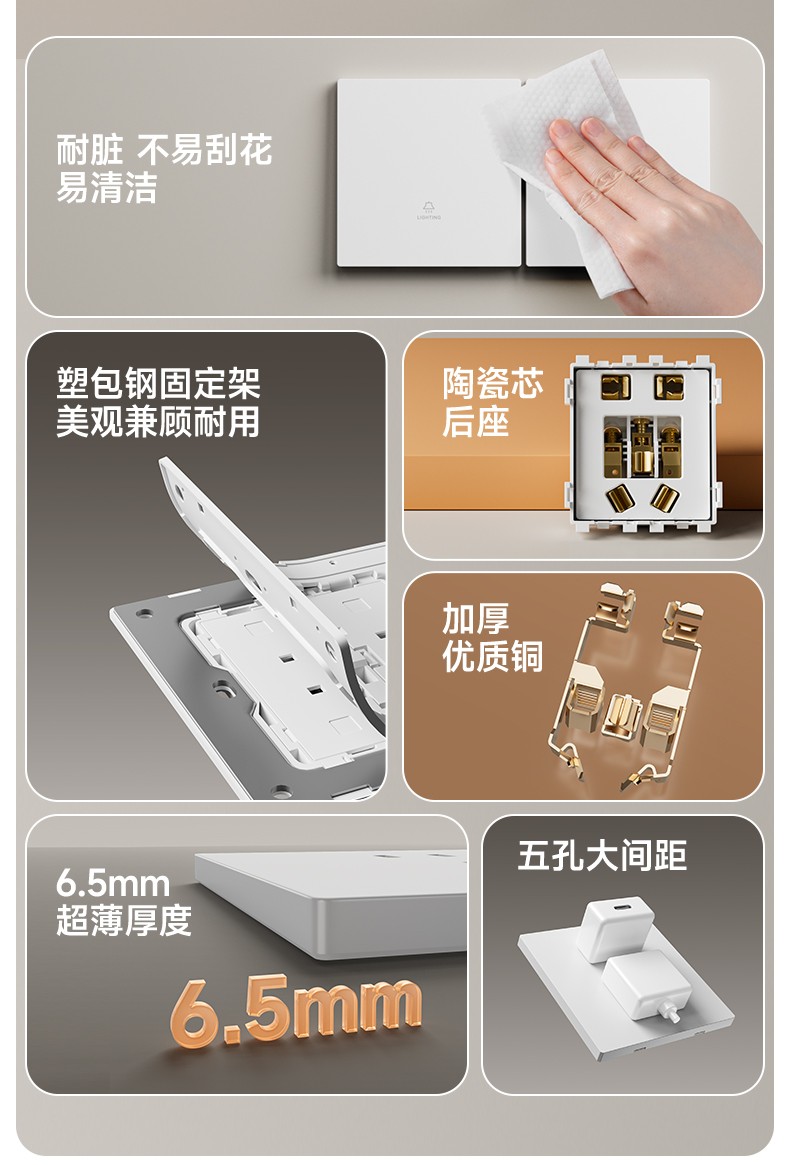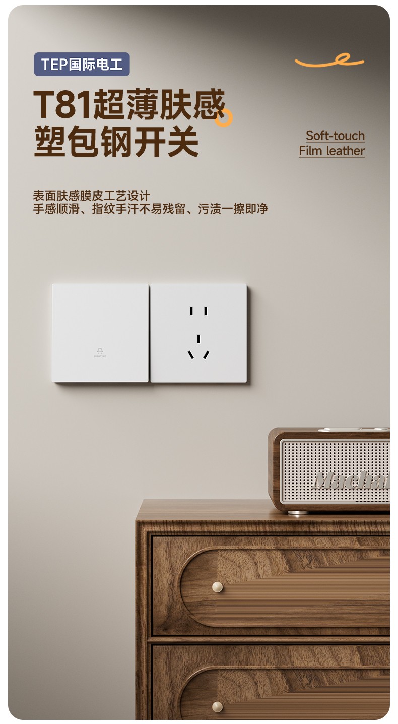 T81超薄肤感塑包钢开关 表面肤感膜皮工艺设计手感顺滑、指纹手汗不易残留、污渍一擦即净净 塑包钢固定架美观兼顾耐用 陶瓷芯后座 加厚优质铜 6.5mm超薄厚度 五孔大间距