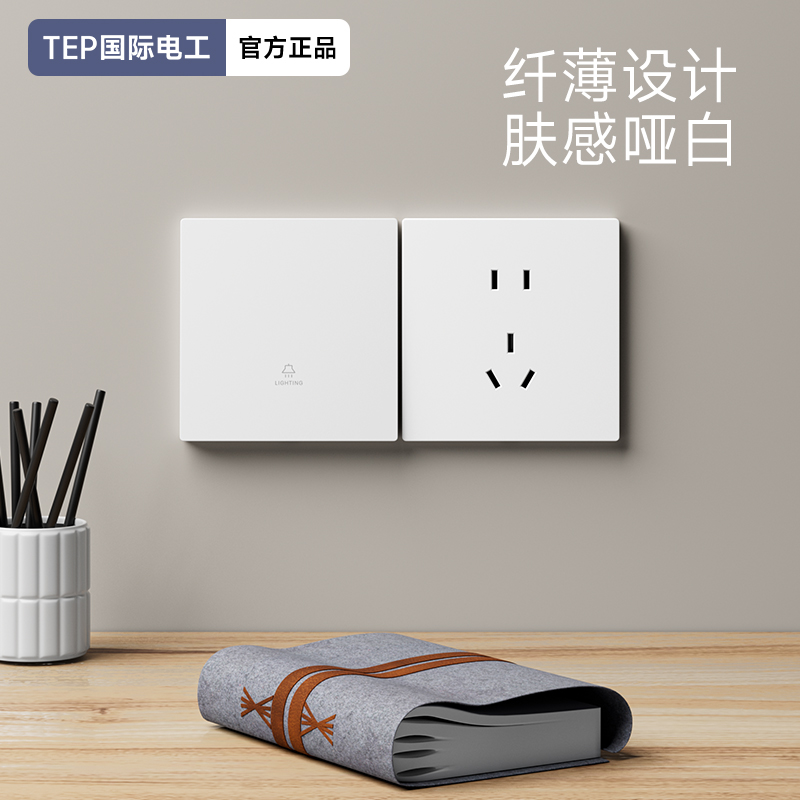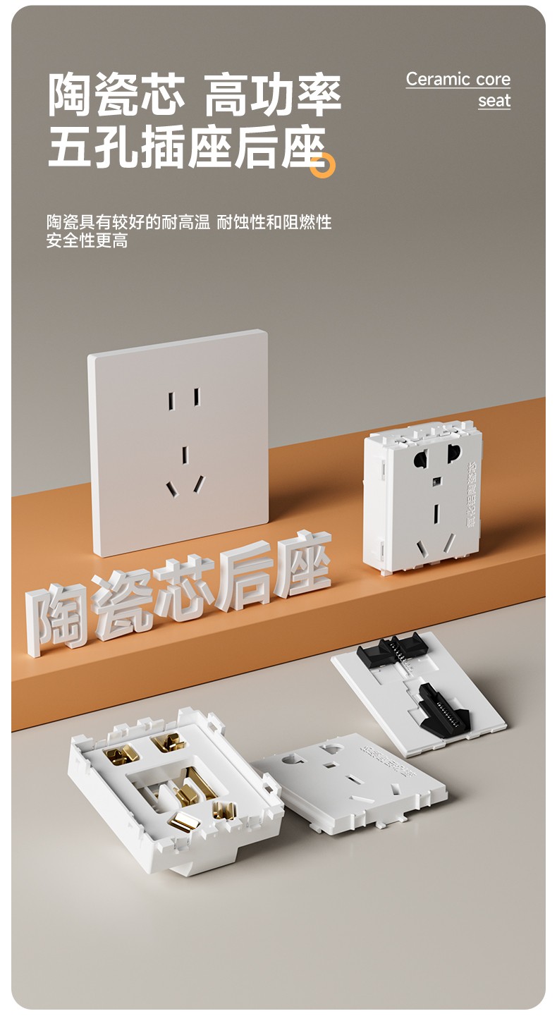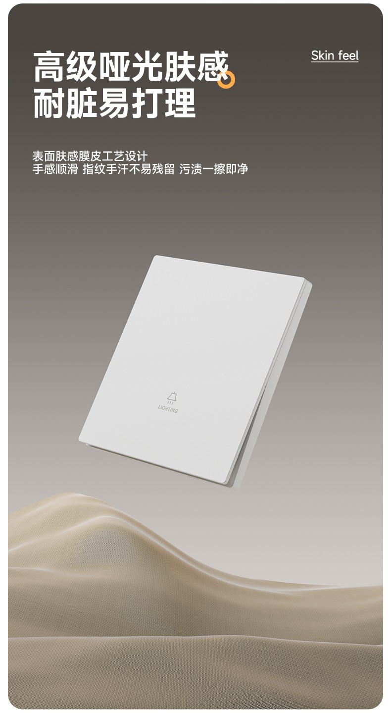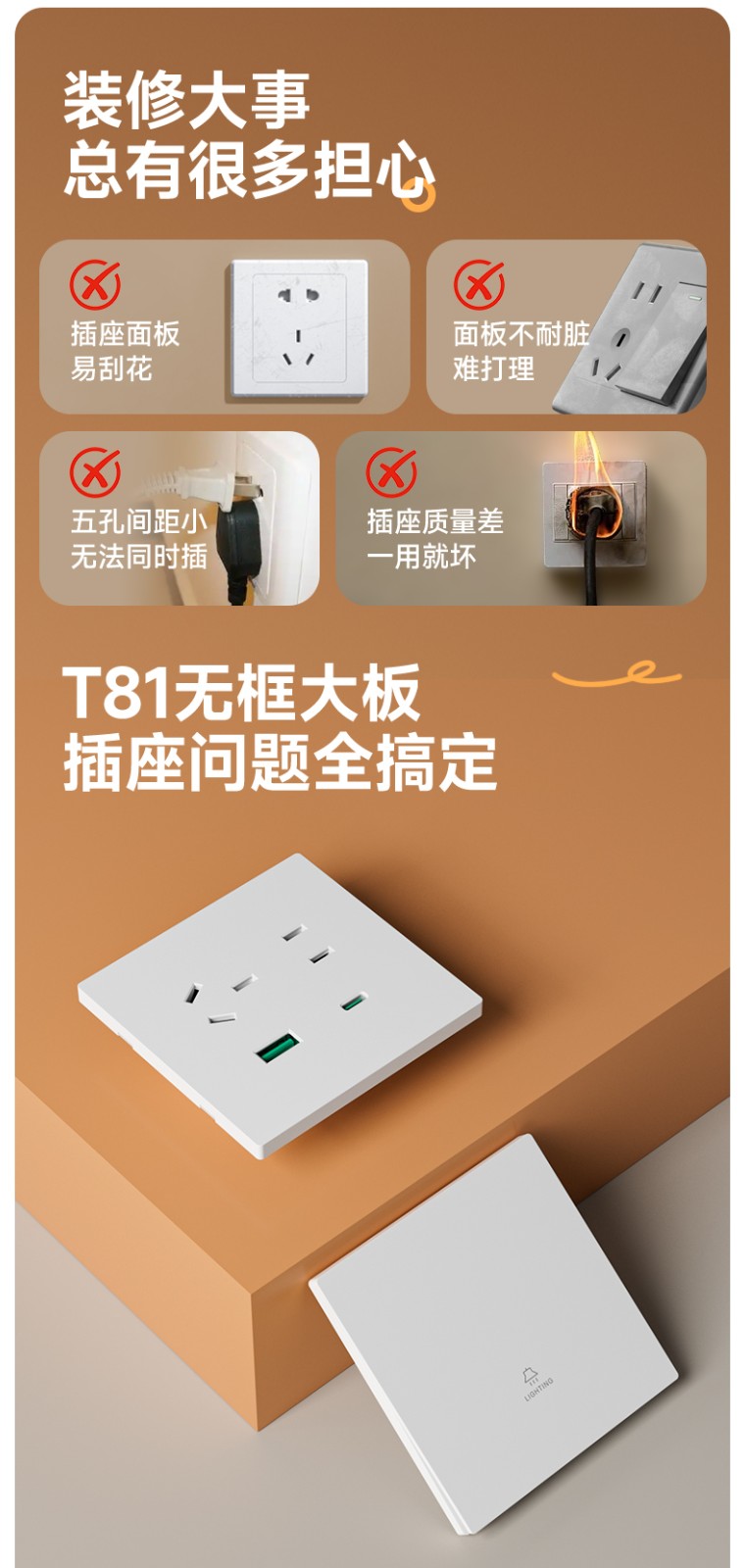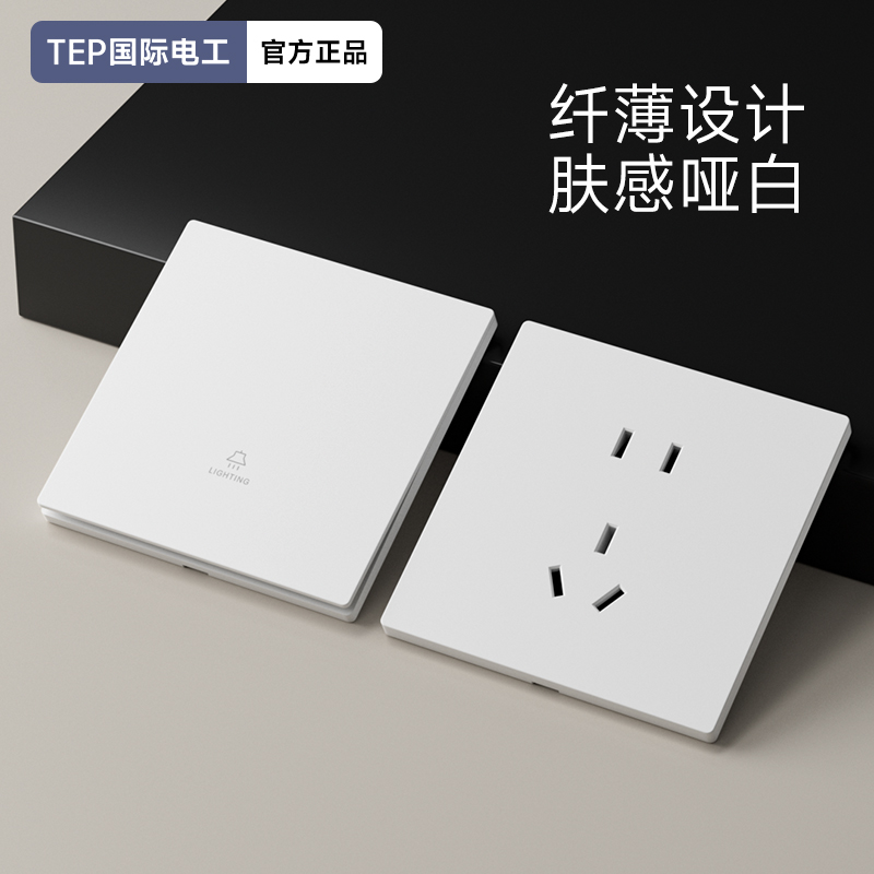 T81超薄肤感塑包钢开关 表面肤感膜皮工艺设计手感顺滑、指纹手汗不易残留、污渍一擦即净净 塑包钢固定架美观兼顾耐用 陶瓷芯后座 加厚优质铜 6.5mm超薄厚度 五孔大间距
