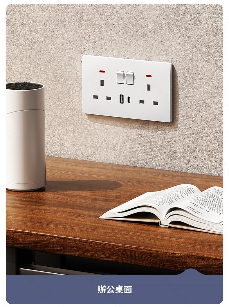 超薄弧面开关不仅适用于家庭卧室、客厅、书房,也完美融入办公桌边、酒店、商业空间等多元场景。其多国标准插孔设计,广泛兼容美标、英标、欧标、澳标等多种插头,满足国际化生活与商务需求。