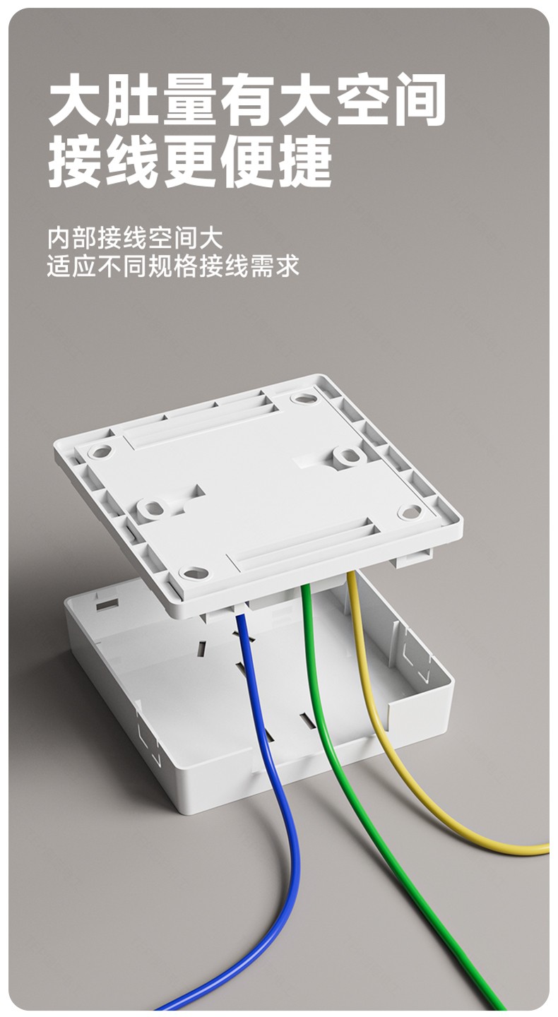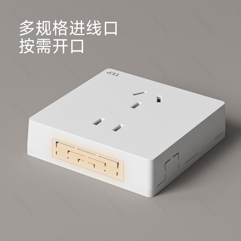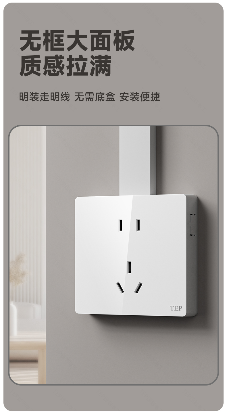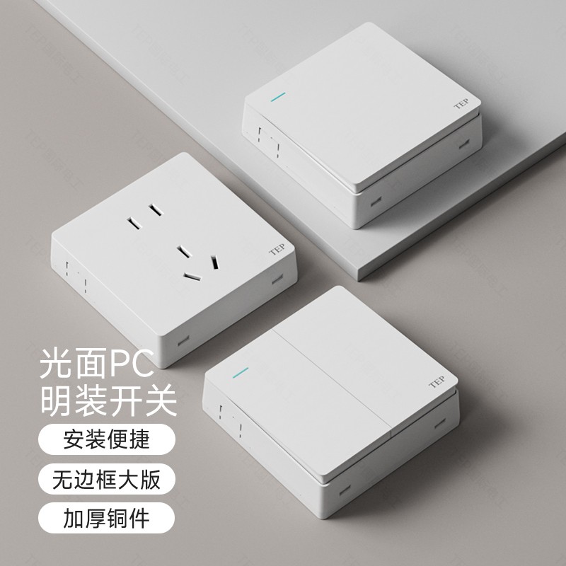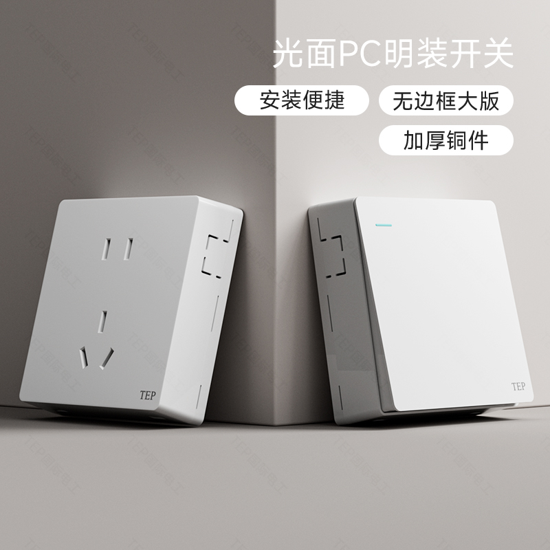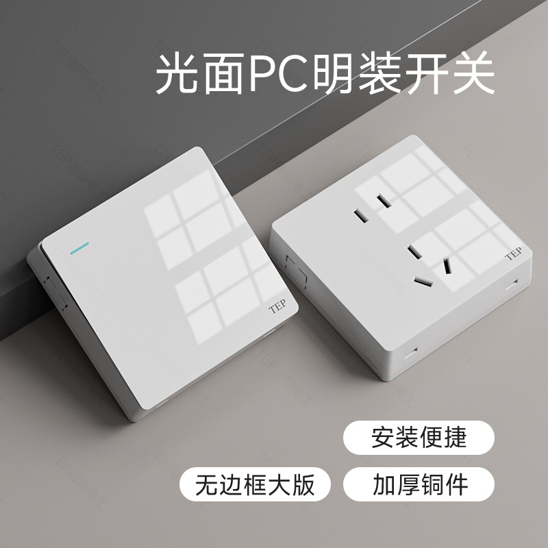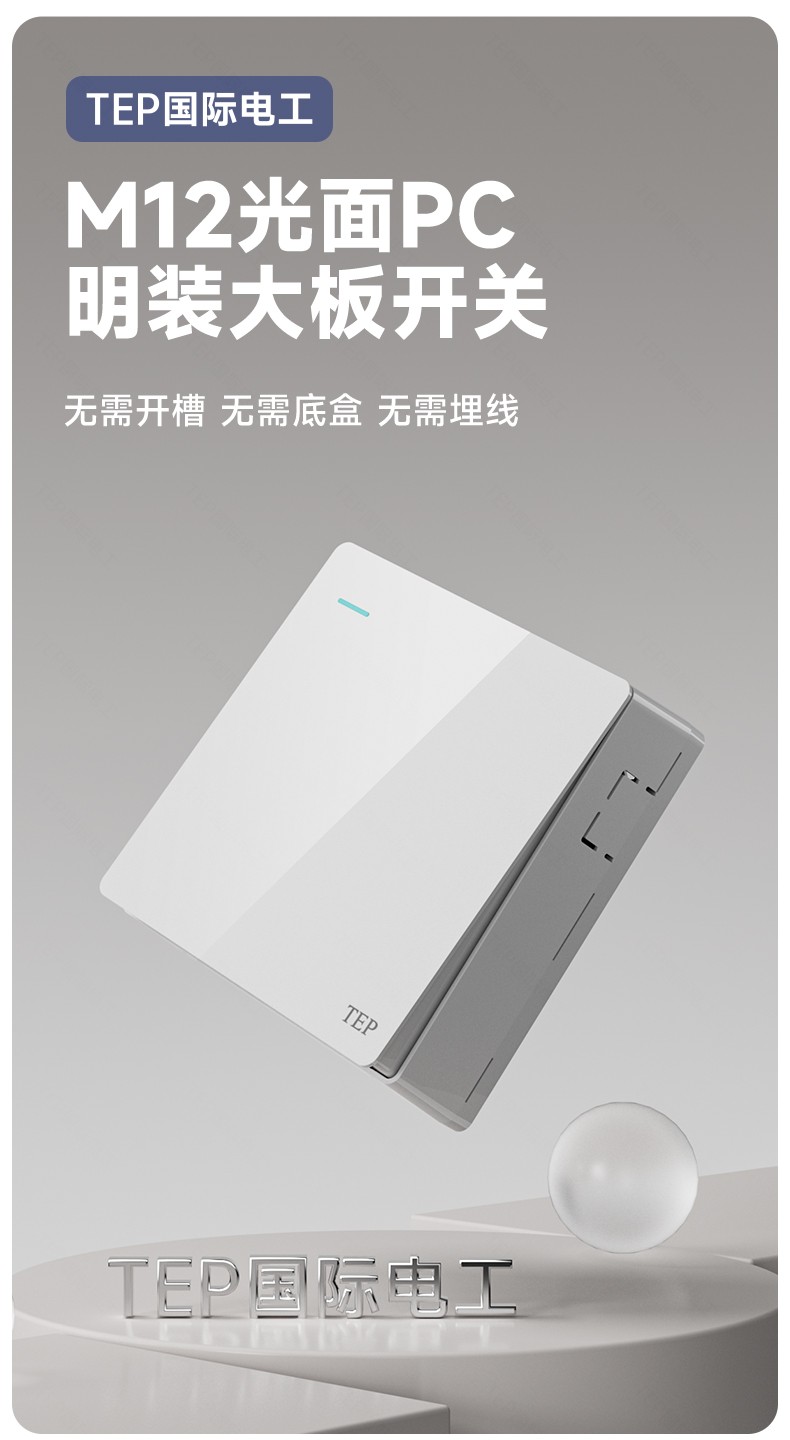 M12光面PC明装大板开关 无需开槽 无需底盒 无需埋线 核心大升级 多规格进线口 按需开口 40mm大间距插座 夜晚荧光 指示灯 内部接线空间超大 儿童保护单边无法插入
