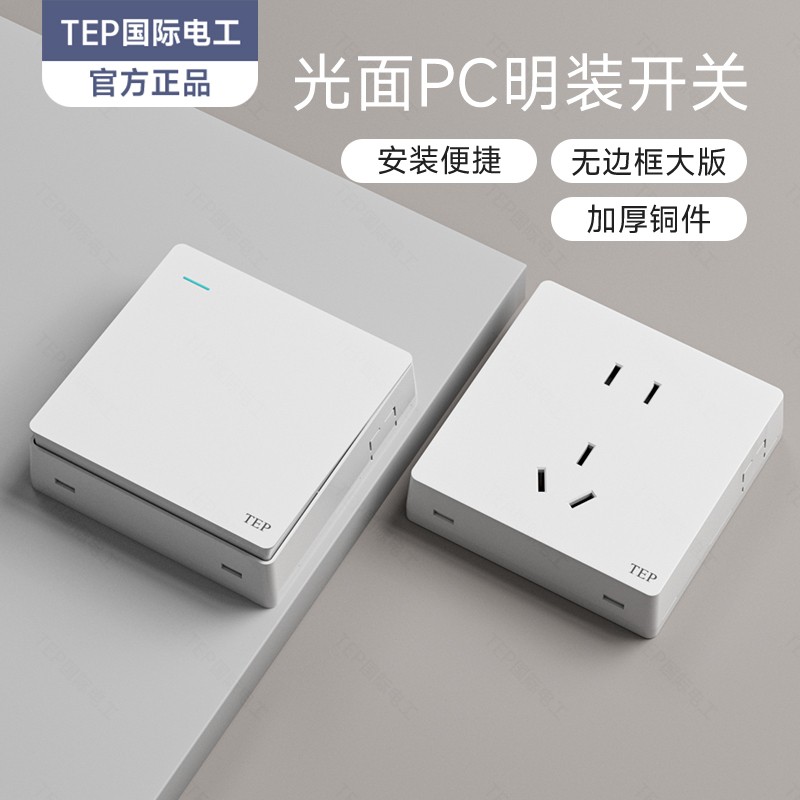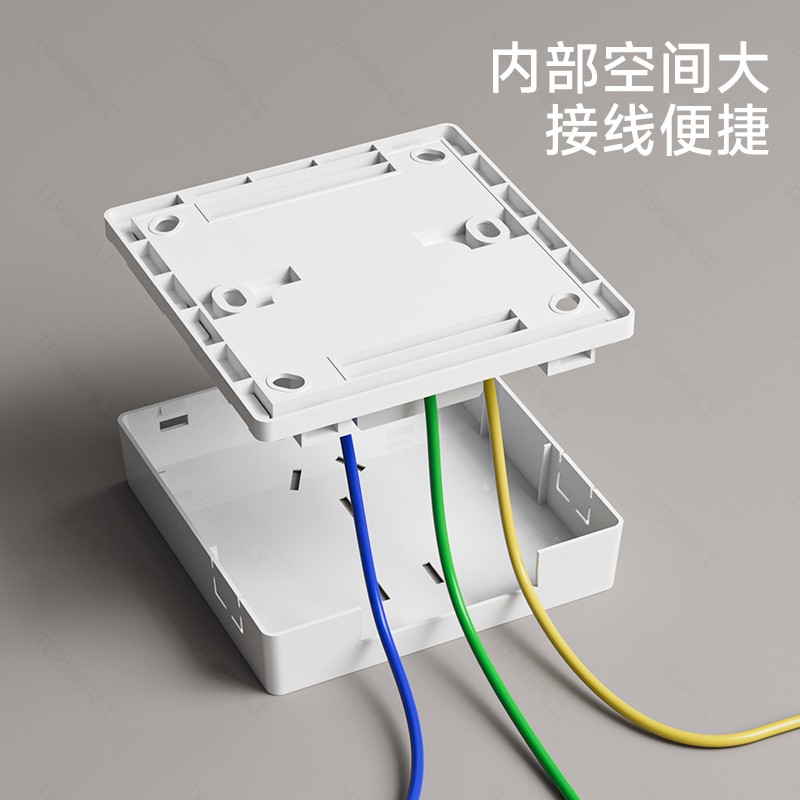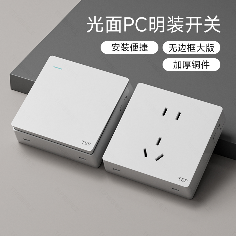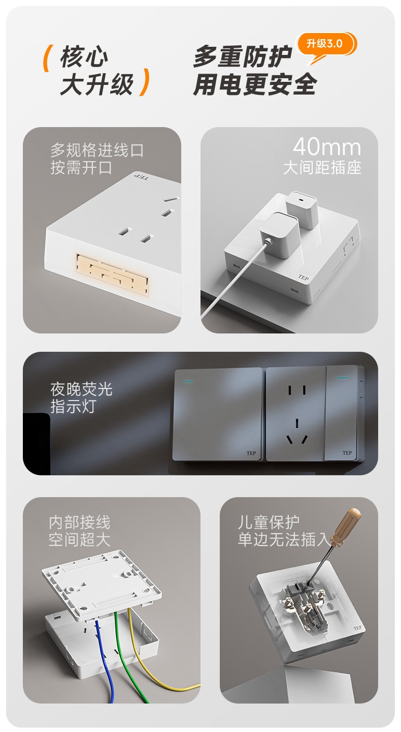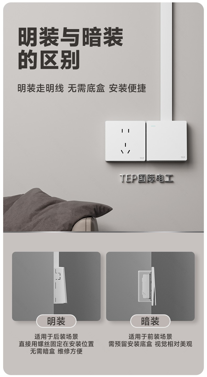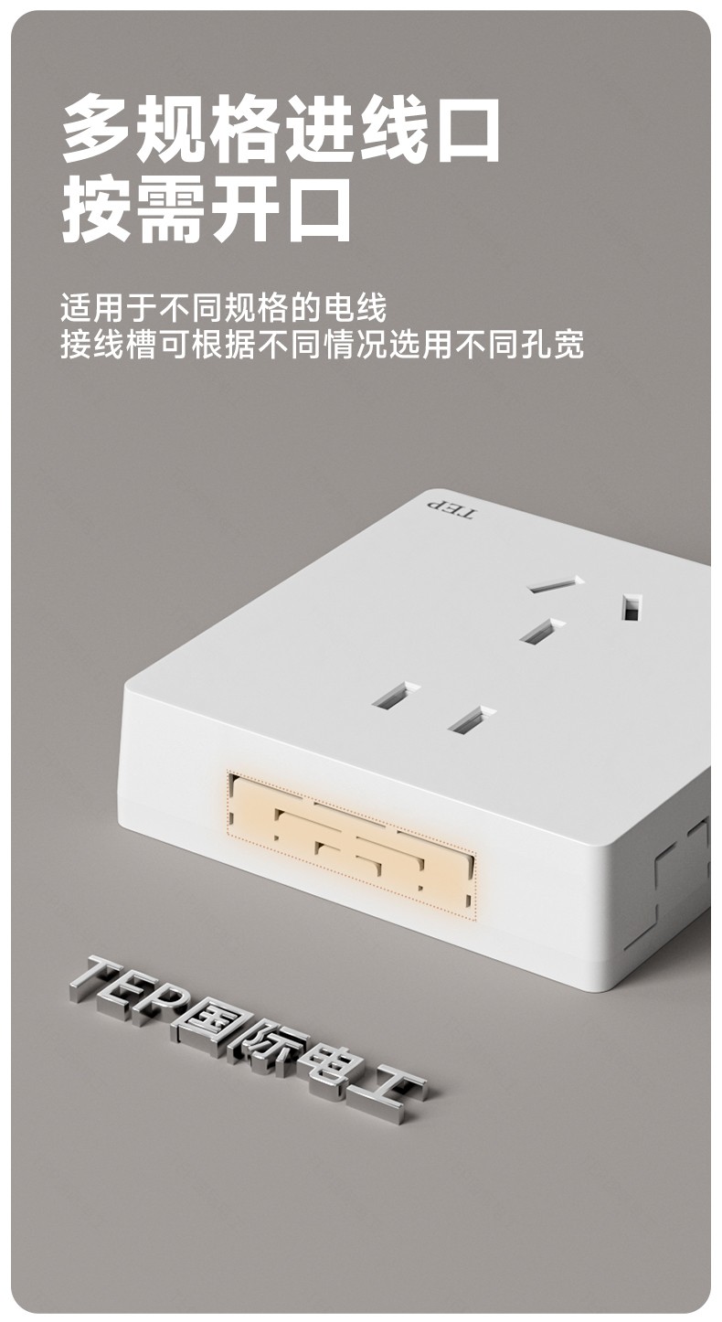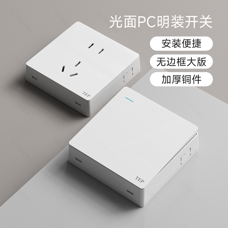 M12光面PC明装大板开关 无需开槽 无需底盒 无需埋线 核心大升级 多规格进线口 按需开口 40mm大间距插座 夜晚荧光 指示灯 内部接线空间超大 儿童保护单边无法插入