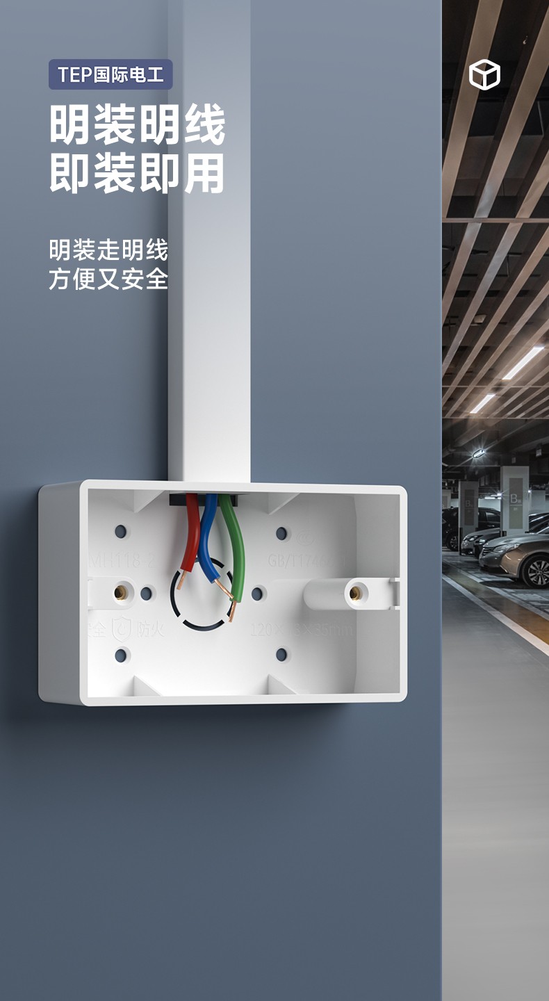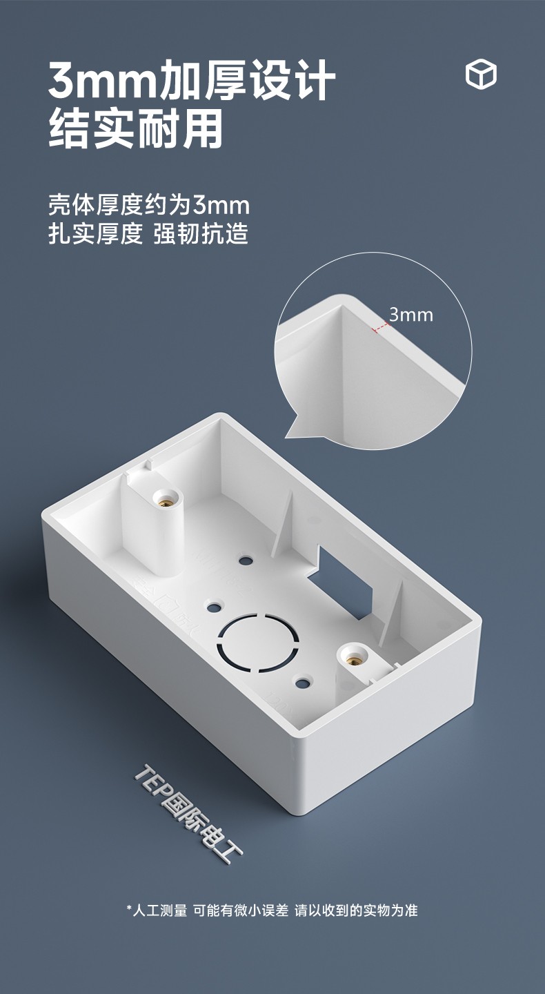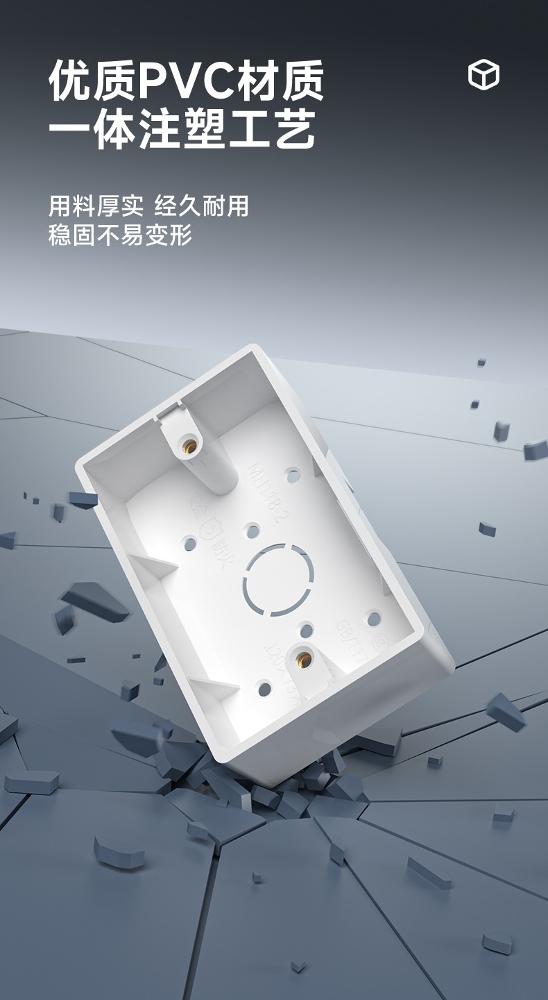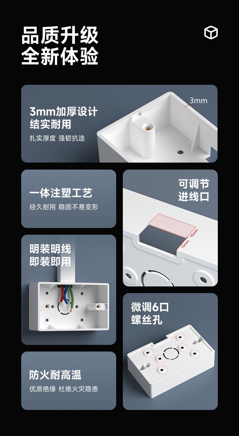 明装118型通用明线底盒 明装明线 升级抗压加厚设计 3mm加厚设计结实耐用 扎实厚度 强韧抗造 一体注塑工艺 可调节进线口 经久耐用 稳固不易变形 明装明线即装即用