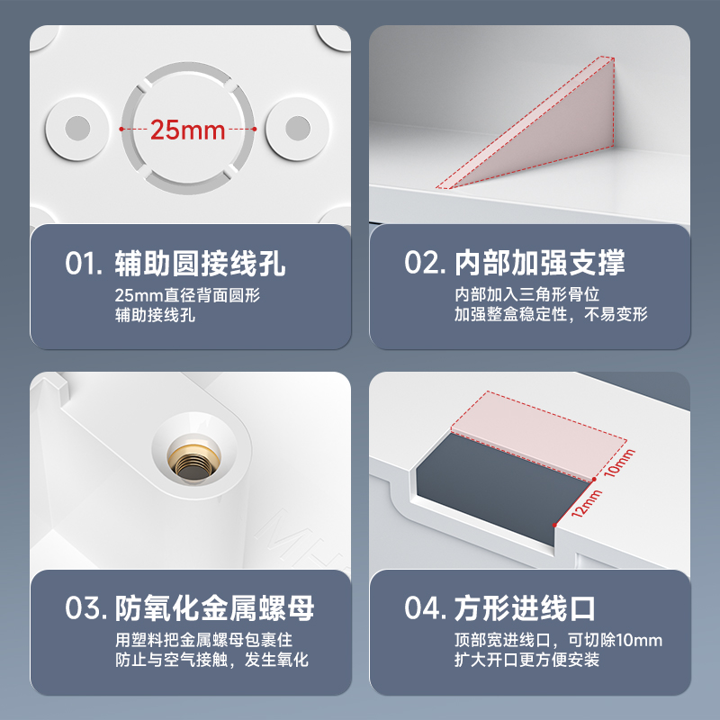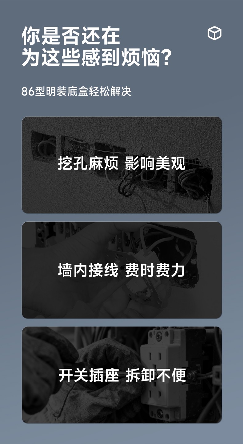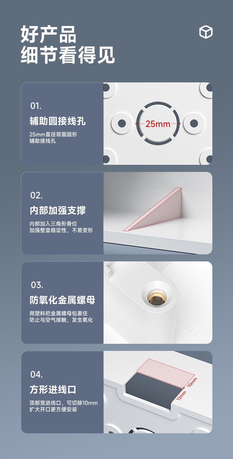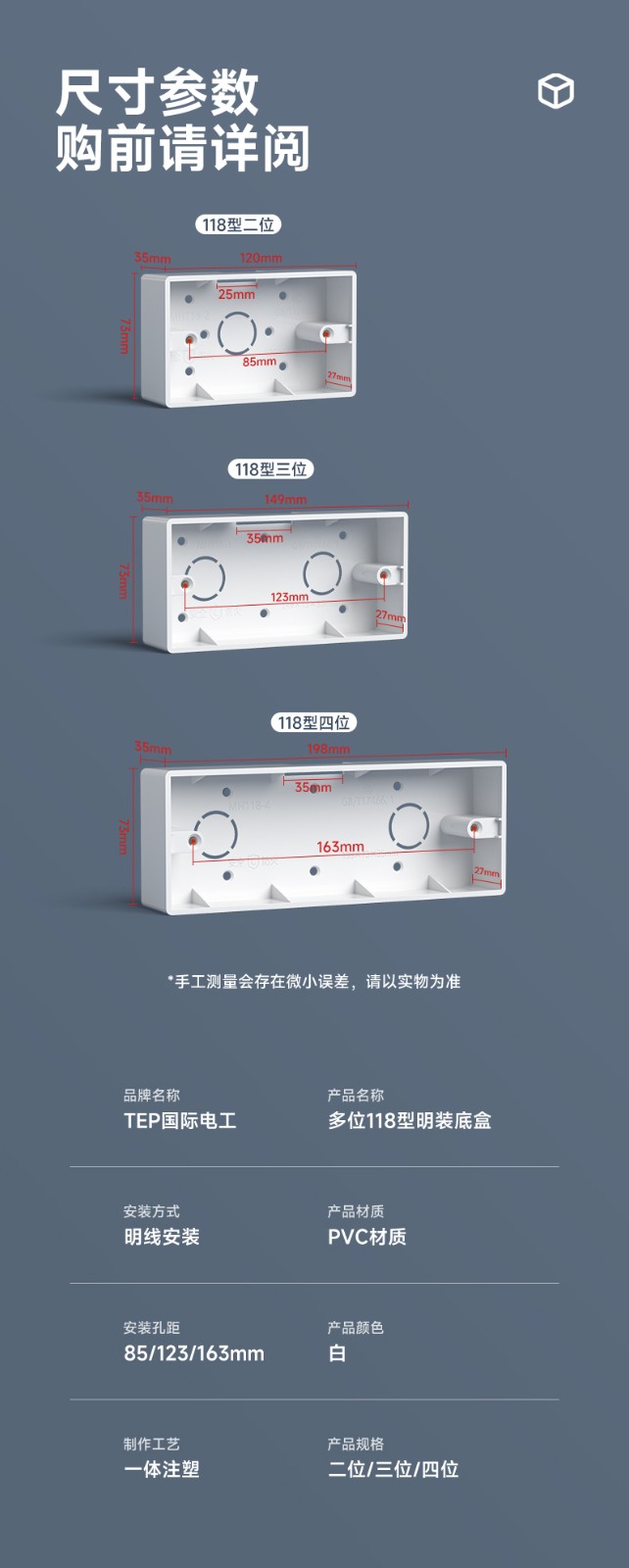 明装118型通用明线底盒 明装明线 升级抗压加厚设计 3mm加厚设计结实耐用 扎实厚度 强韧抗造 一体注塑工艺 可调节进线口 经久耐用 稳固不易变形 明装明线即装即用
