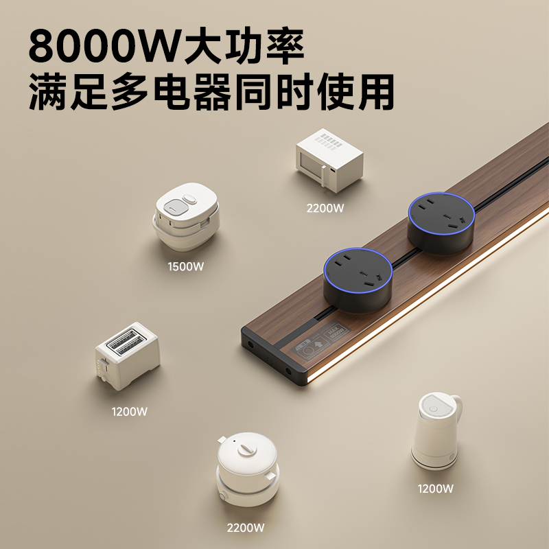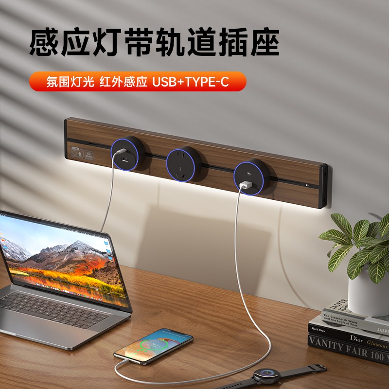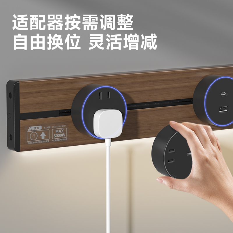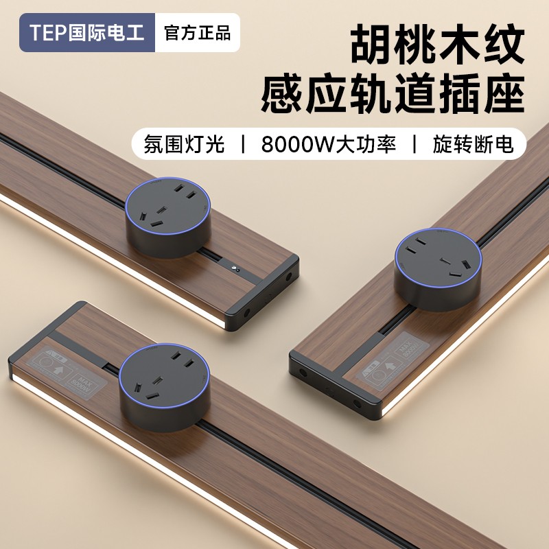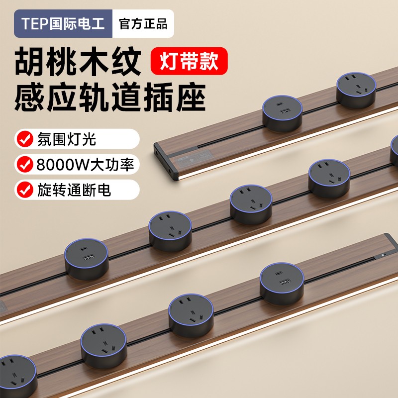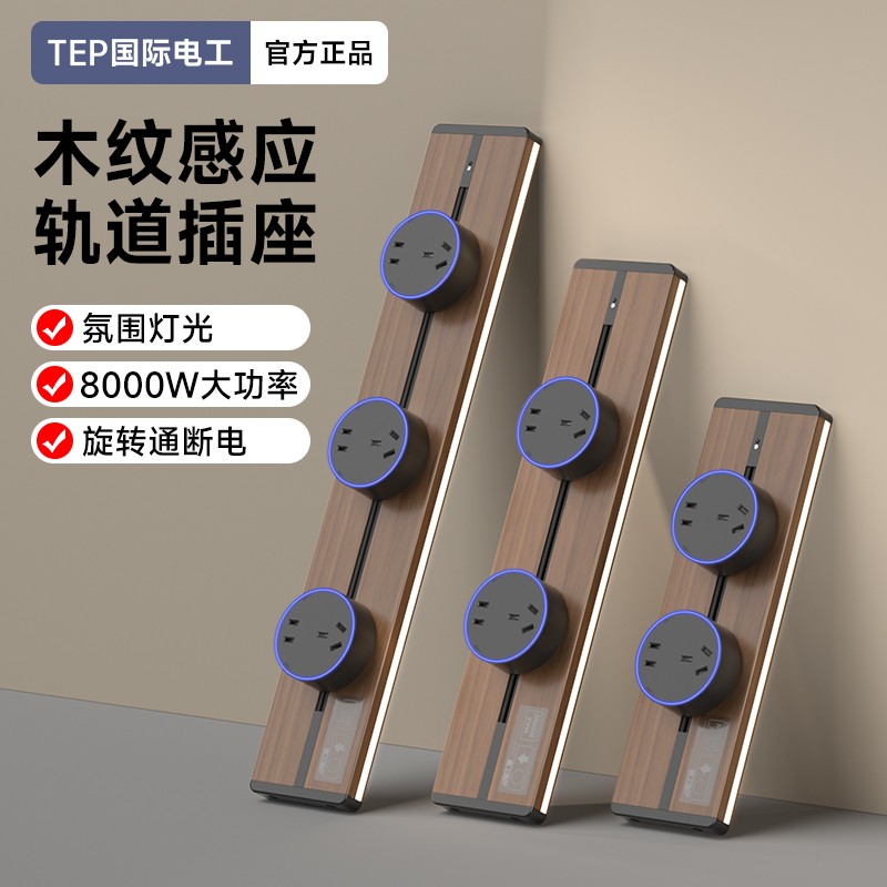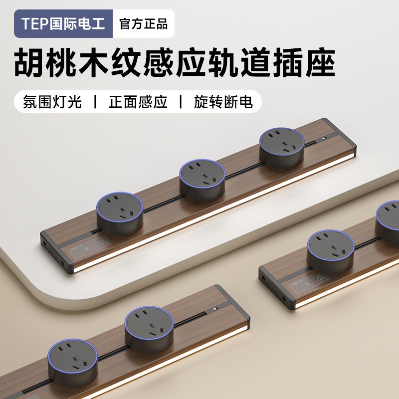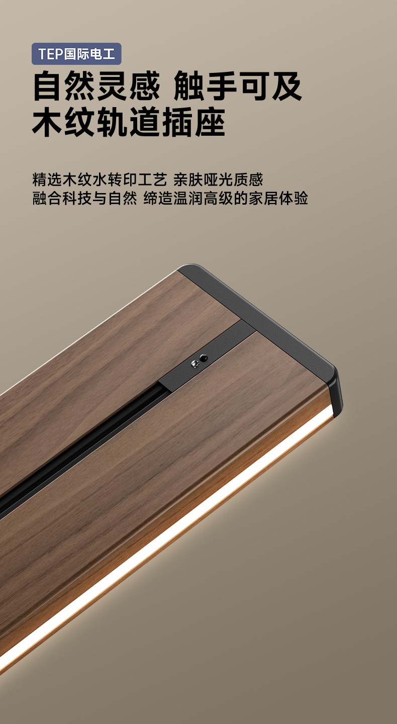 胡桃木纹感应轨道插座(灯带款) 氛围灯光 |正面感应 |旋转断电 仿胡桃木纹感应灯带轨道插座 仿木纹铝制轨道 8000W大功率感应氛围灯 五孔大间距 让二、三插头和谐共处实现真正的高效用电