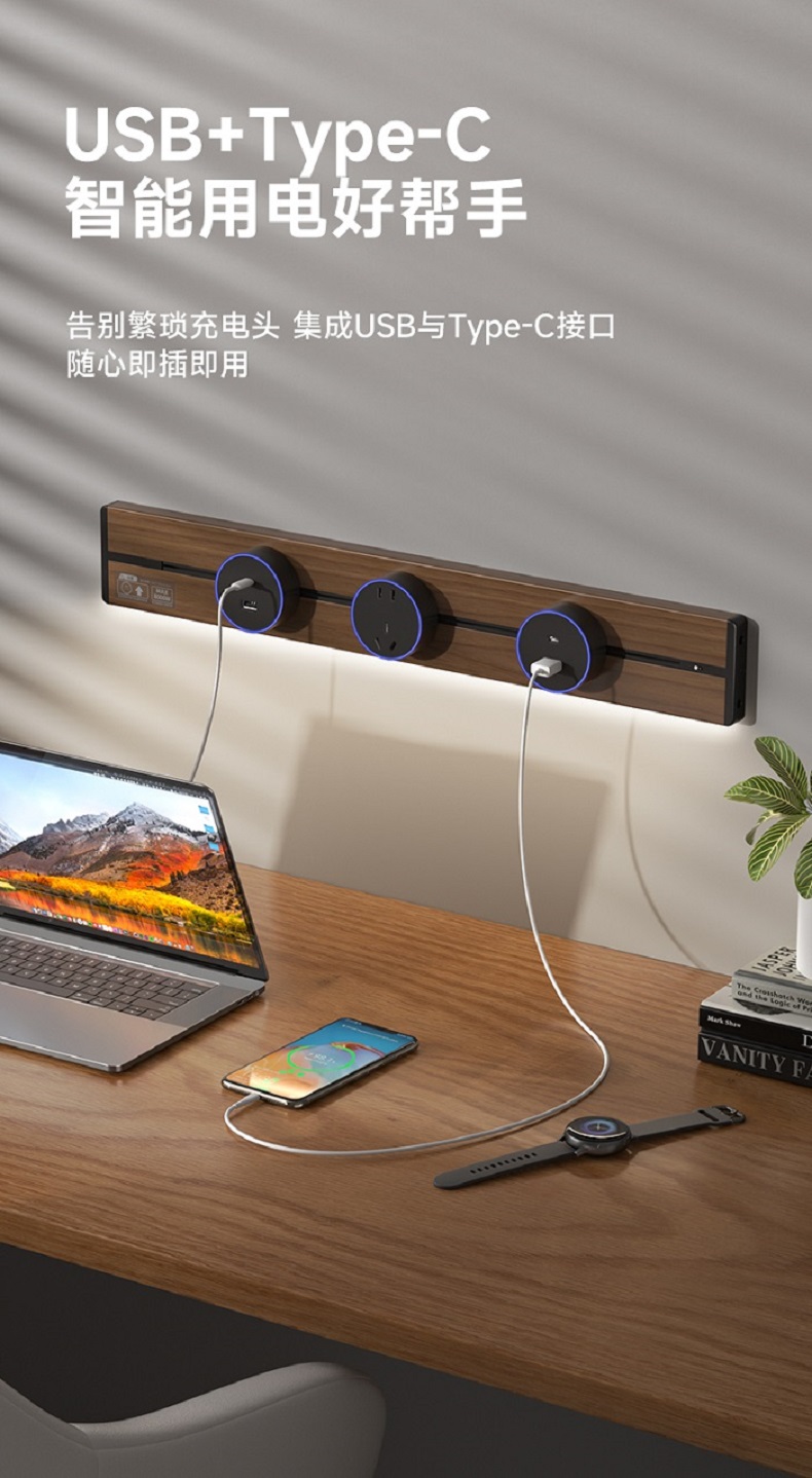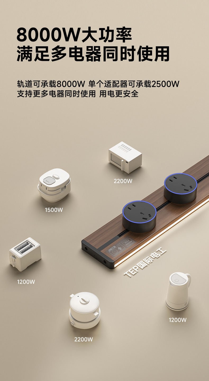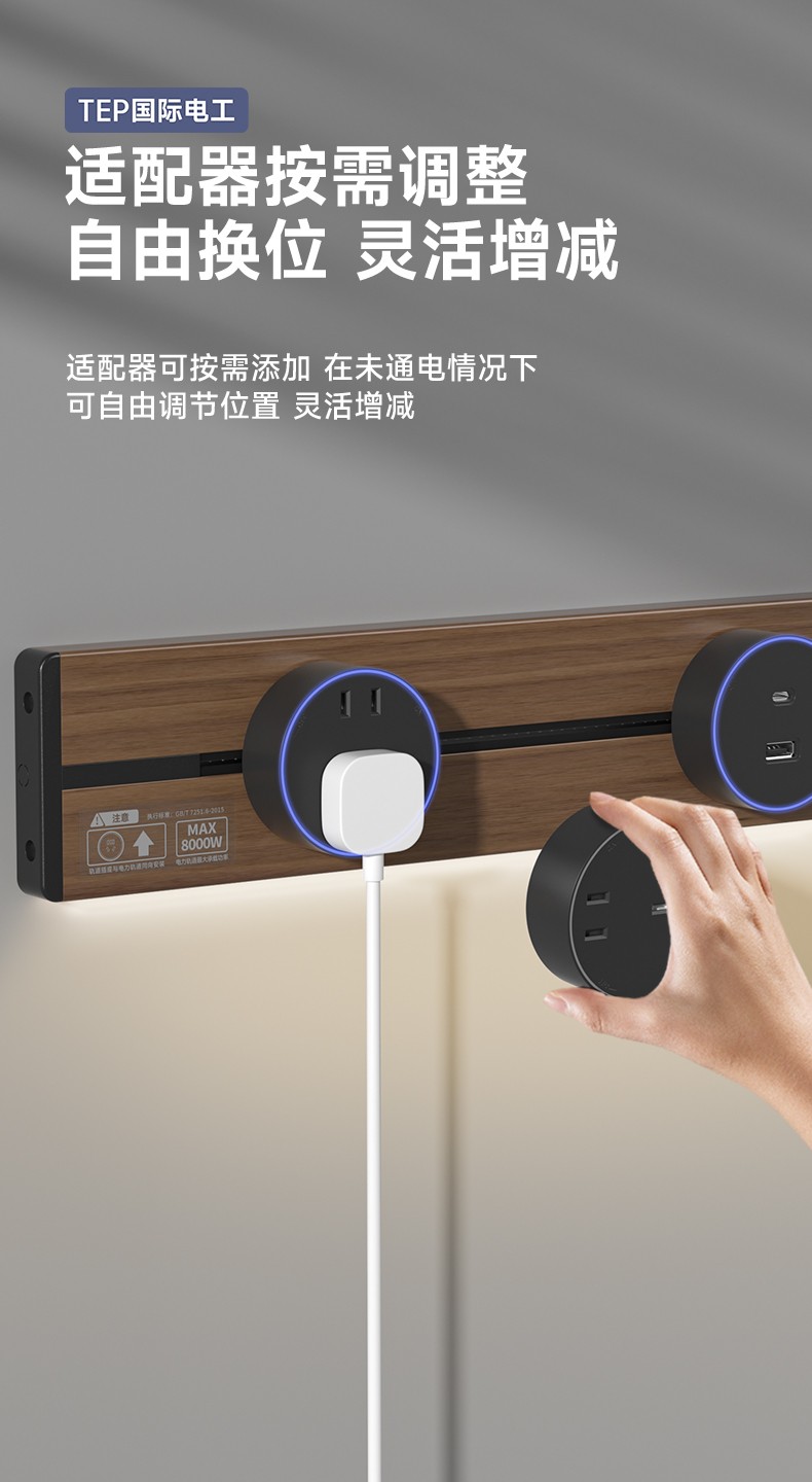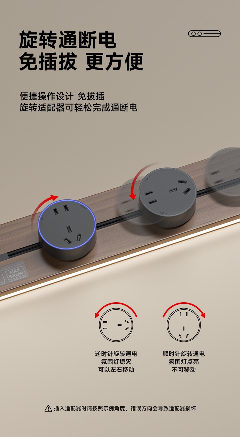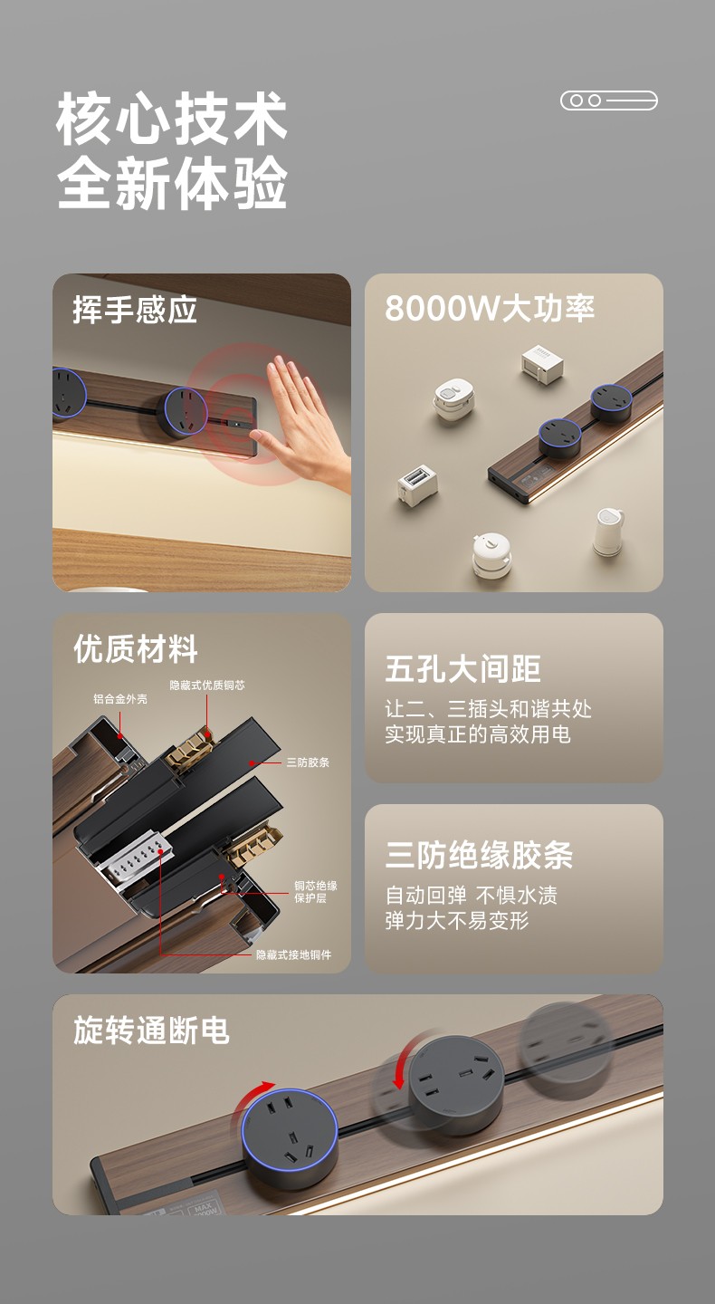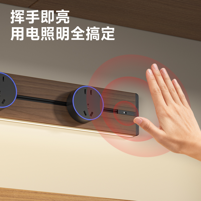 胡桃木纹感应轨道插座(灯带款) 氛围灯光 |正面感应 |旋转断电 仿胡桃木纹感应灯带轨道插座 仿木纹铝制轨道 8000W大功率感应氛围灯 五孔大间距 让二、三插头和谐共处实现真正的高效用电