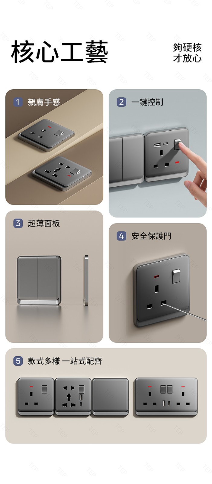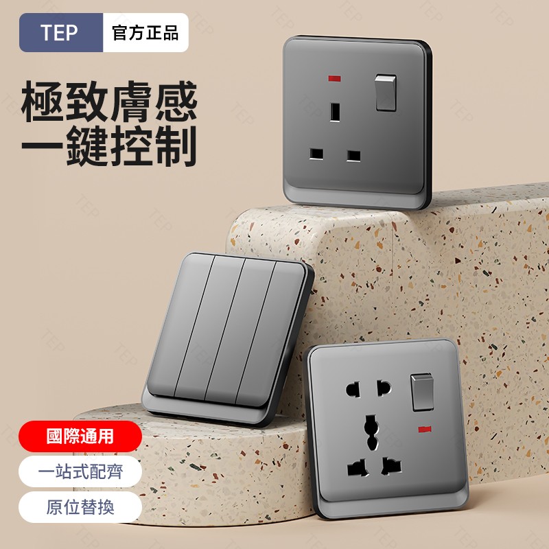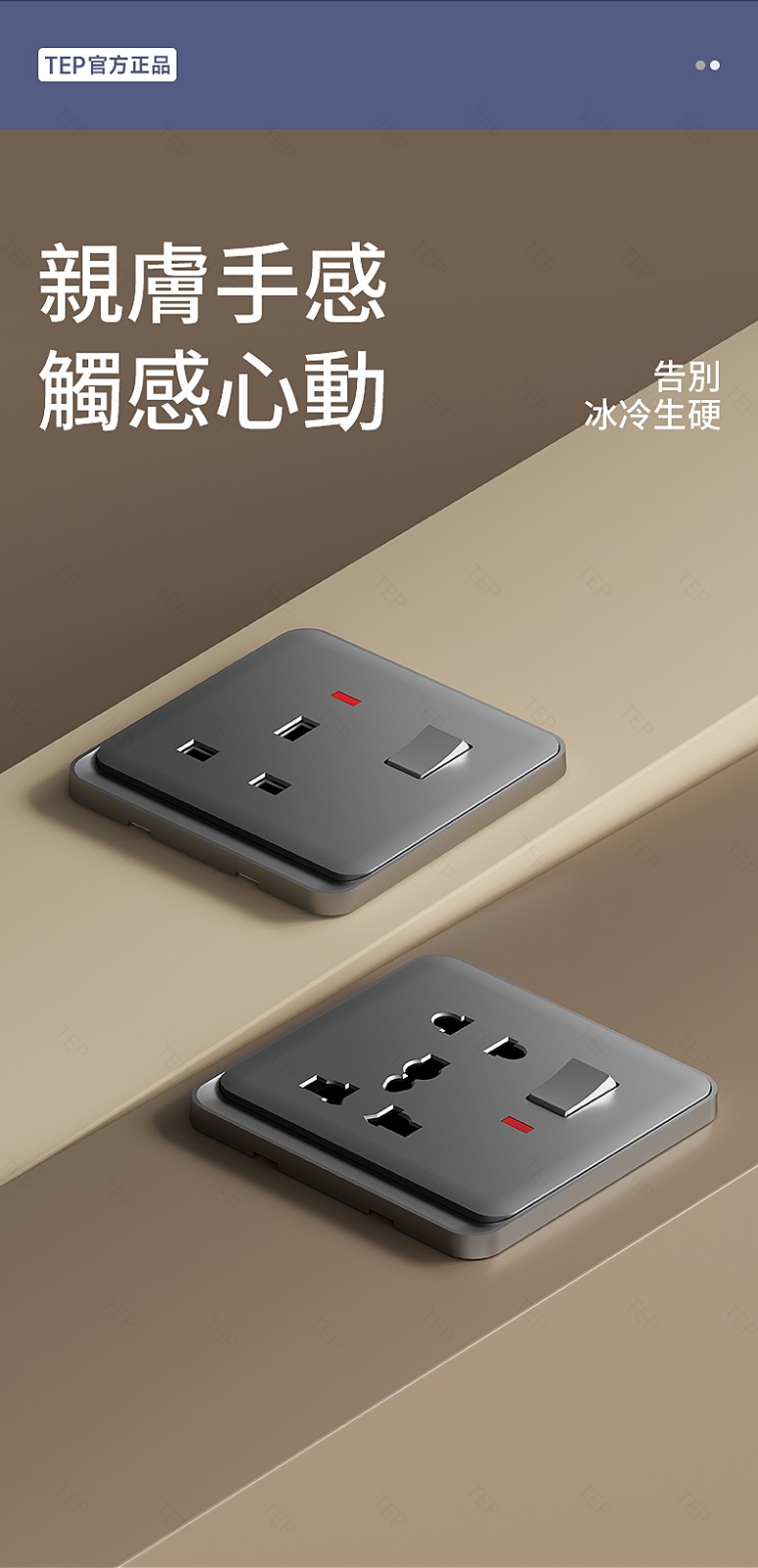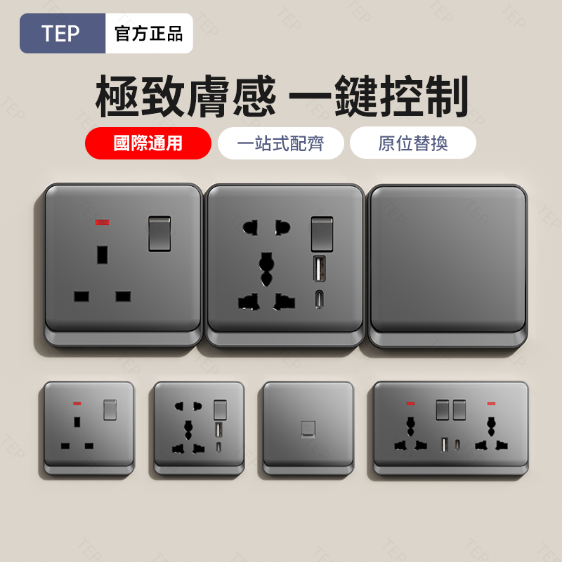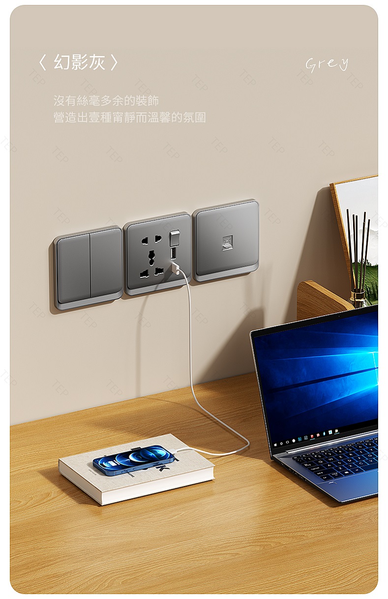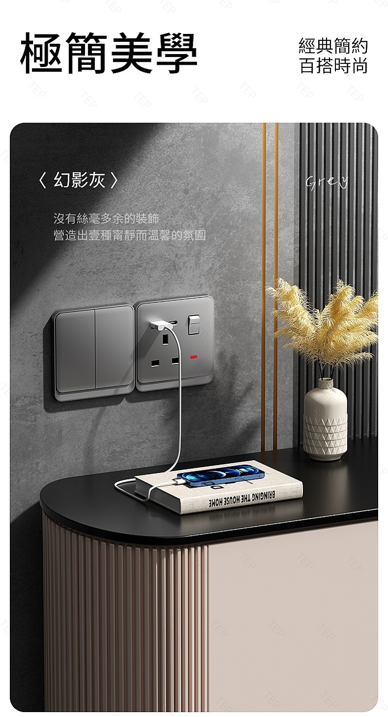 L6【PC膚感灰】開關插座膚感極致體驗 全球通用用電無憂 肤感灰 核心工藝 夠硬核 親膚手感 一鍵控制 才放心 超薄面板 安全保護門 款式多樣 一站式配齊
