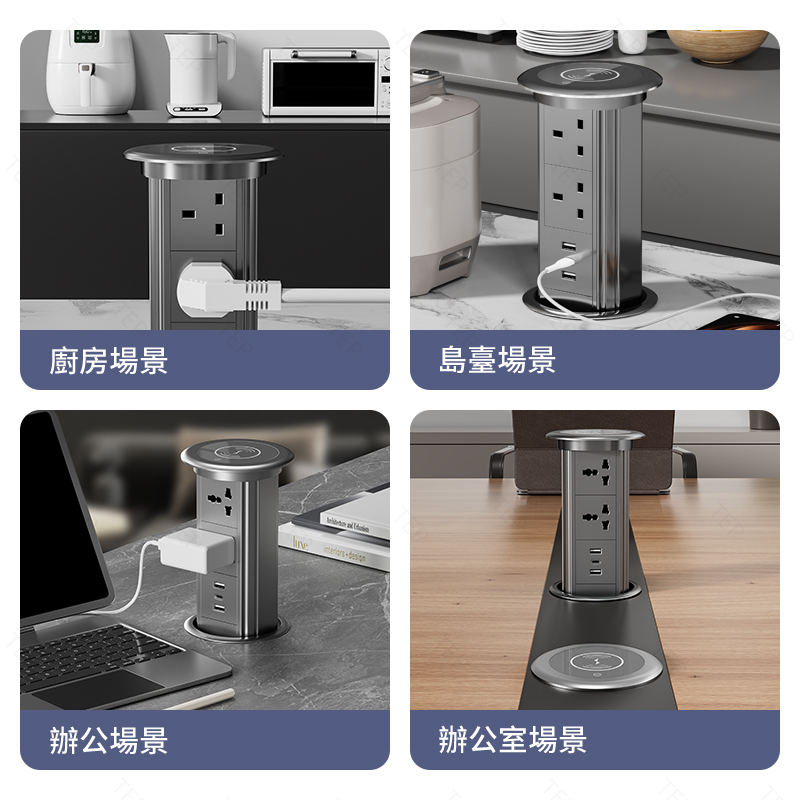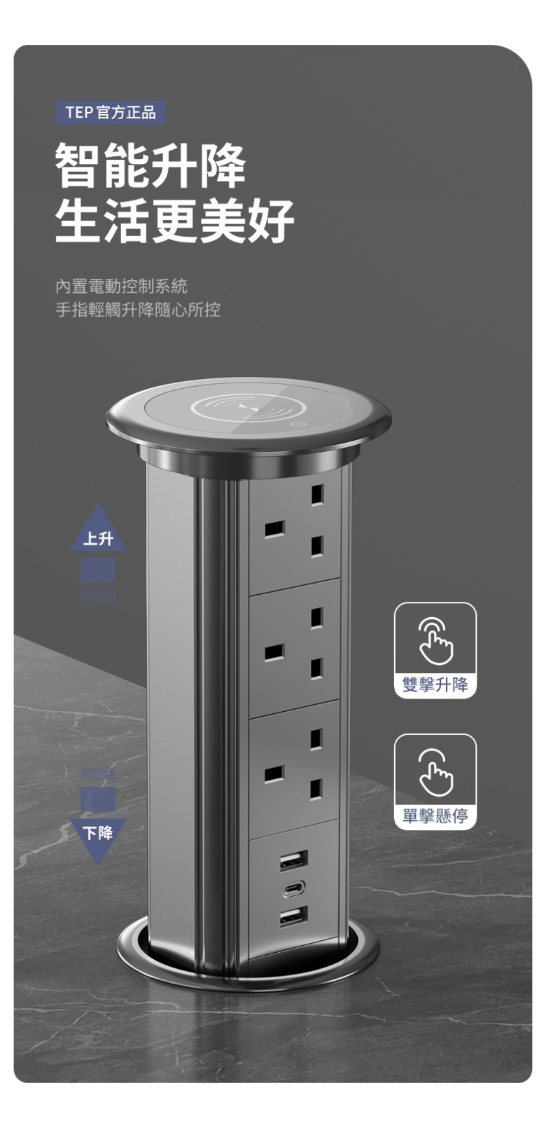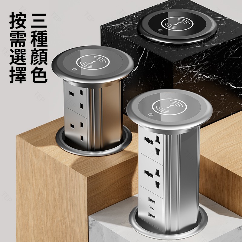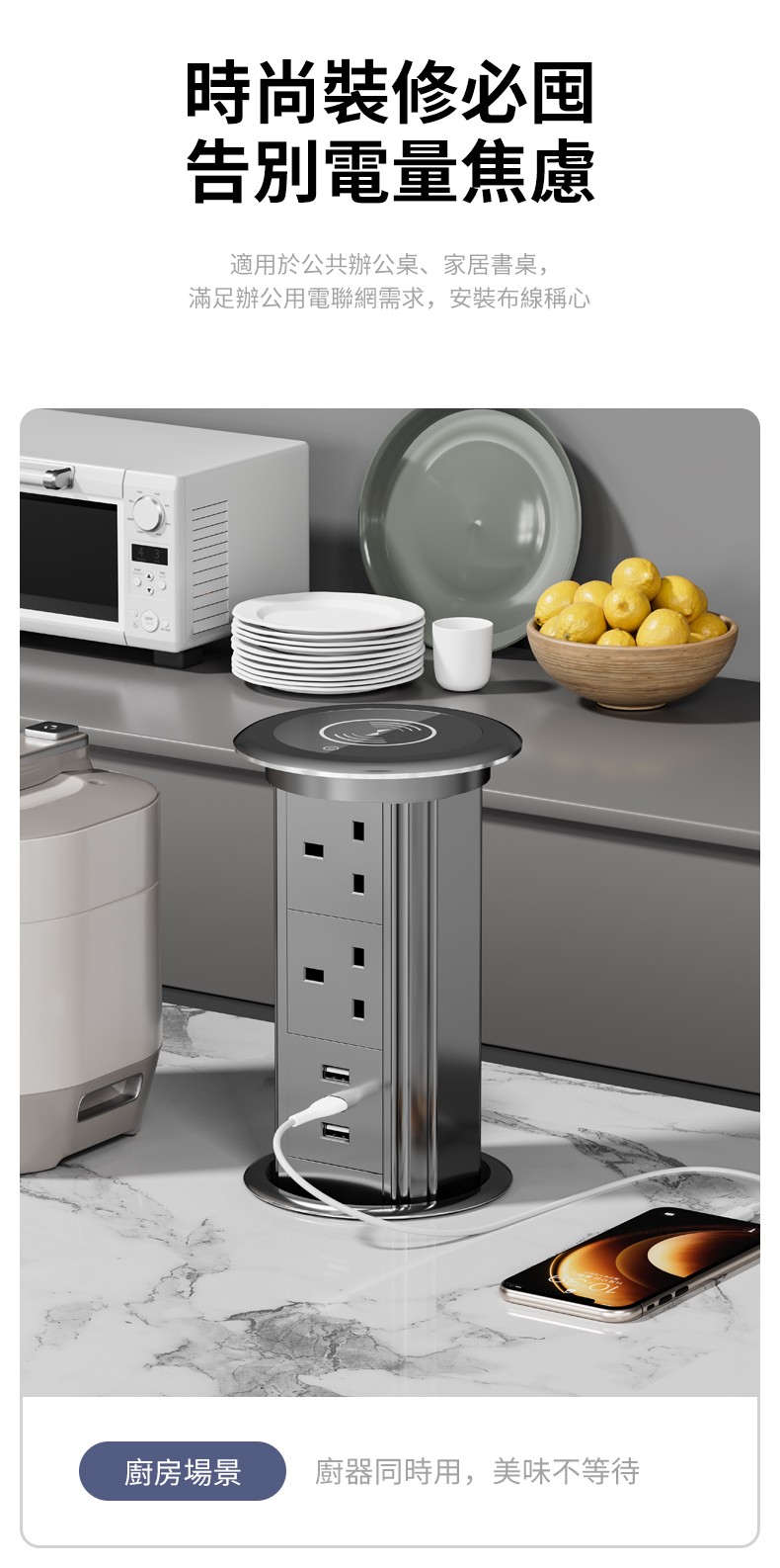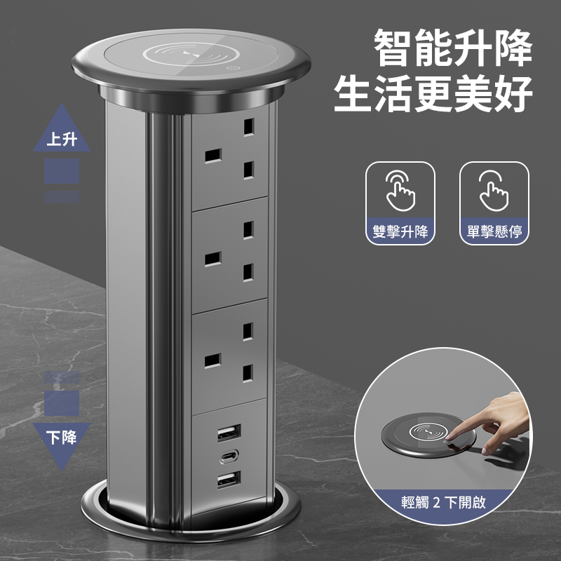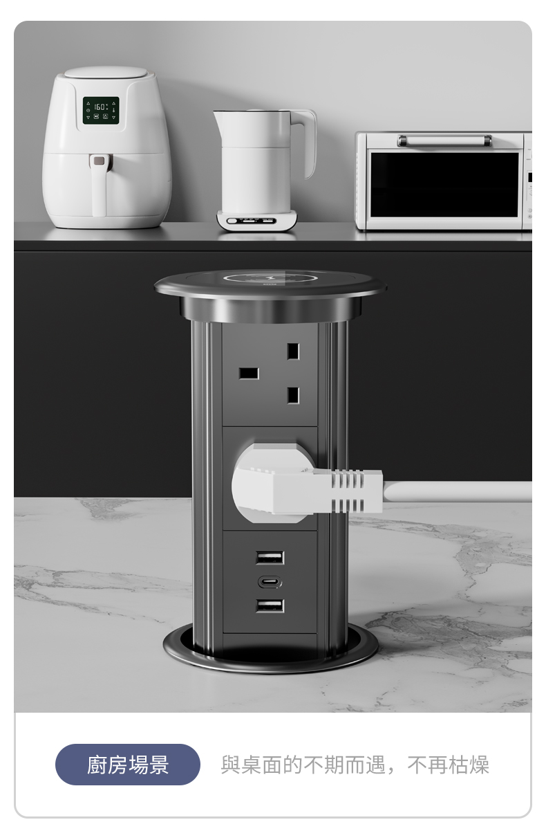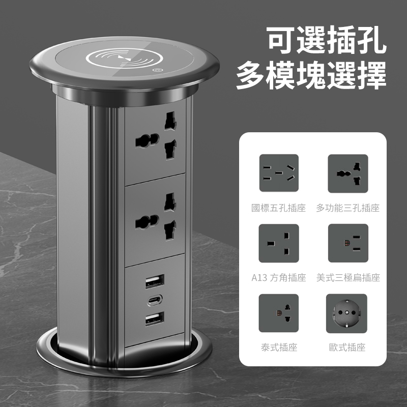 電動升降插座 高效充電智能保護 無線充電 輕觸開啟 無懼濺水 智能升降生活更美好 内置电动控制系统 手指轻触升降随心所控 可選插孔 國標五孔插座 歐式插座 美式三極扁插座 多功能三孔插座 泰式插座 A13方角插座 颜色:黑/灰/银