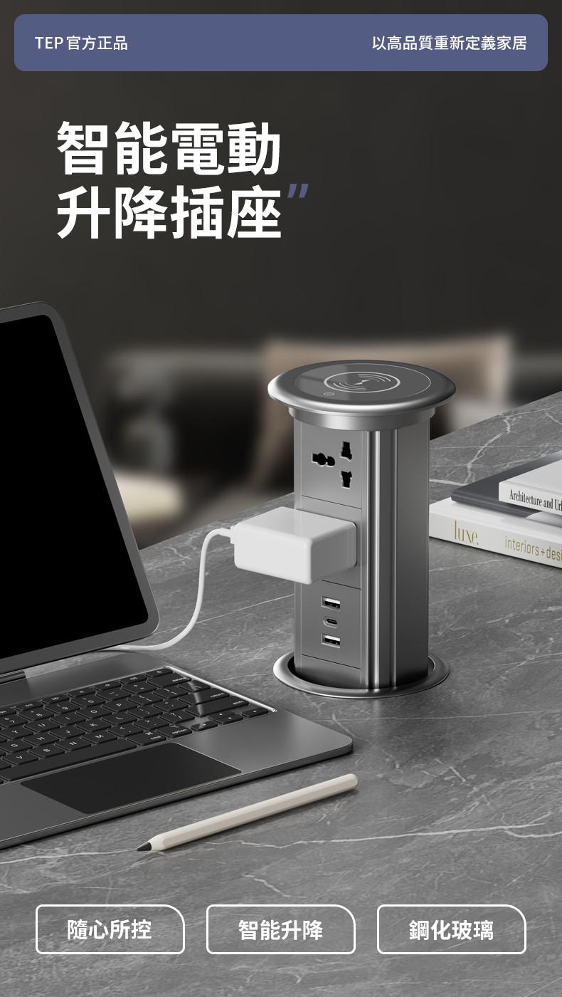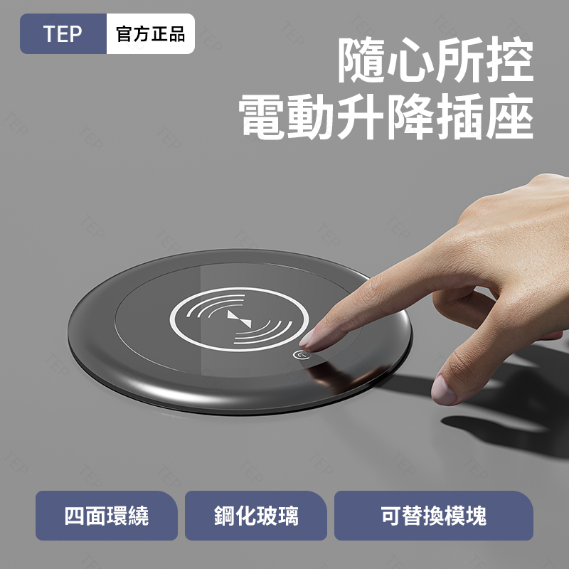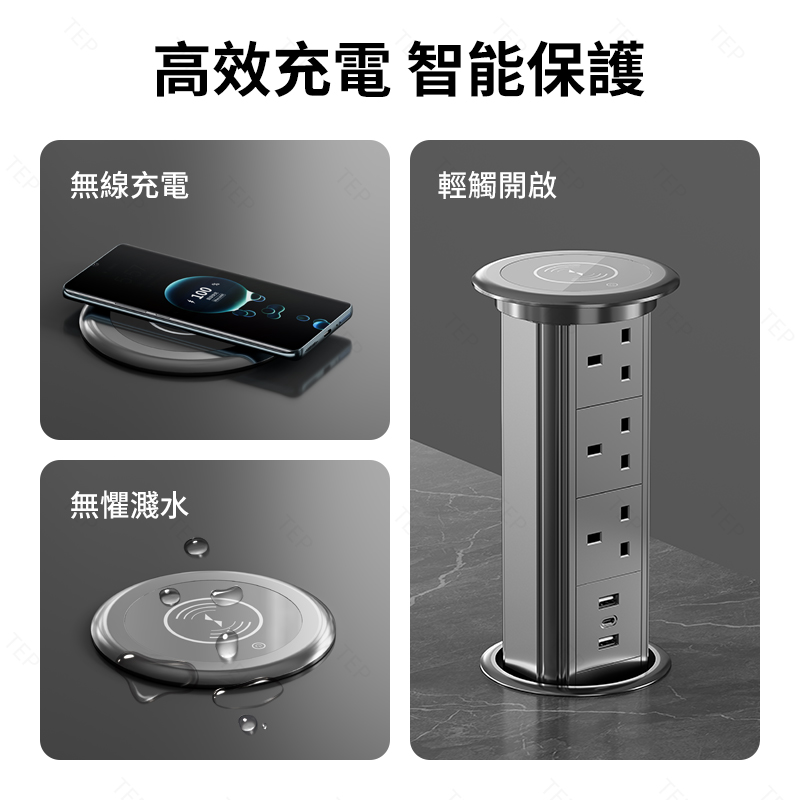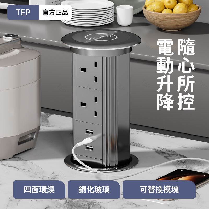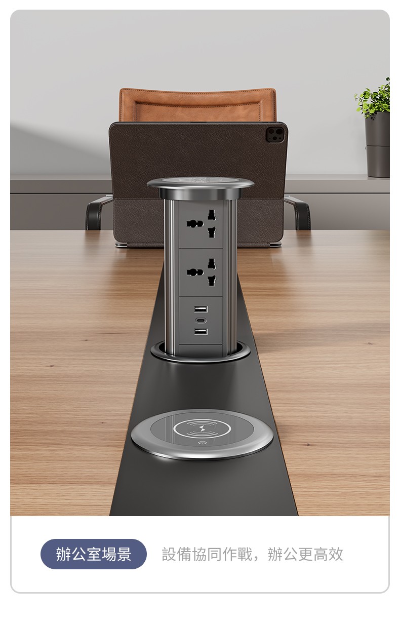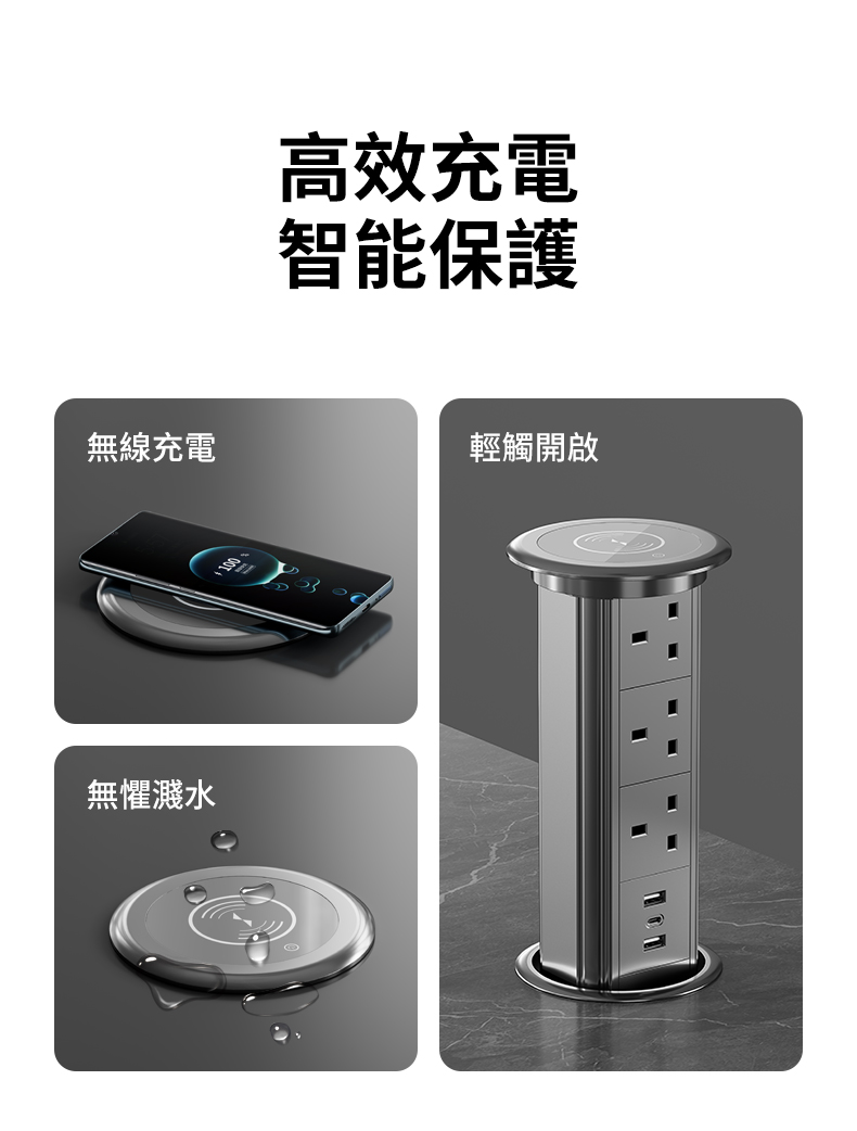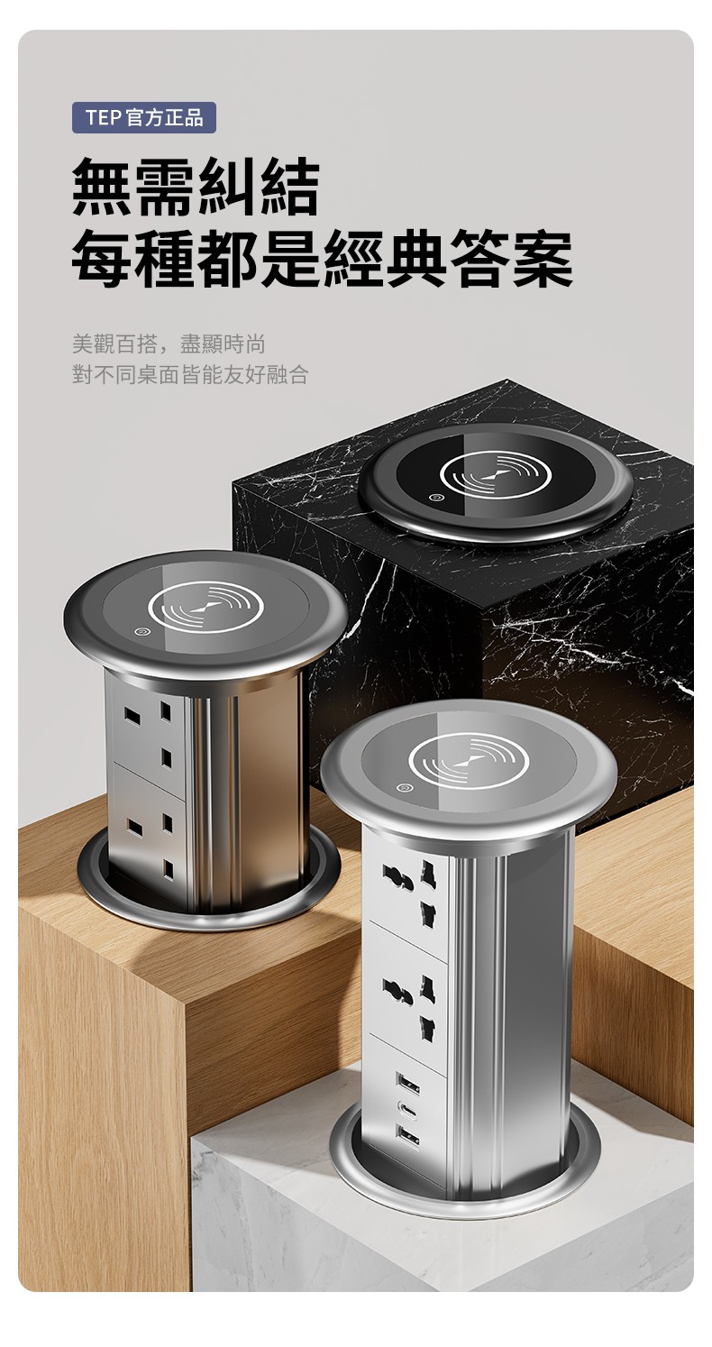 電動升降插座 高效充電智能保護 無線充電 輕觸開啟 無懼濺水 智能升降生活更美好 内置电动控制系统 手指轻触升降随心所控 可選插孔 國標五孔插座 歐式插座 美式三極扁插座 多功能三孔插座 泰式插座 A13方角插座 颜色:黑/灰/银