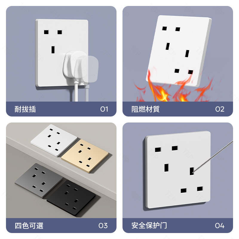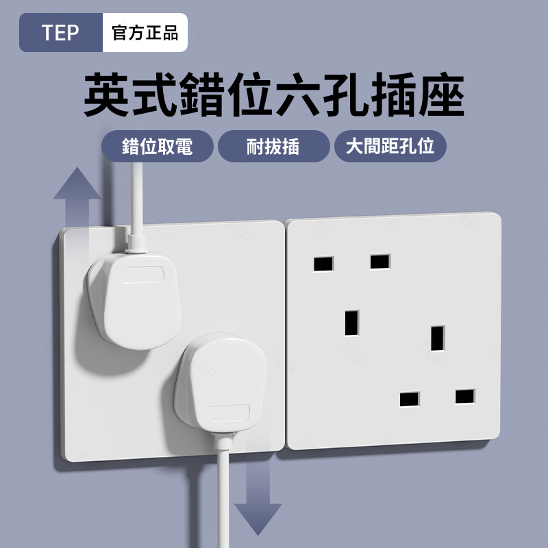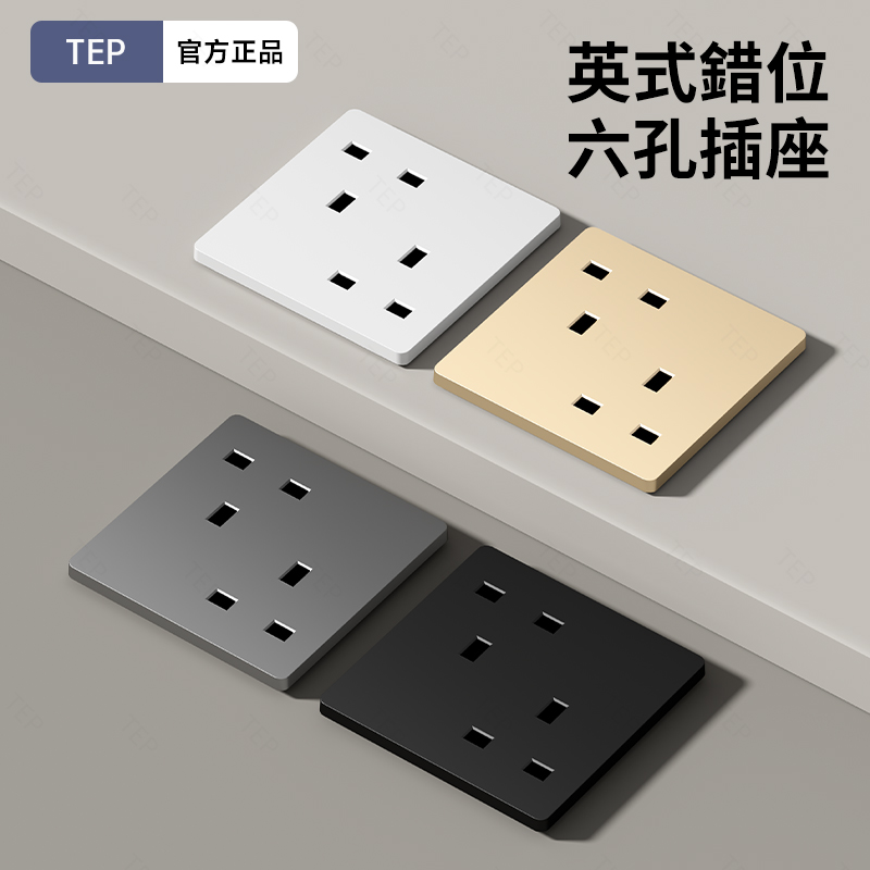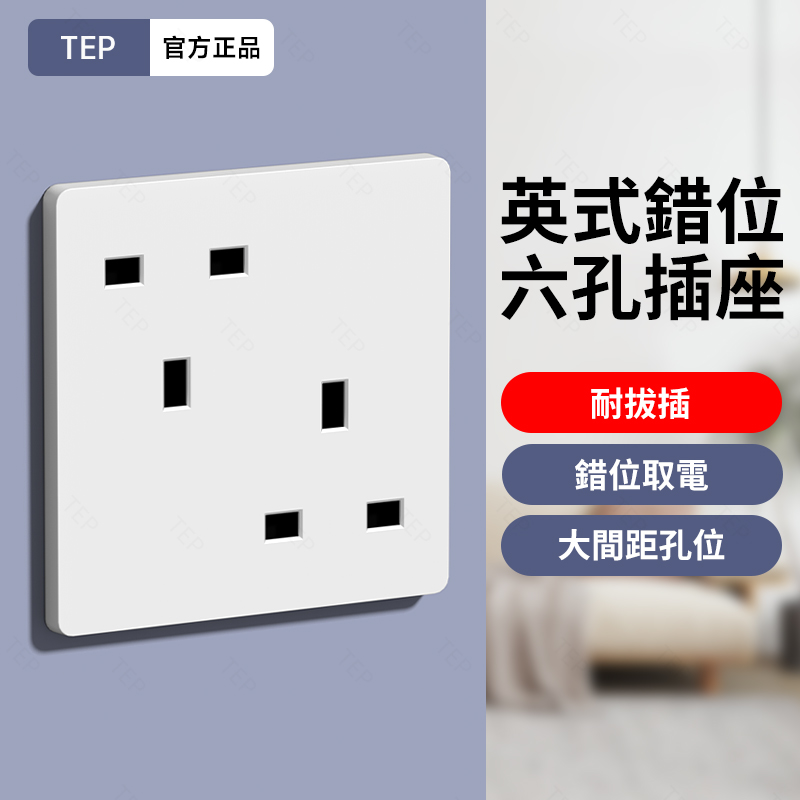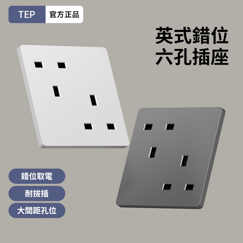 英式錯位六孔插座 耐拔插|錯位取電|大間距孔位 错位六孔插座小細節 更放心 雙向取電 阻燃材质 防誤插設計 耐拔插 四色可選