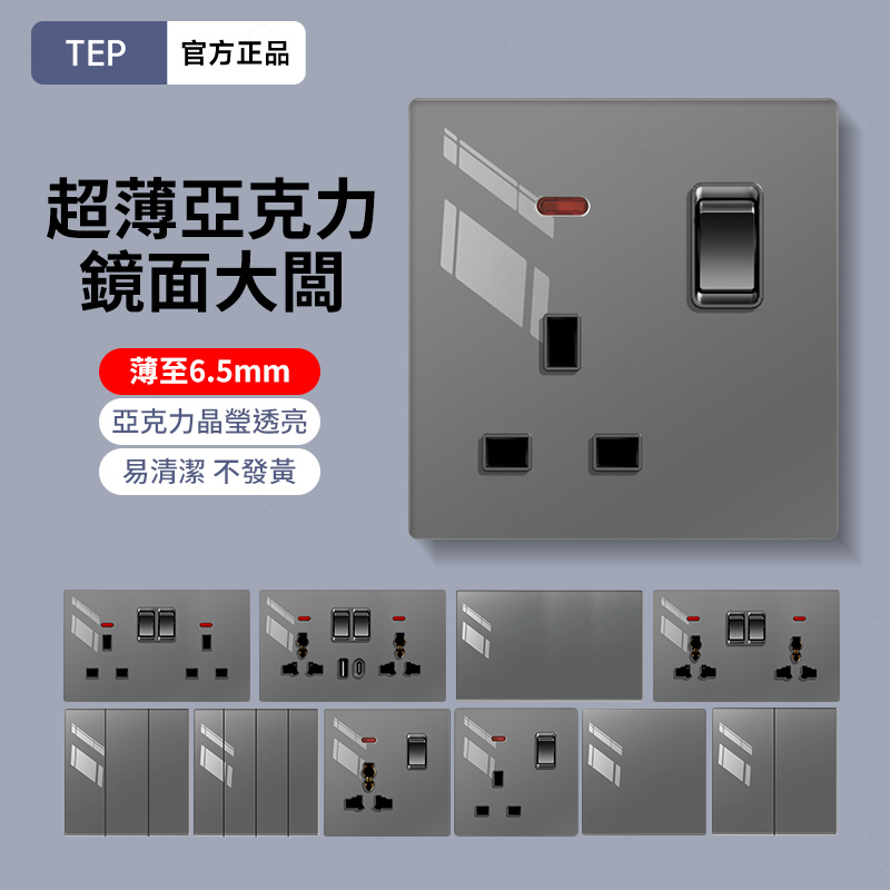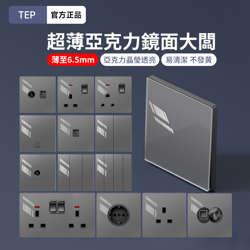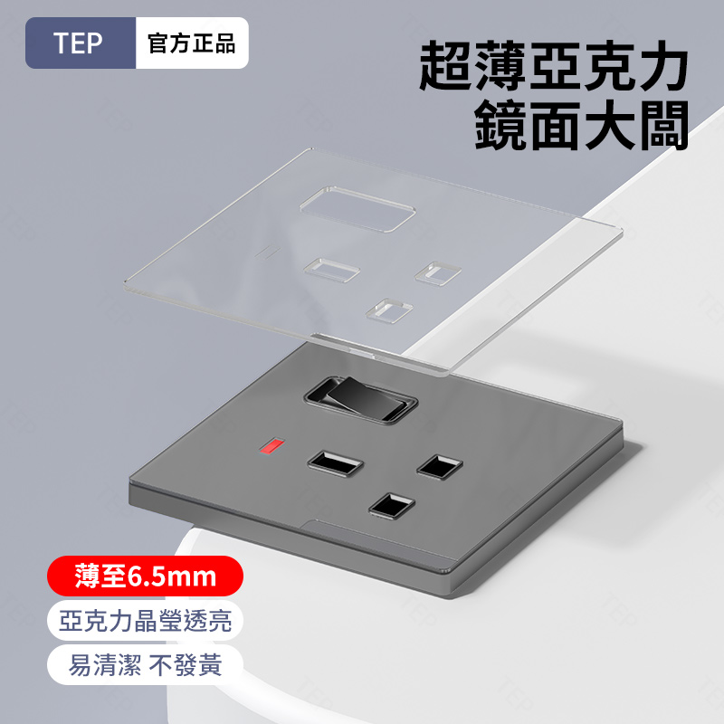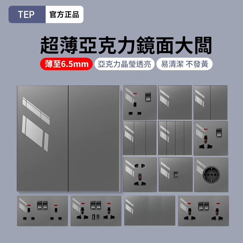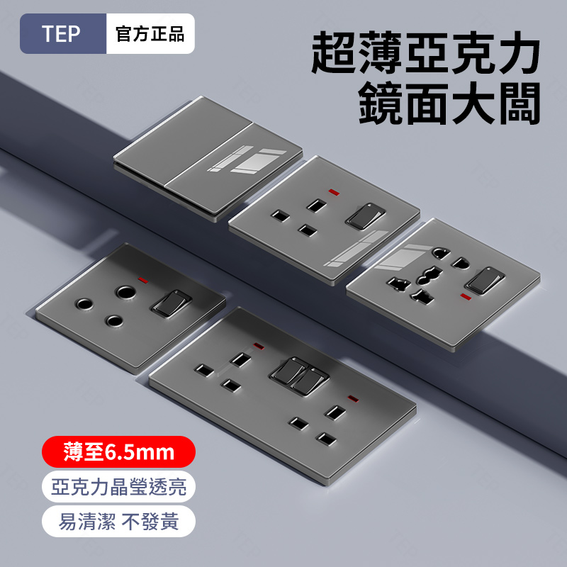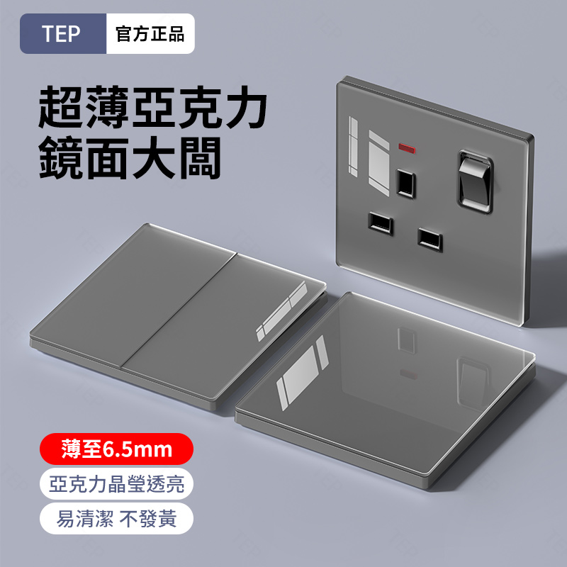 亞克力灰色鏡面大板開關插座 超薄設計 鏡面質感 易清潔 不發黃 超薄亞克力大板小細節 更放心 纖薄外形上牆更輕盈