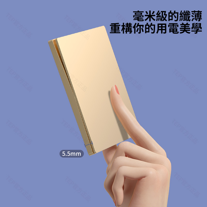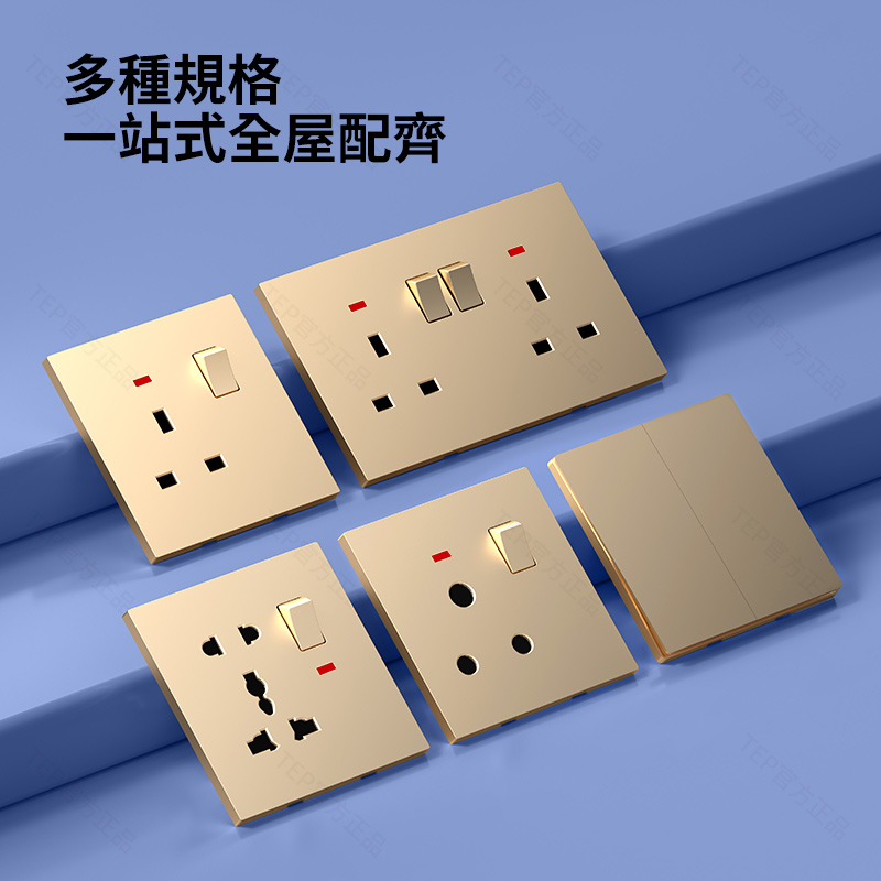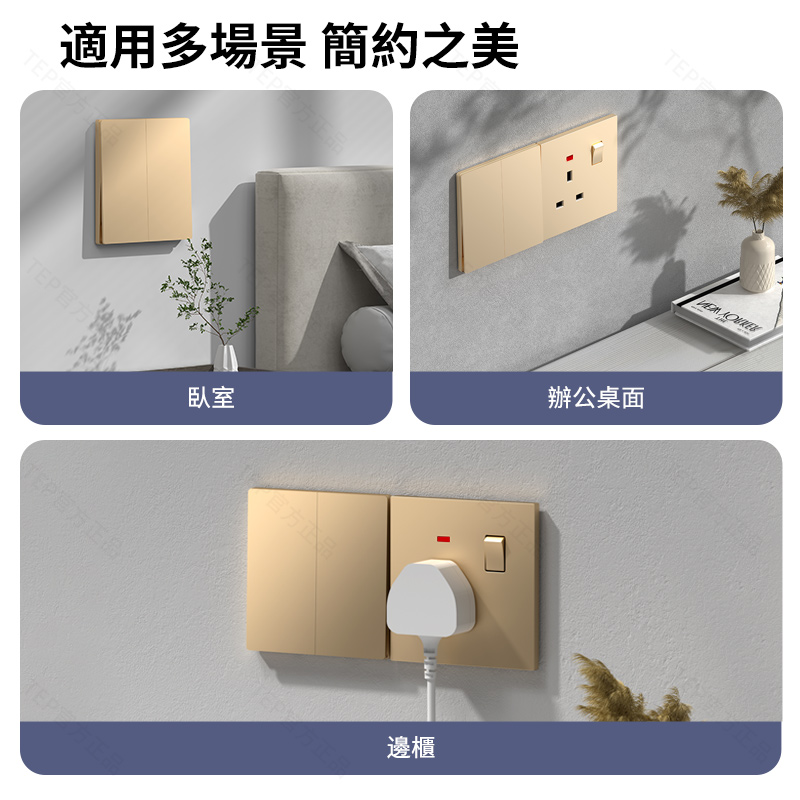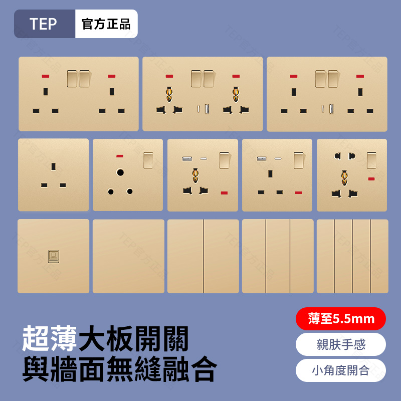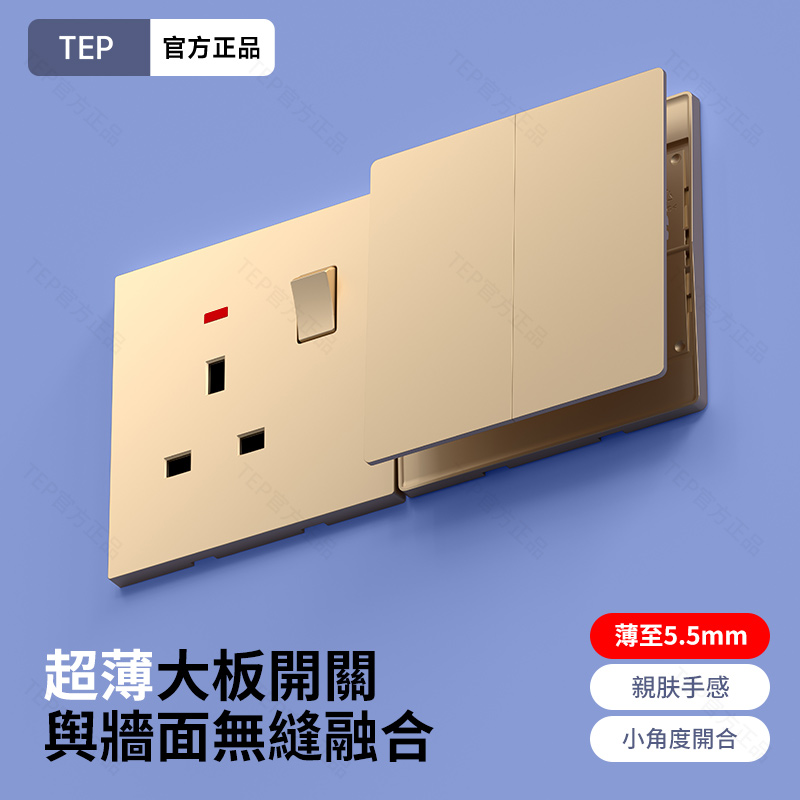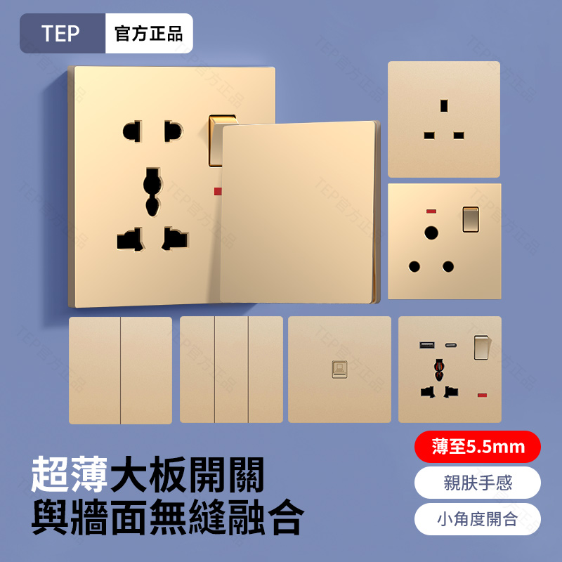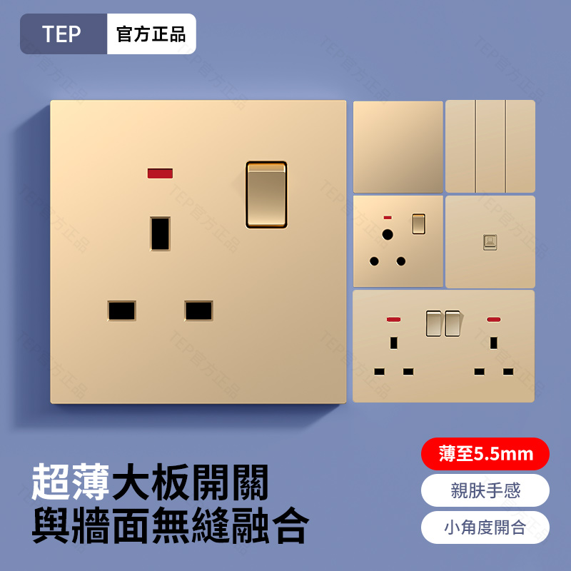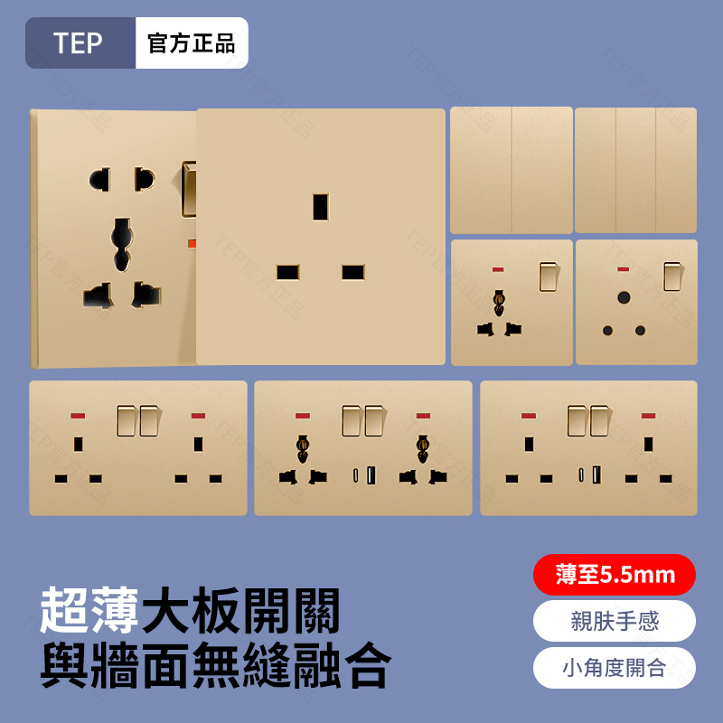 L8 PC超薄膚感英標金色大板開關 超薄大板開關 與牆面無缝融合 超薄大板薄至5.5mm PC阻燃材質 耐拔插設計 一鍵通斷電 親肤手感