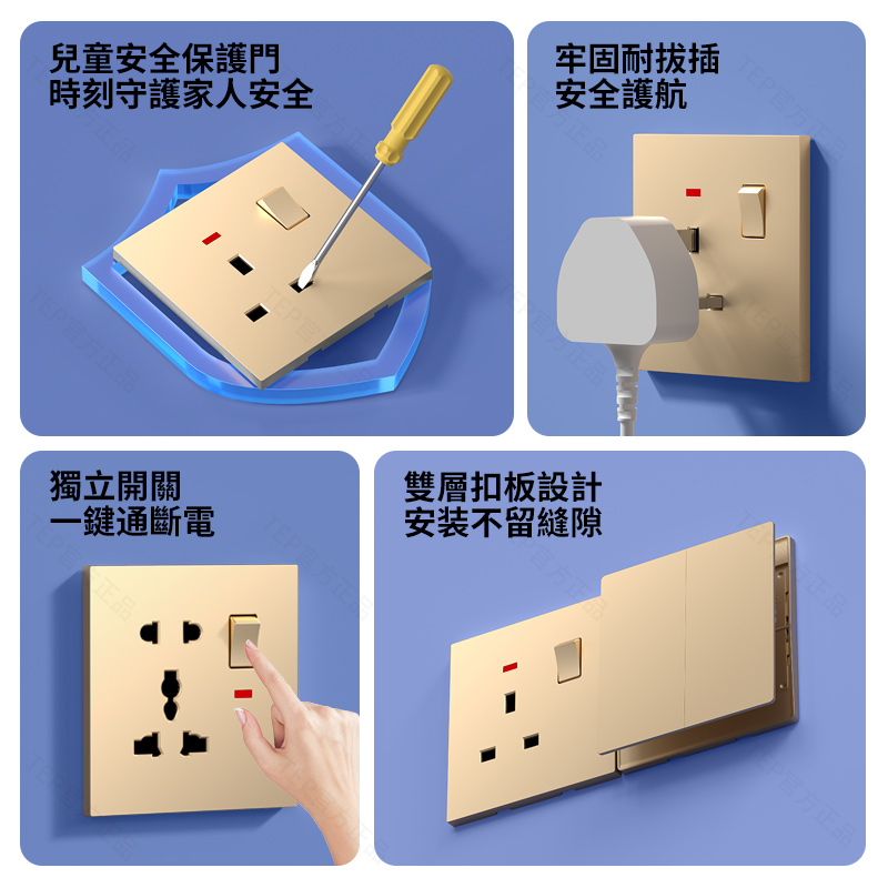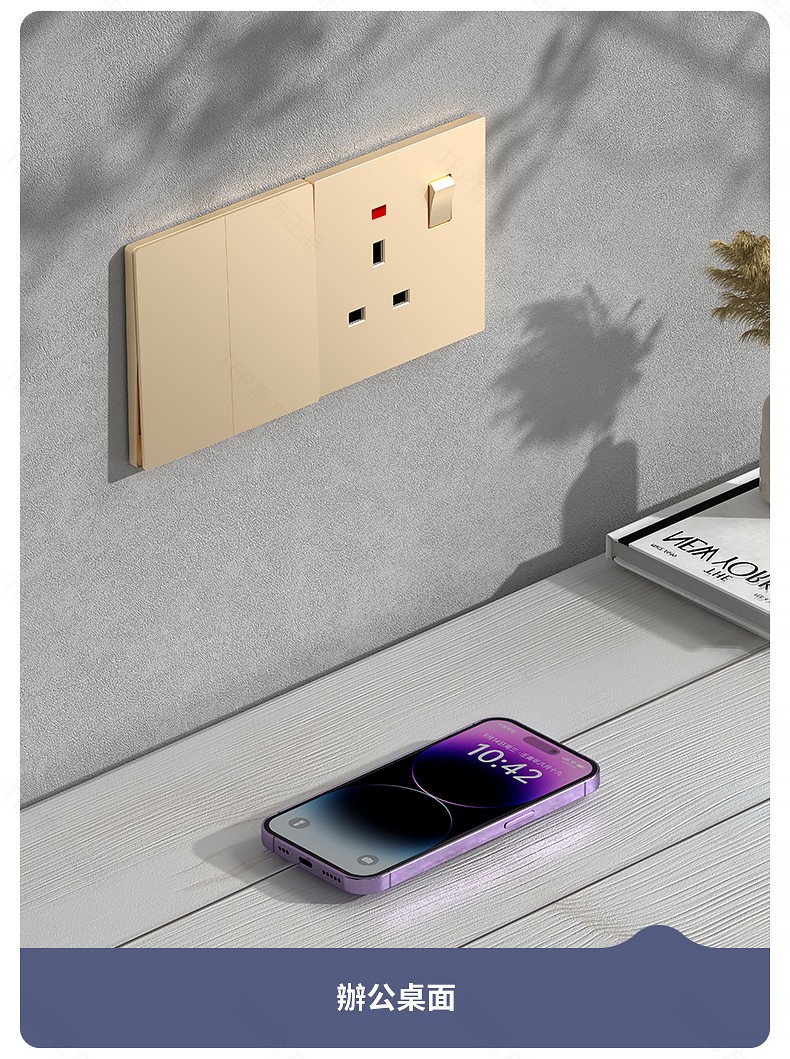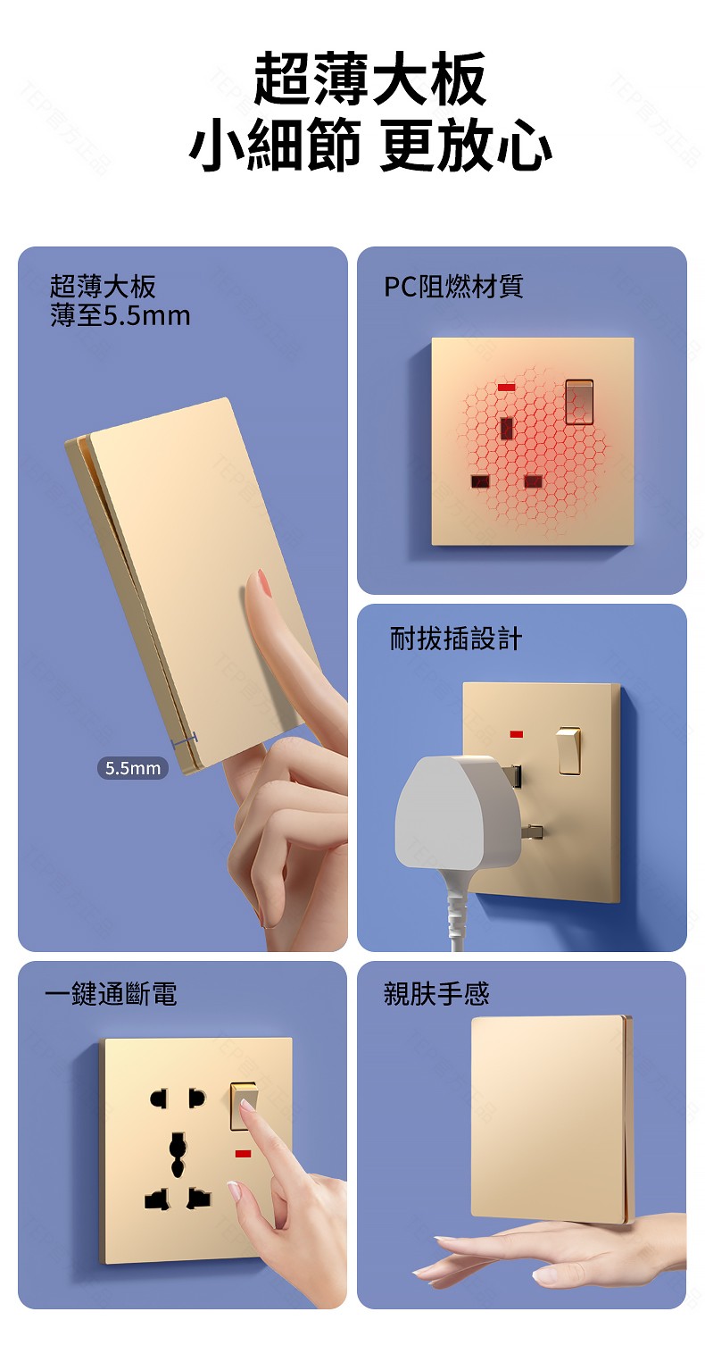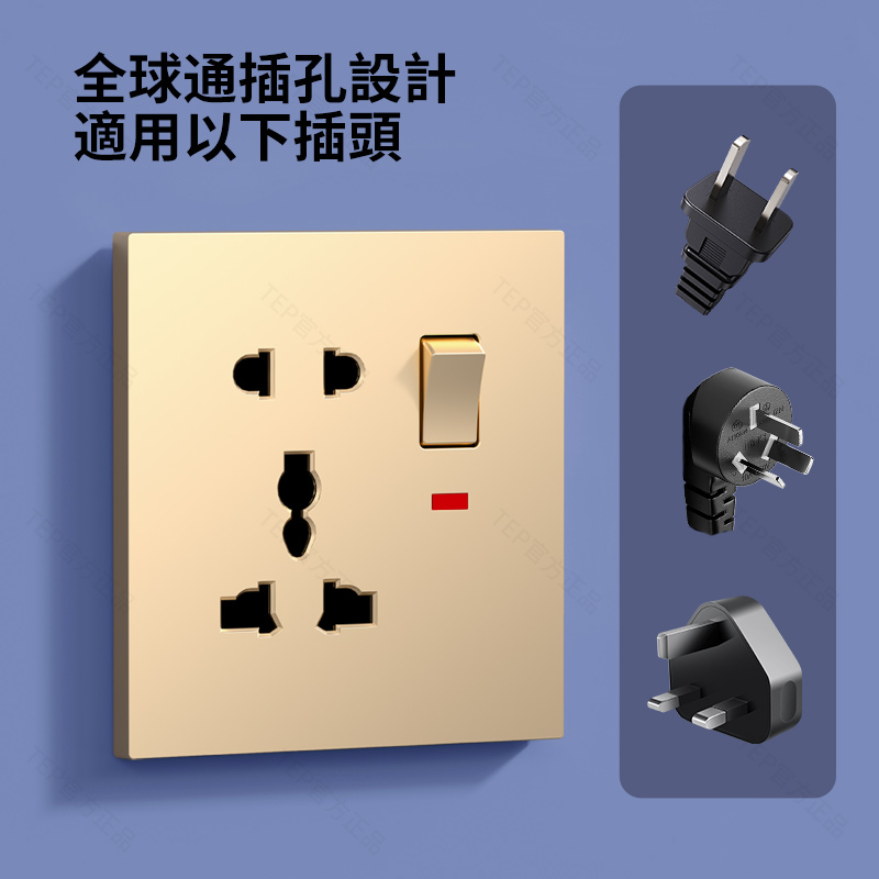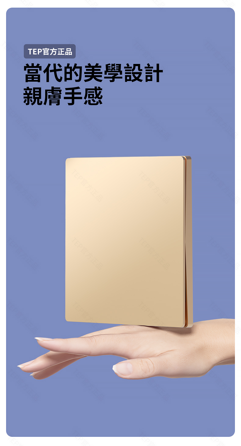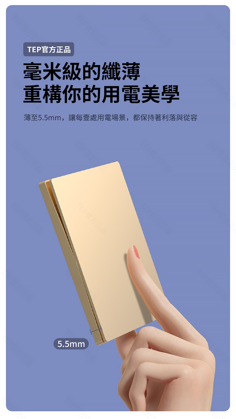 L8 PC超薄膚感英標金色大板開關 超薄大板開關 與牆面無缝融合 超薄大板薄至5.5mm PC阻燃材質 耐拔插設計 一鍵通斷電 親肤手感