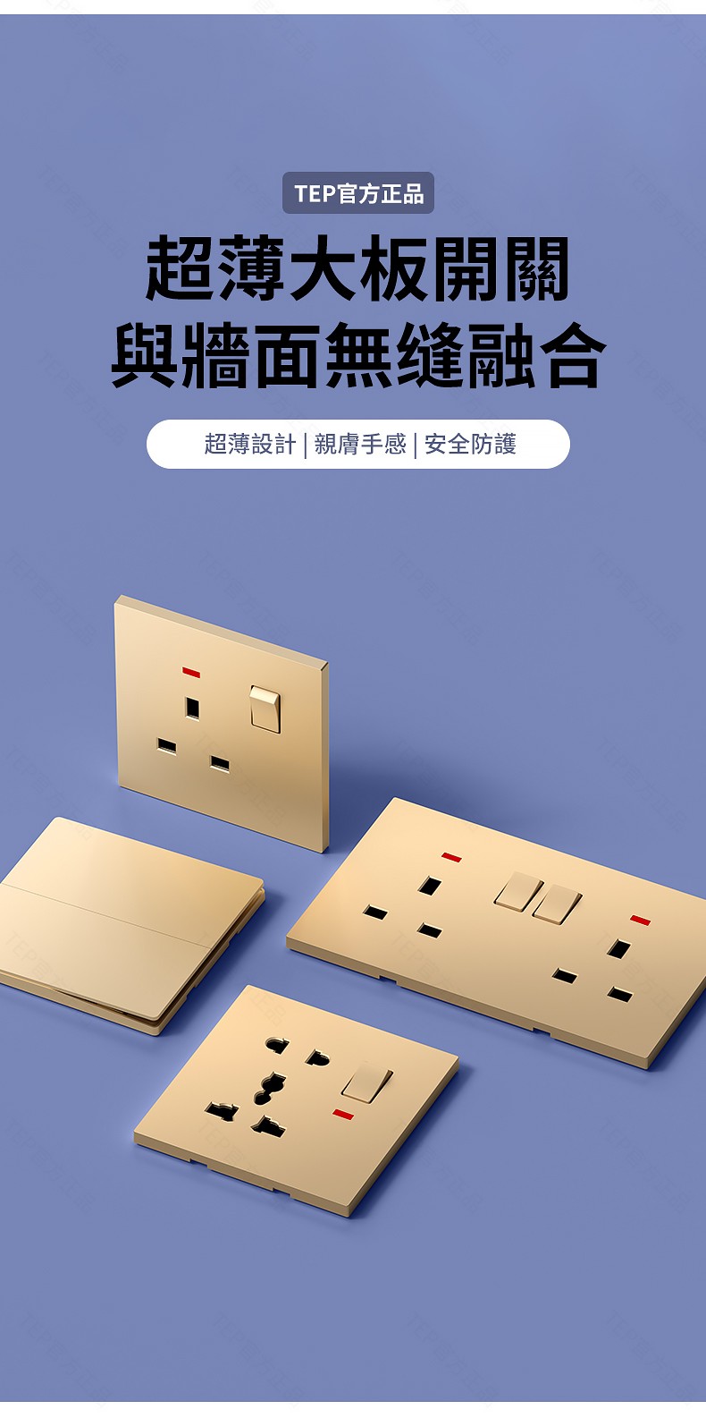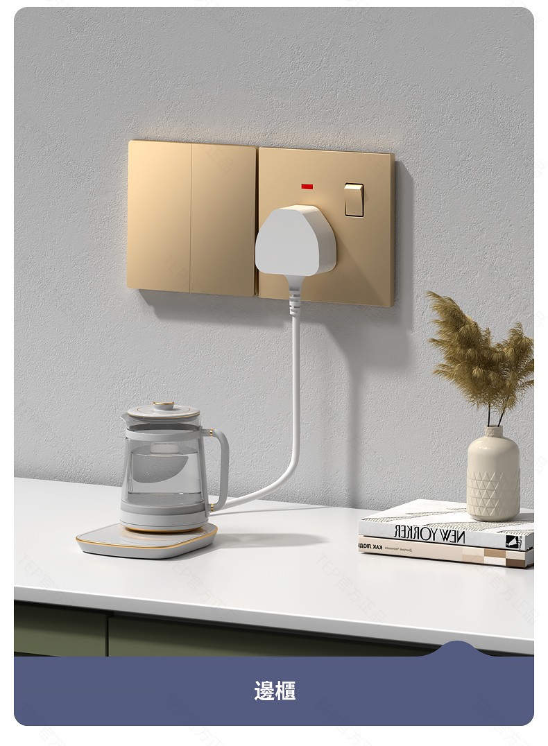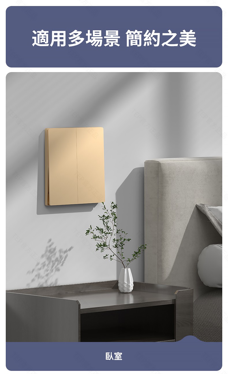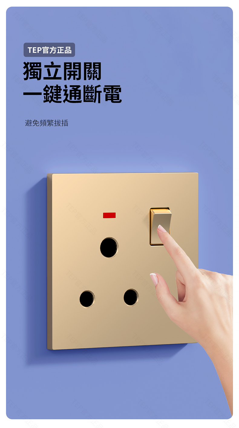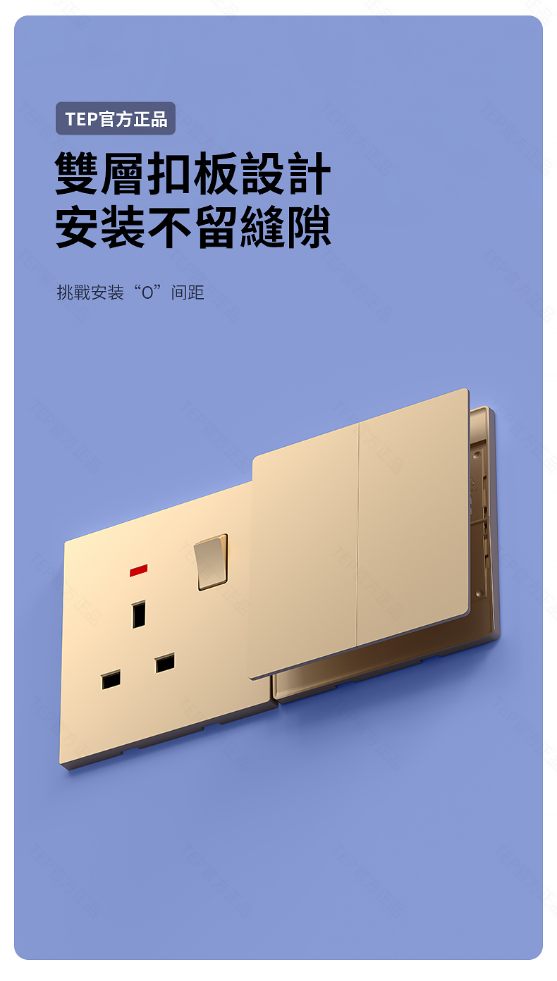 L8 PC超薄膚感英標金色大板開關 超薄大板開關 與牆面無缝融合 超薄大板薄至5.5mm PC阻燃材質 耐拔插設計 一鍵通斷電 親肤手感