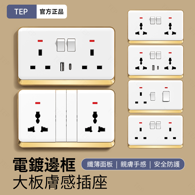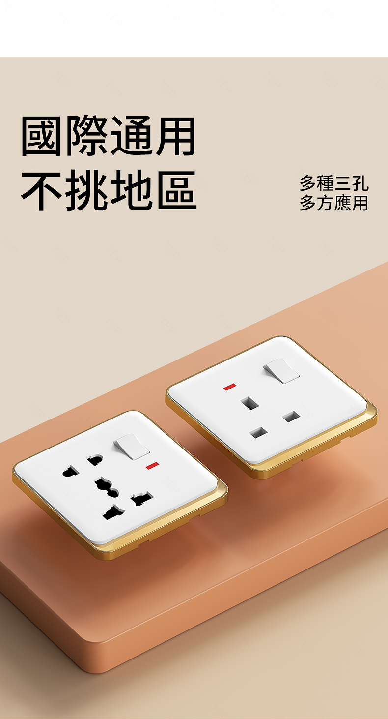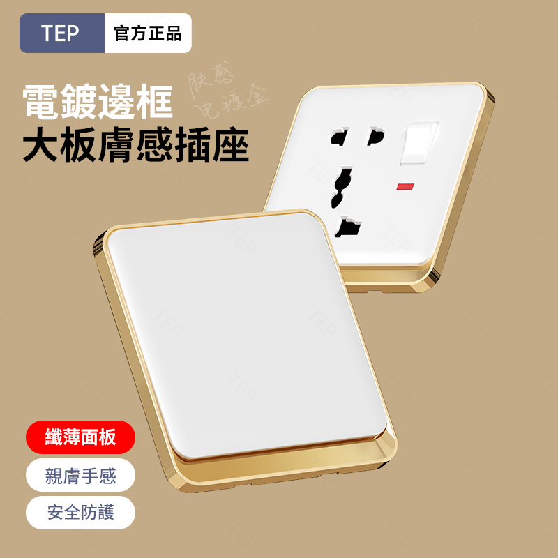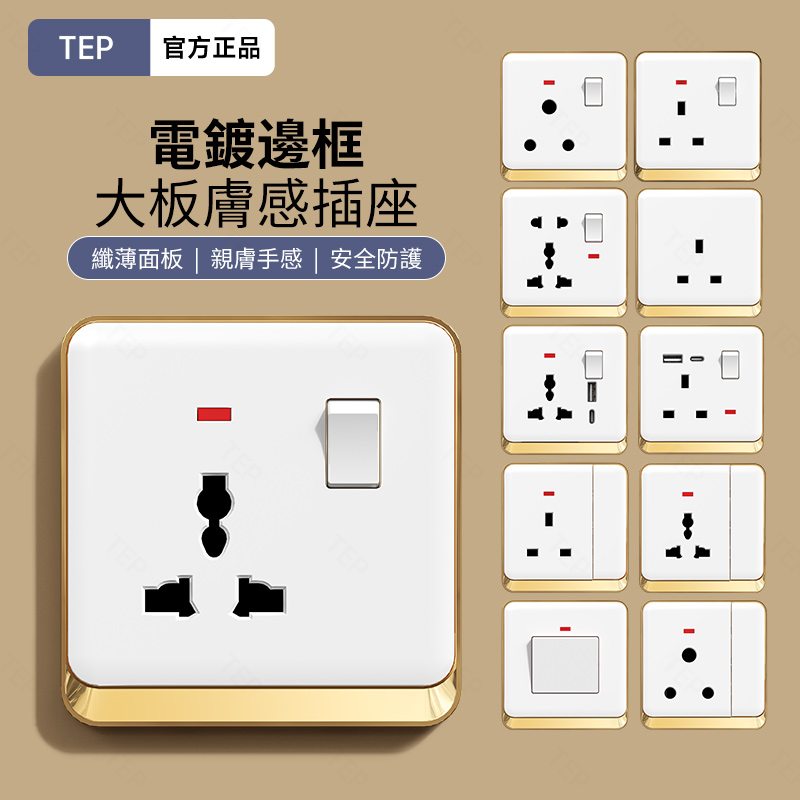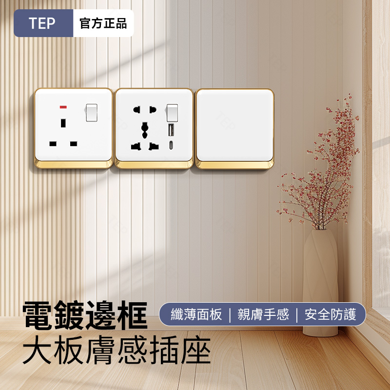 電鍍邊框大板膚感插座 纖薄面板 |親膚手感|安全防護 適配全球不挑“國籍 適配更多兼容廣泛<美標><歐標><澳標><英標> 兒童安全保護門時刻守護家人安全 牢固耐拔插安全護航 獨立開關一鍵通斷電 阻燃耐高溫全方位守護用電安全