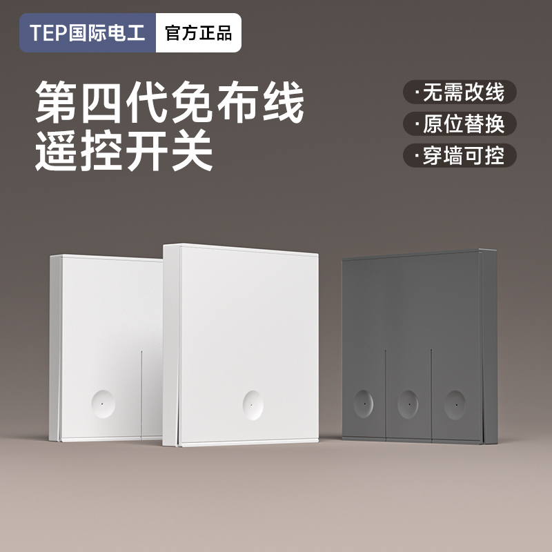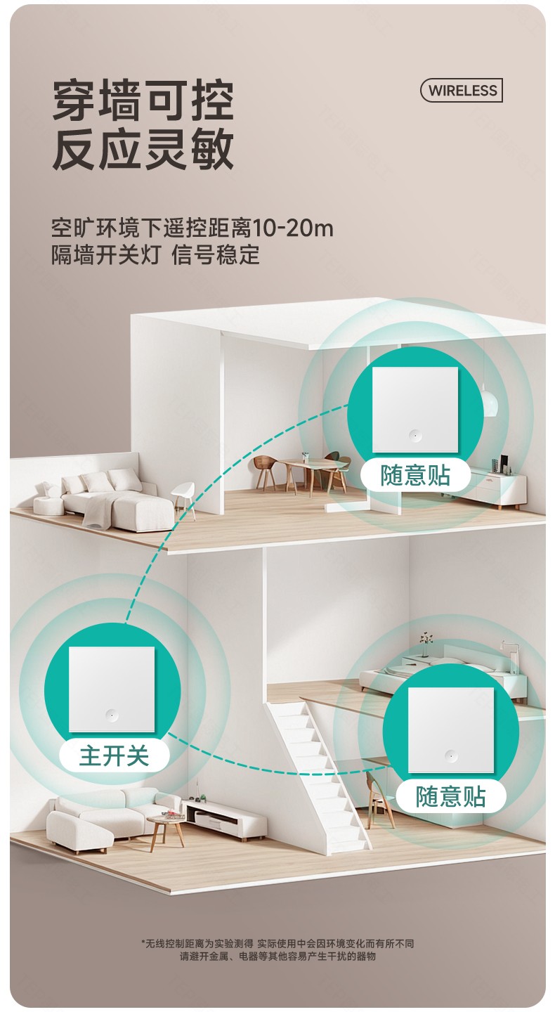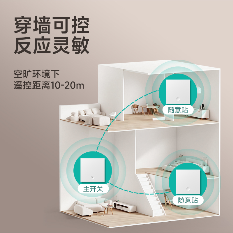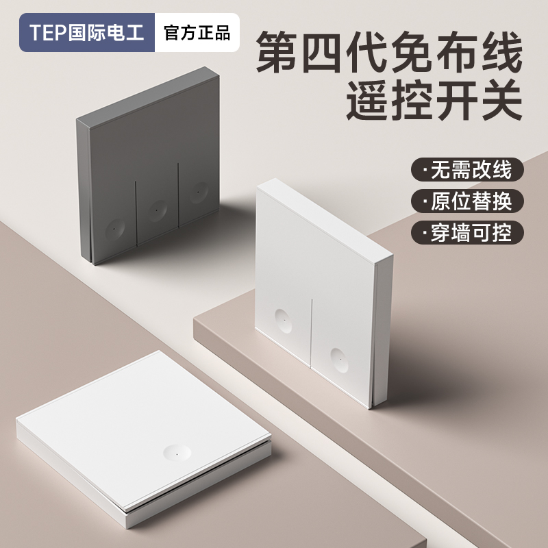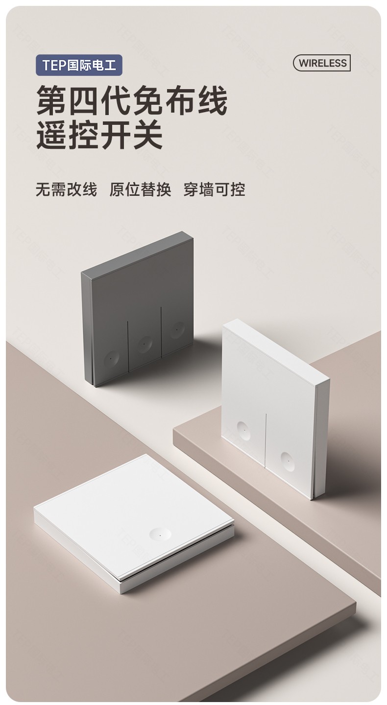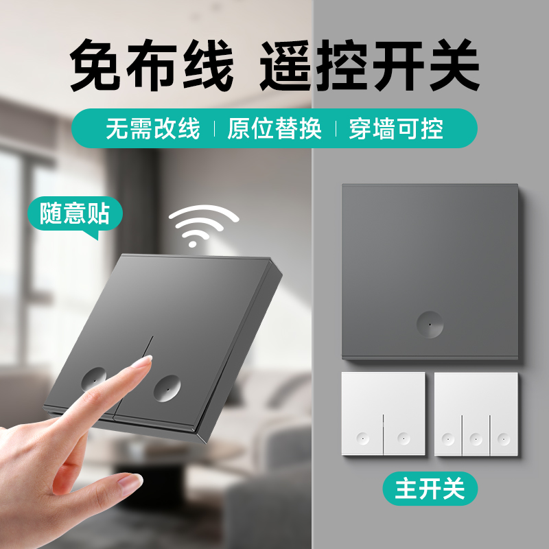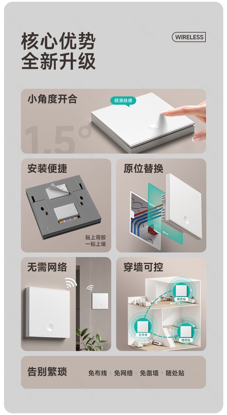 第四代免布线遥控开关 核心优势全新升级 无需改线 原位替换 穿墙可控 小角度开合 安装便捷 顺滑肤感 原位替换 贴上背胶 一粘上墙 无需网络 穿墙可控