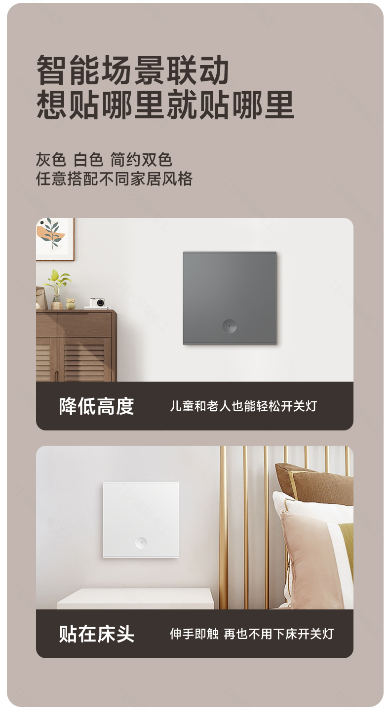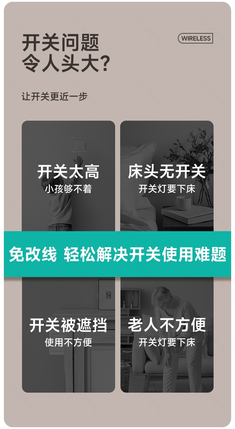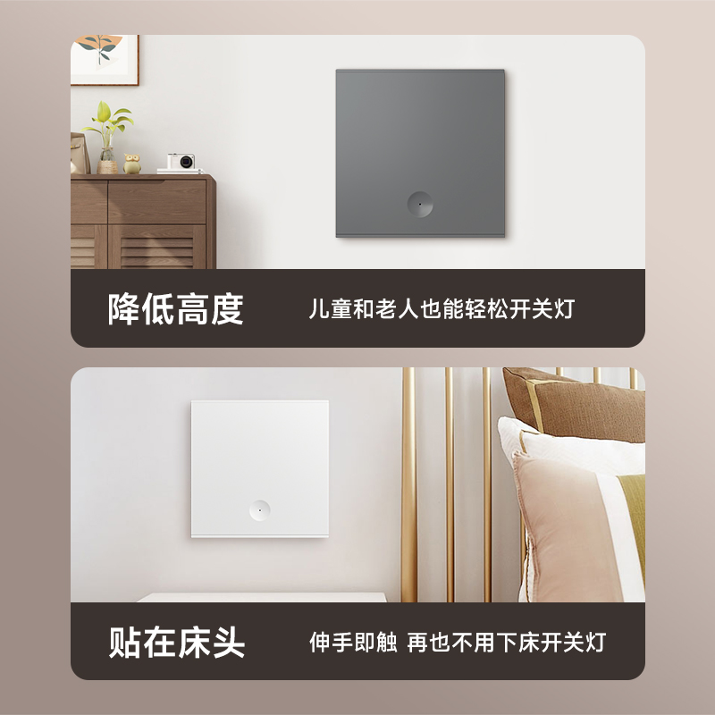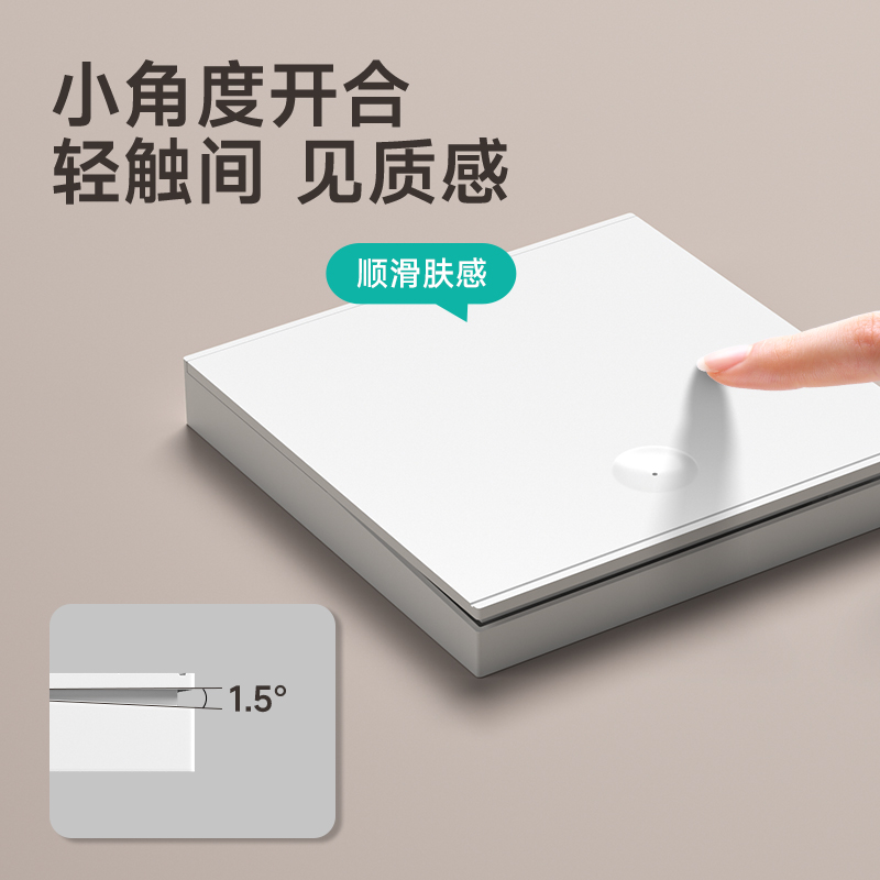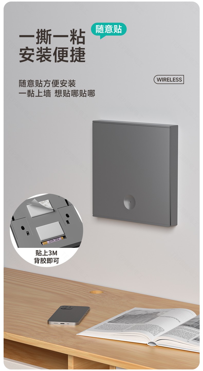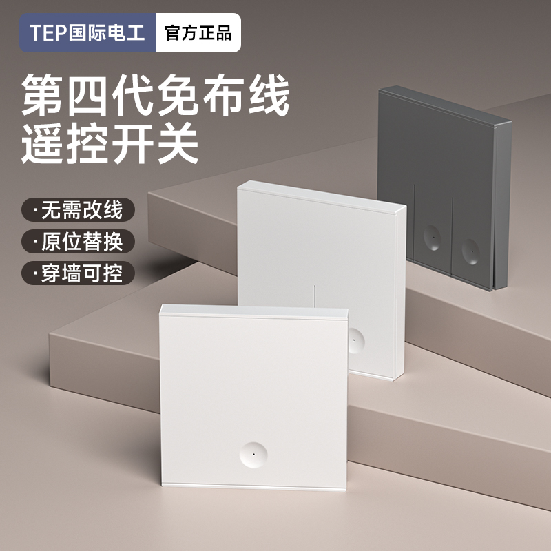 第四代免布线遥控开关 核心优势全新升级 无需改线 原位替换 穿墙可控 小角度开合 安装便捷 顺滑肤感 原位替换 贴上背胶 一粘上墙 无需网络 穿墙可控