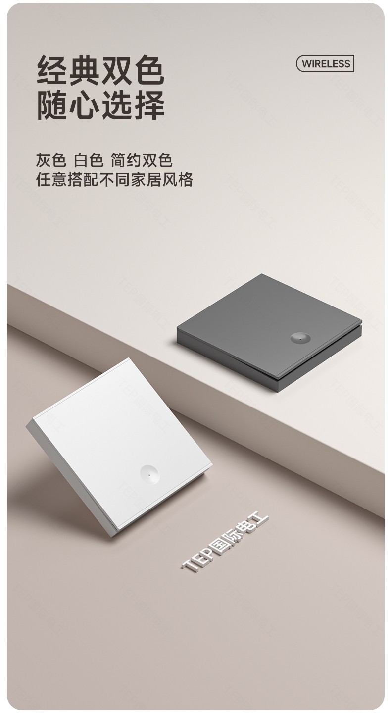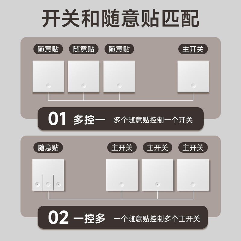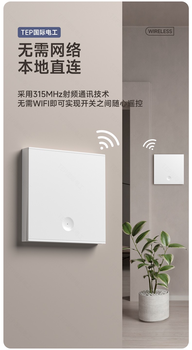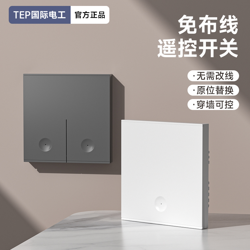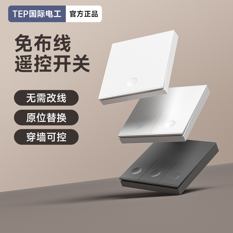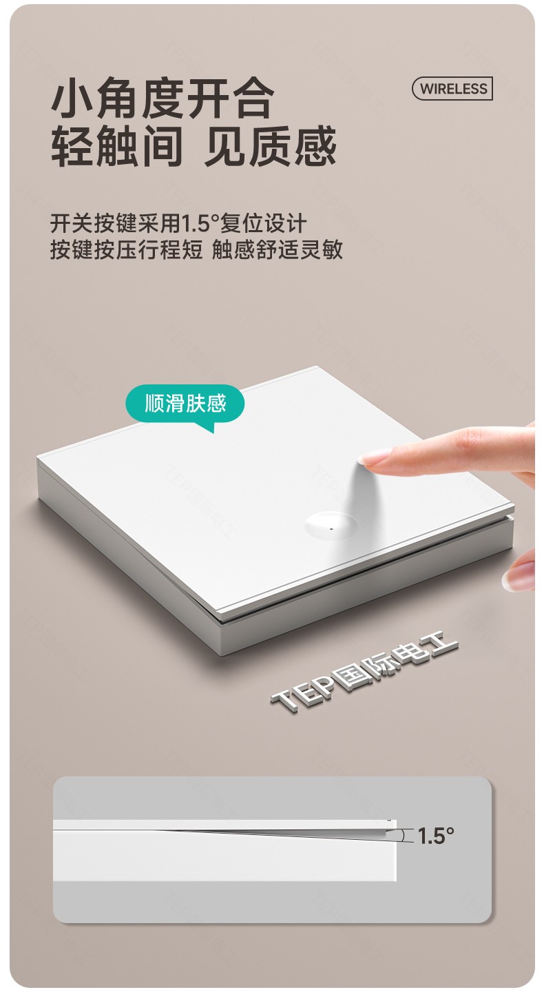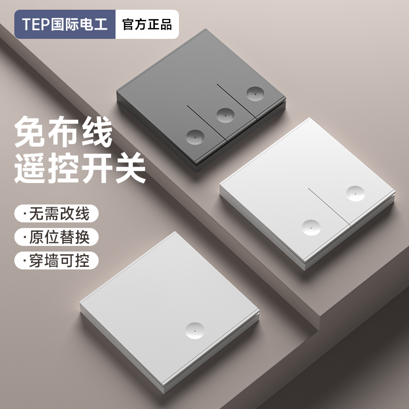 第四代免布线遥控开关 核心优势全新升级 无需改线 原位替换 穿墙可控 小角度开合 安装便捷 顺滑肤感 原位替换 贴上背胶 一粘上墙 无需网络 穿墙可控