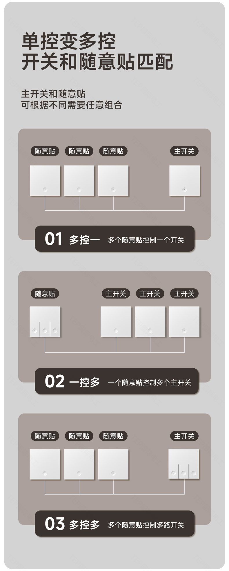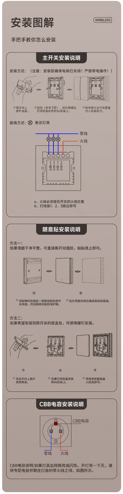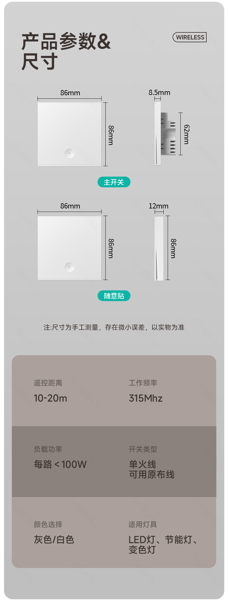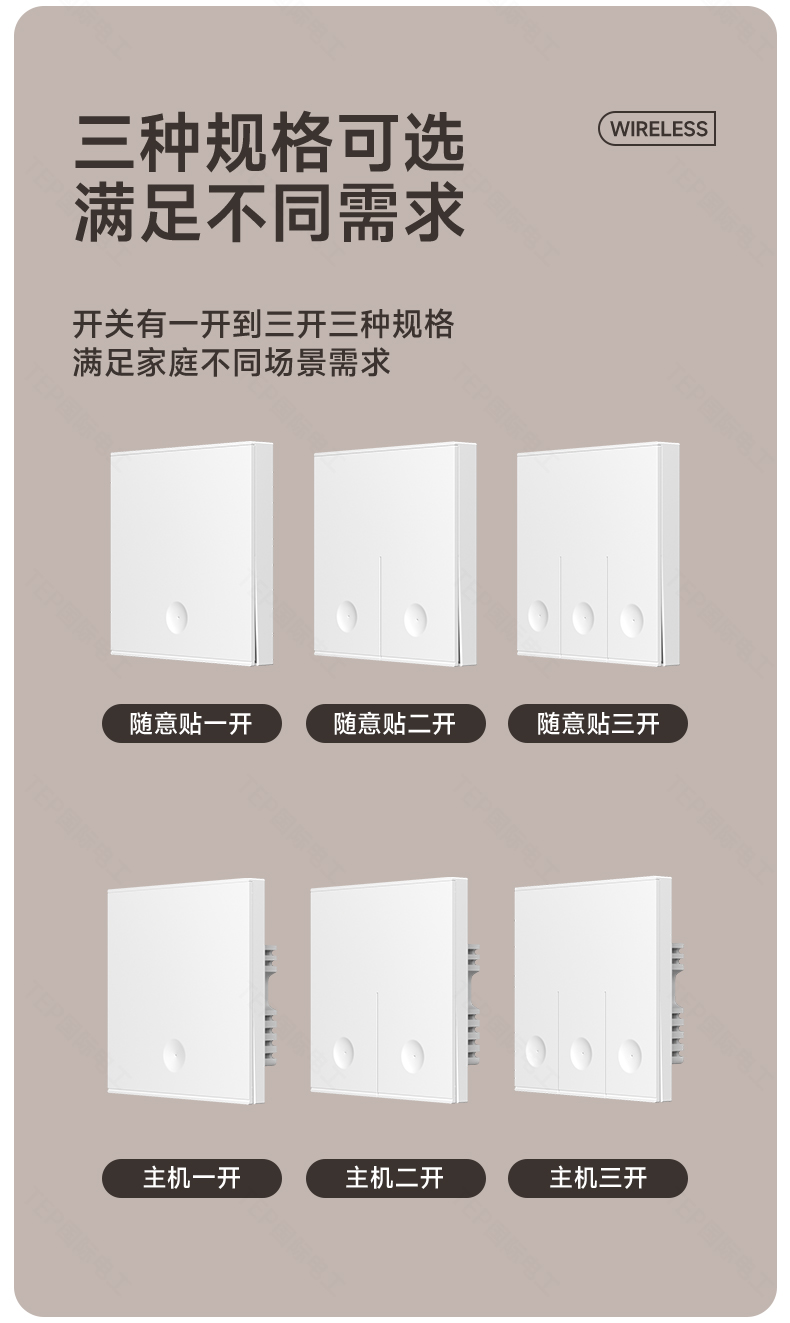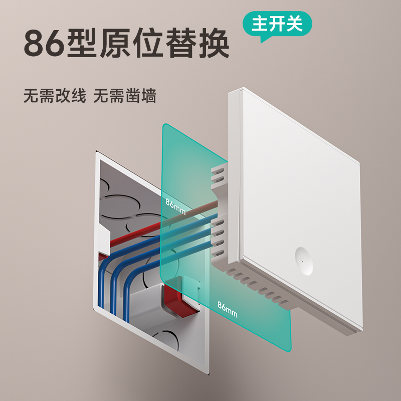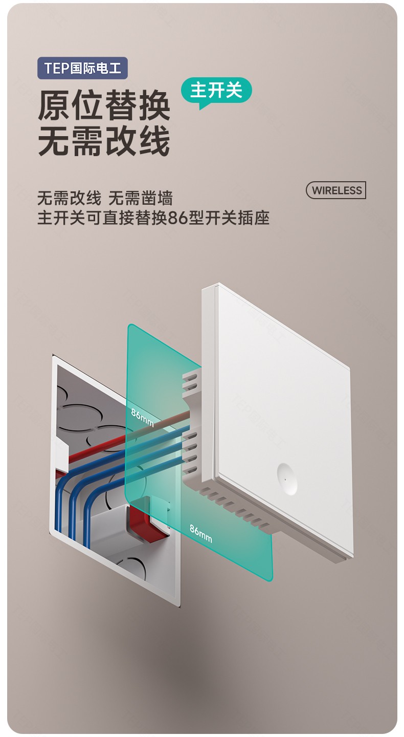 第四代免布线遥控开关 核心优势全新升级 无需改线 原位替换 穿墙可控 小角度开合 安装便捷 顺滑肤感 原位替换 贴上背胶 一粘上墙 无需网络 穿墙可控
